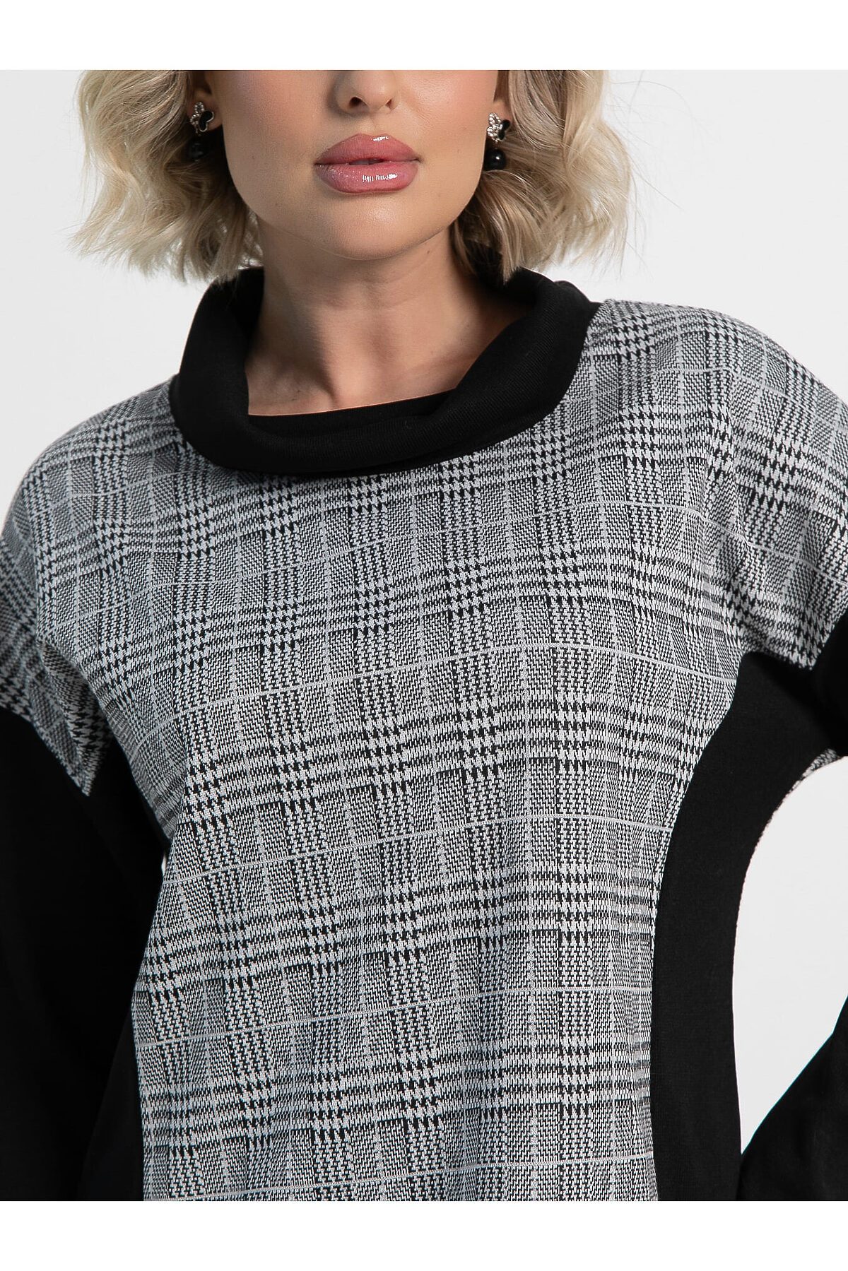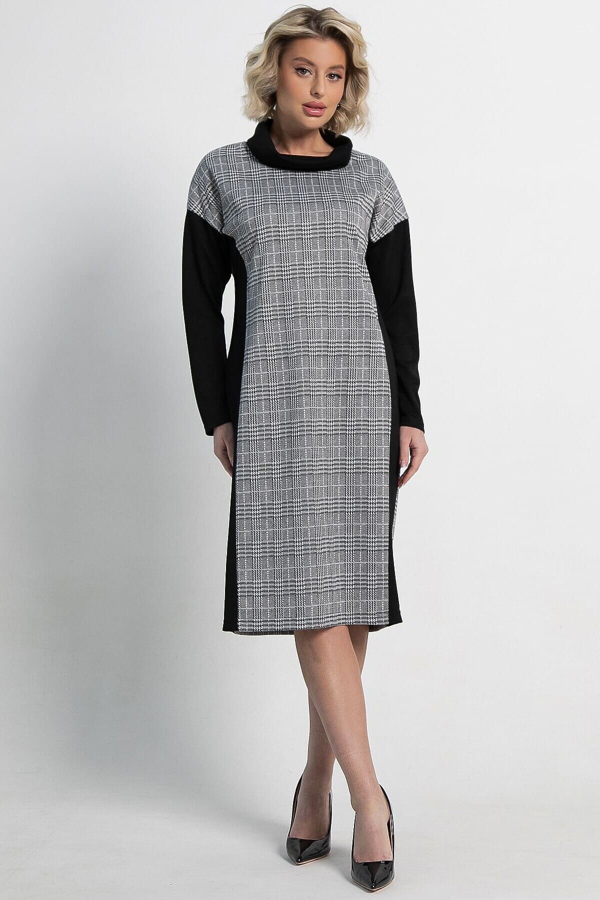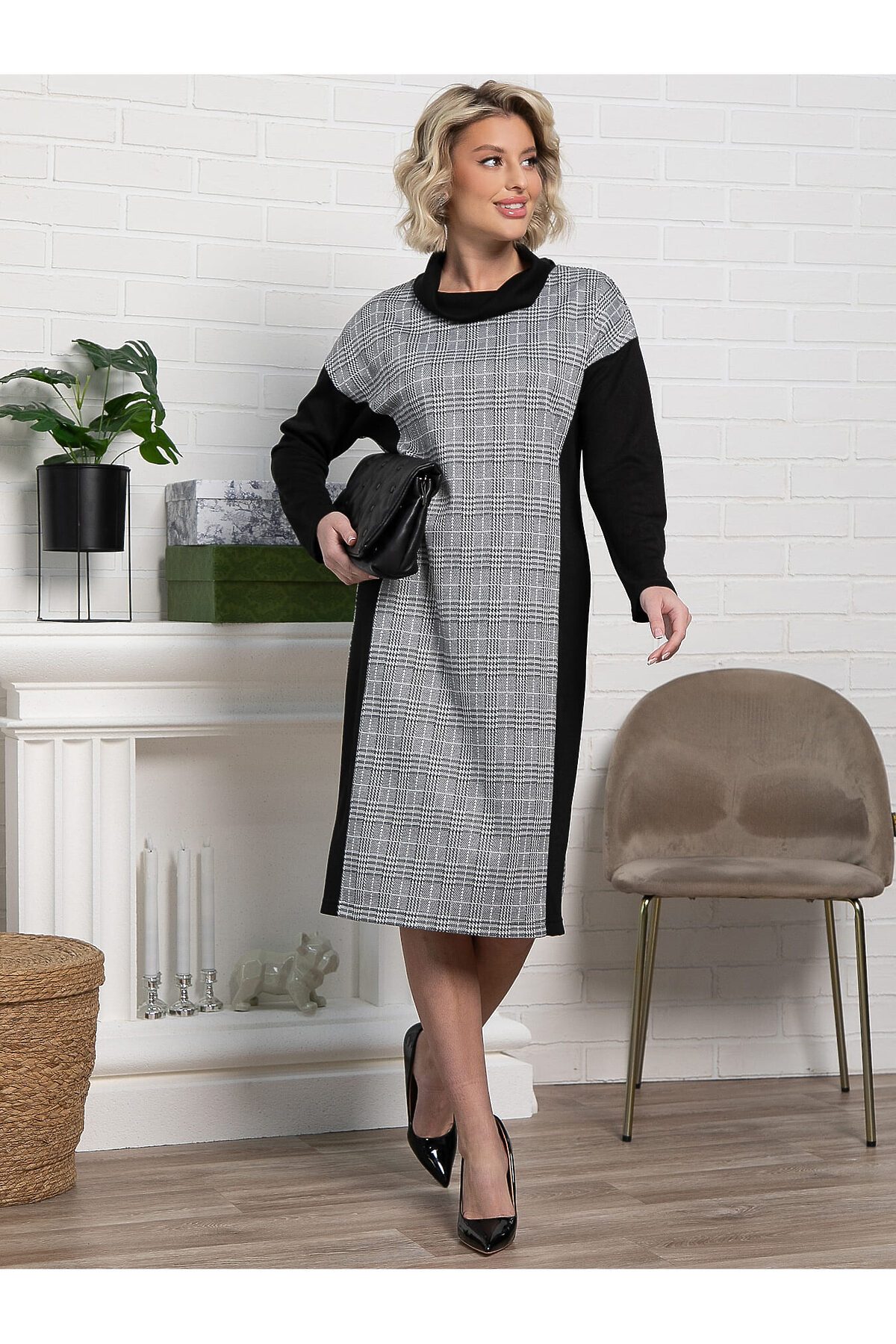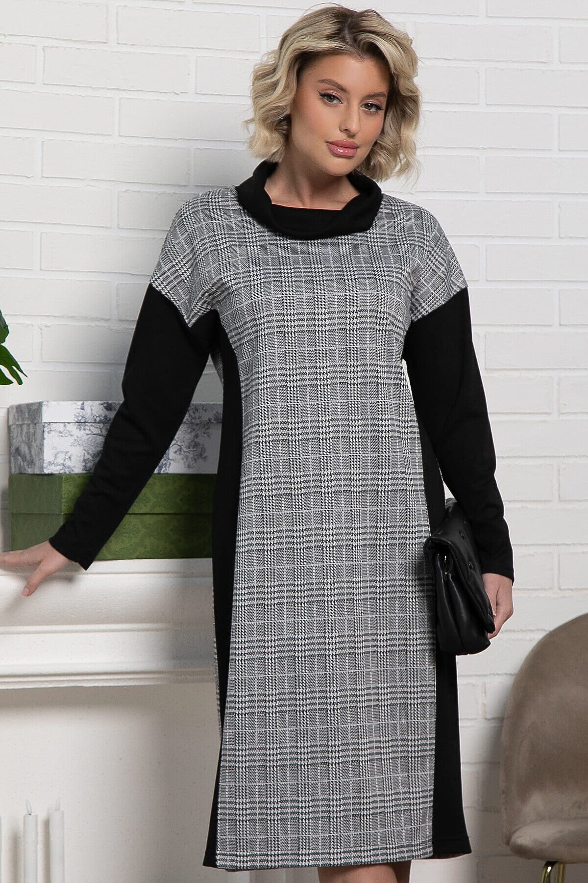 Стильное платье прямого кроя средней длины идеально подойдет для тех, кто ценит комфорт и элегантность. Контрастные черные вставки по бокам визуально стройнят и вытягивают силуэт, а воротник-хомут и длинные рукава из ткани компаньона красиво сочетаются с принтом основного трикотажа. Модель обладает спущенным плечом, что делает ее особенно удобной и комфортной в носке.