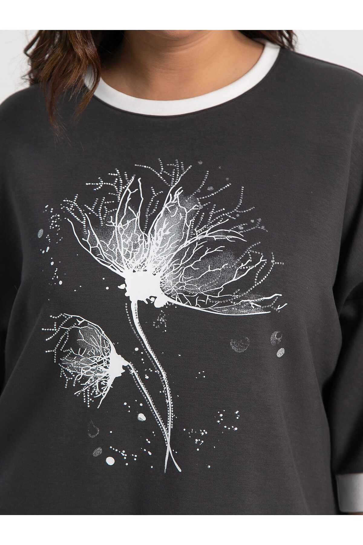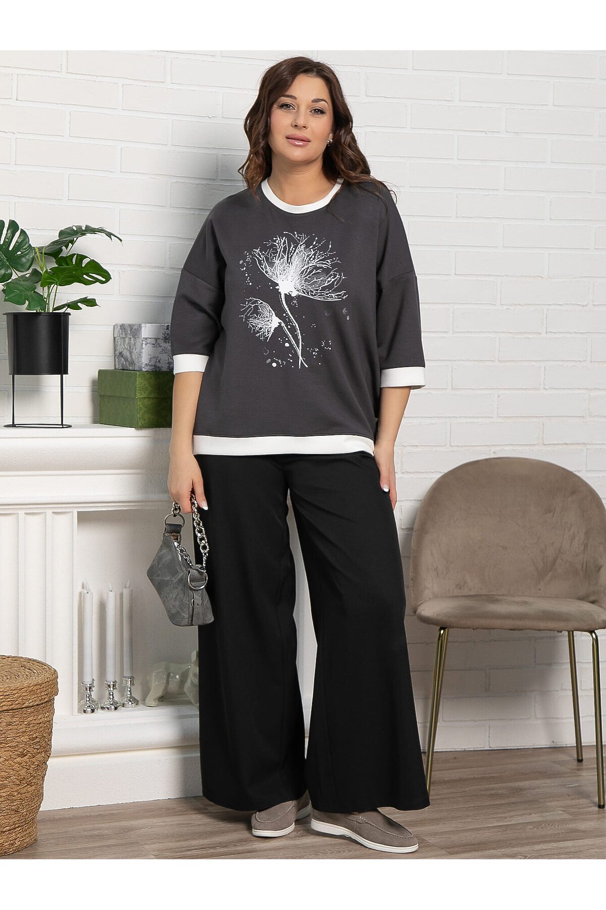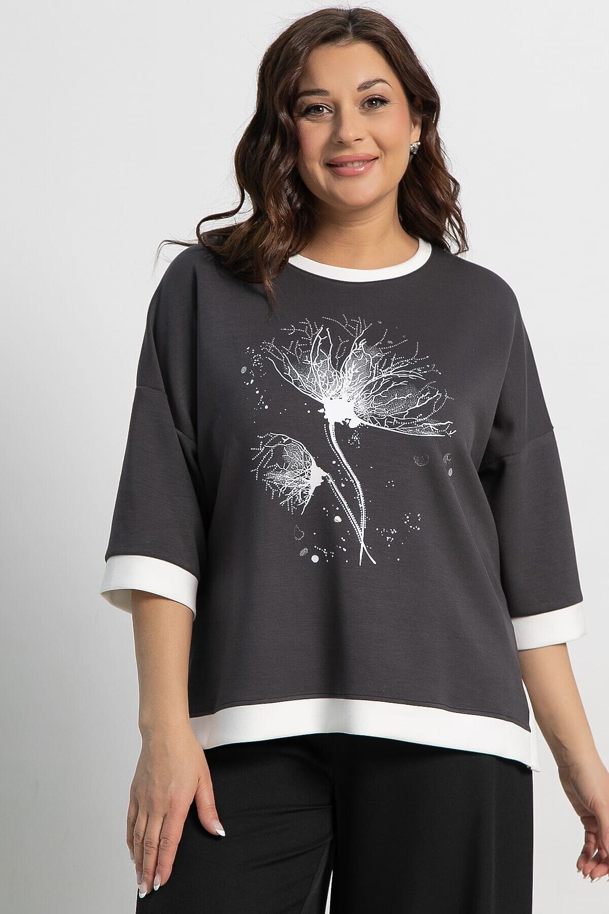 Создайте эффектный и современный образ с этой изысканной блузкой. Ее особенность заключается в уникальной комбинации элементов декора и удобной посадке. Стильная блузка со спущенным плечом и рукавом длиной 3/4. Боковые разрезы обеспечивают удобство движения и делают образ воздушным и динамичным. Белая отделка низа изделия, края рукавов и горловины придает изделию свежесть и оригинальность. Украшена выразительной печатью и стразами, что делает образ более ярким и привлекательным.