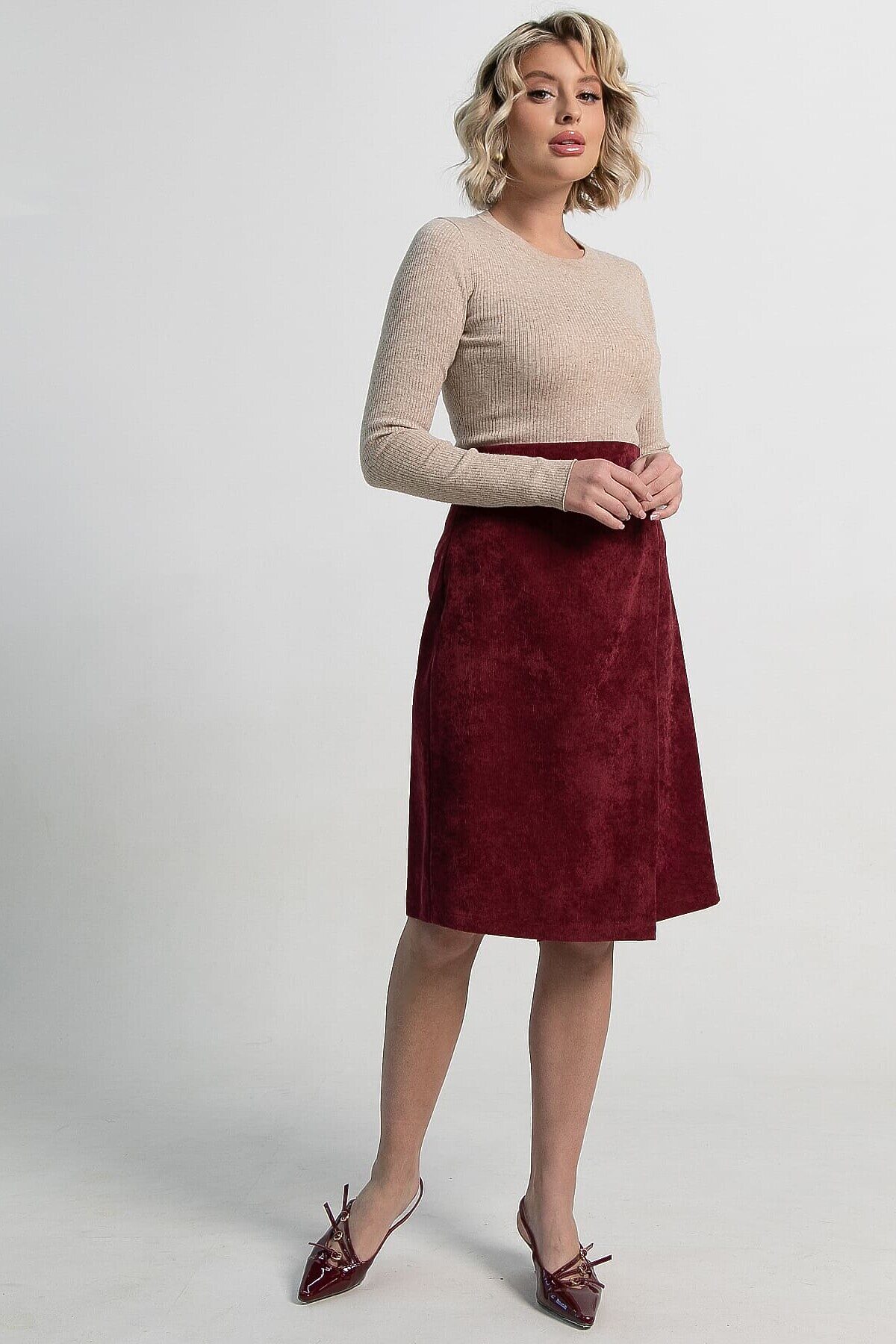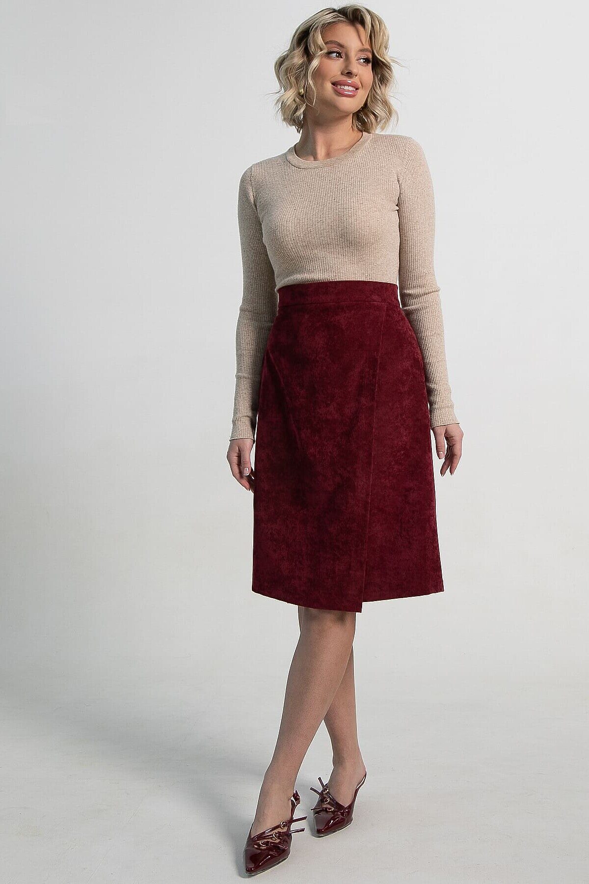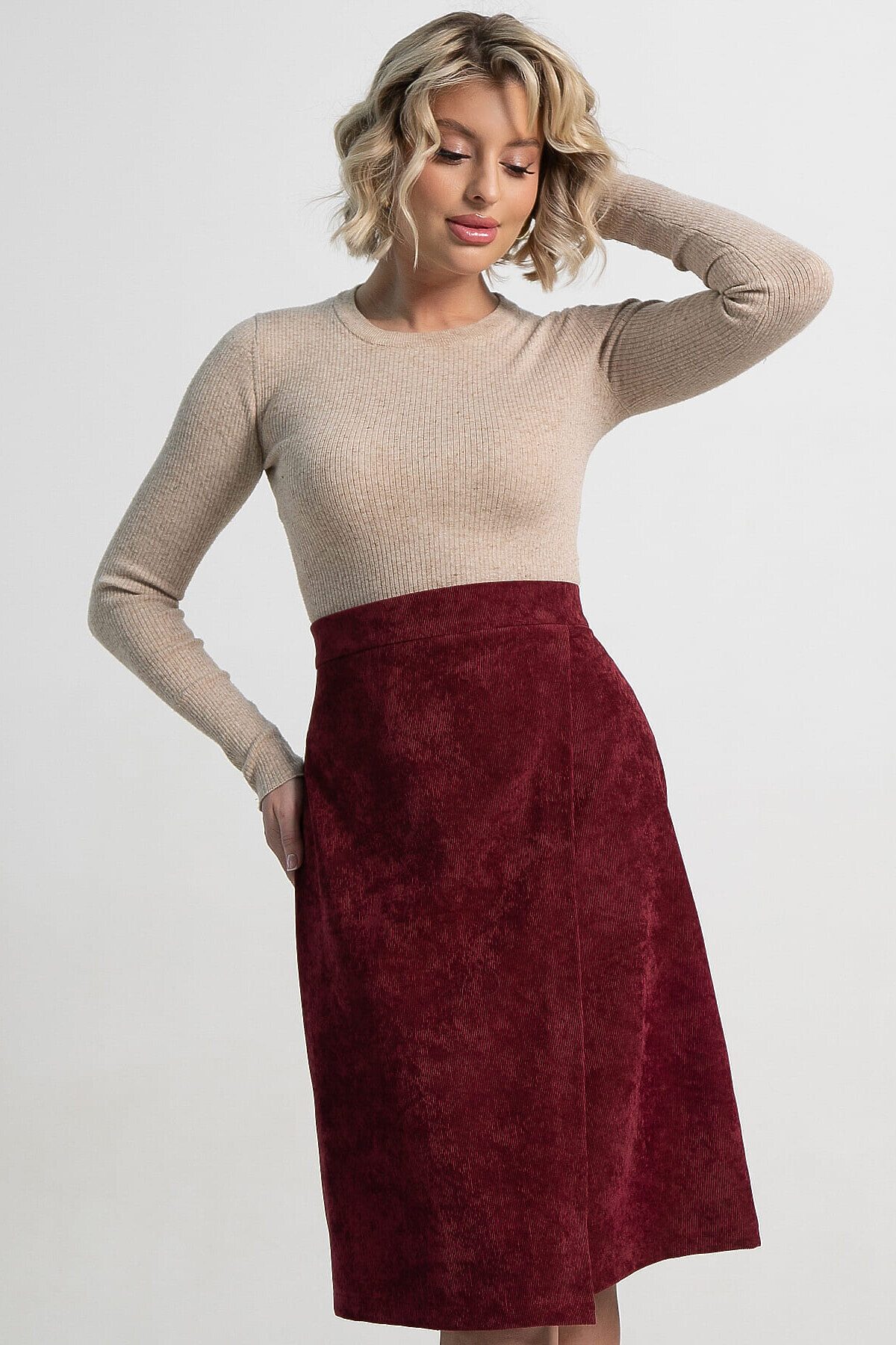 Женская вельветовая юбка на запах в насыщенном оттенке бургунди — стильный и практичный элемент гардероба. Юбка оснащена молнией для удобства. Элегантный цвет бургунди легко сочетается с различными топами и обувью, позволяя создавать как повседневные, так и более торжественные образы. Идеальный выбор для тех, кто ценит стиль, комфорт и практичность.