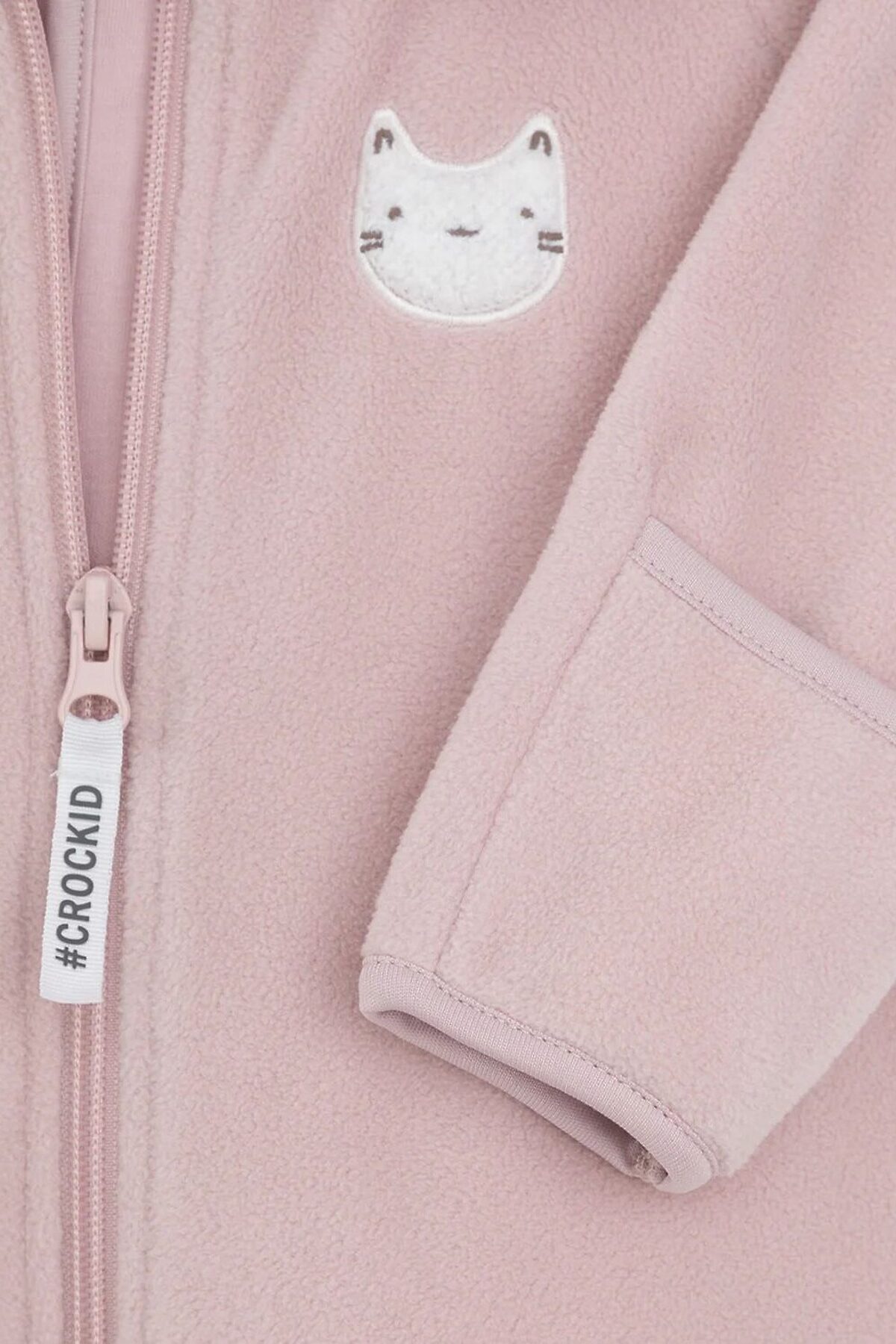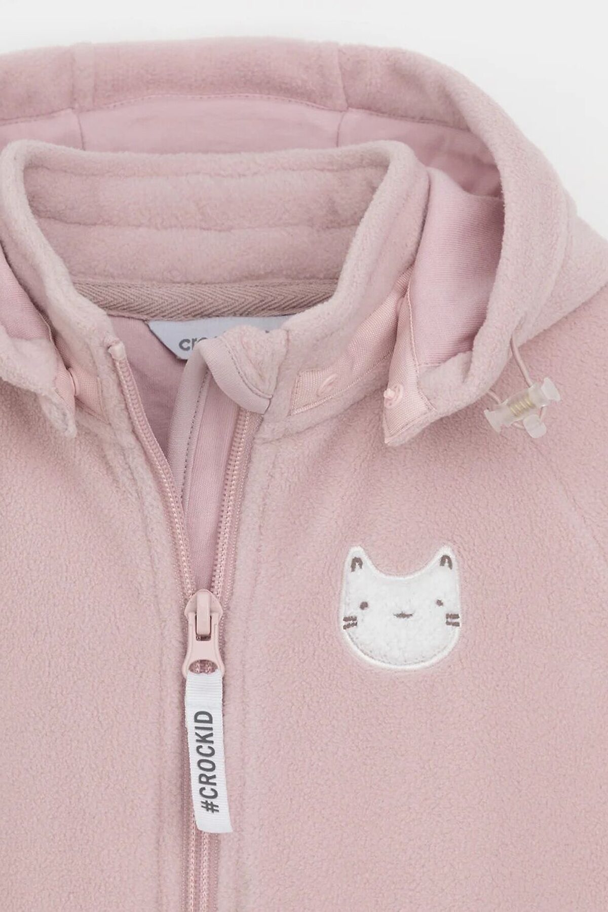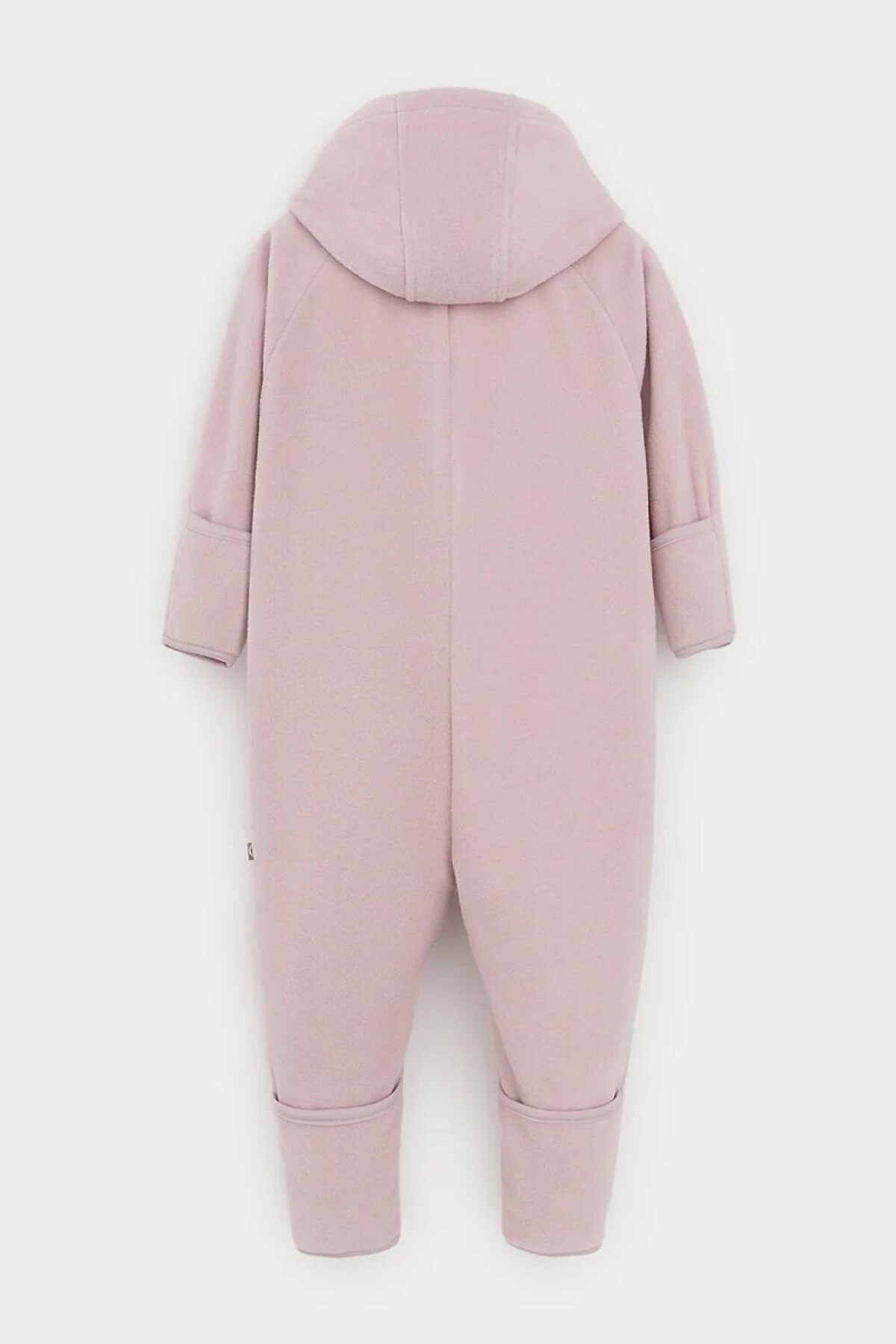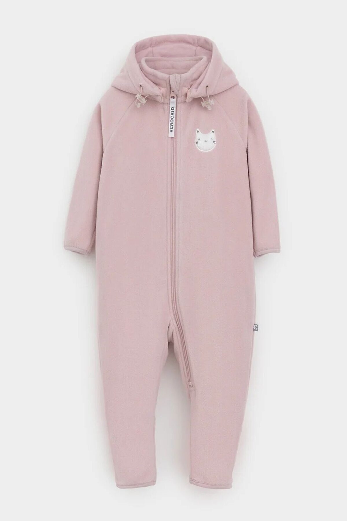 Флисовый комбинезон для девочки со съёмным капюшоном. Капюшон регулируется по ширине с помощью эластичной утяжки со стопперами. Подклад выполнен из гладкого трикотажа супрем, произведённого из высококачественного натурального хлопка. Застёгивается на удлинённую молнию с мягкой защитой шеи и подбородка. В размерах 62, 68 и 74 на рукавах и ножках есть отвороты. Украшен вышивкой. Комбинезон сохраняет цвет и форму после многократных стирок.