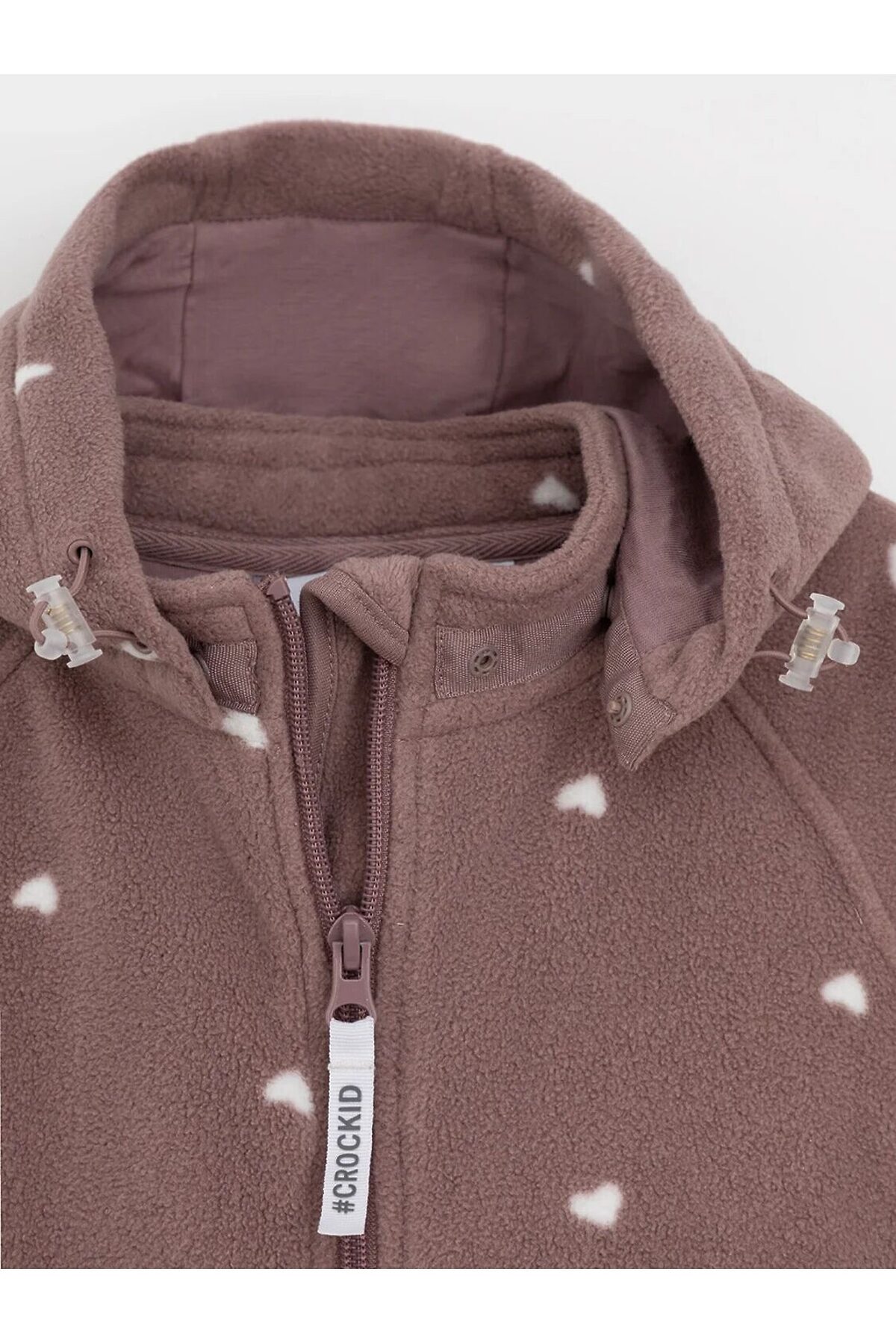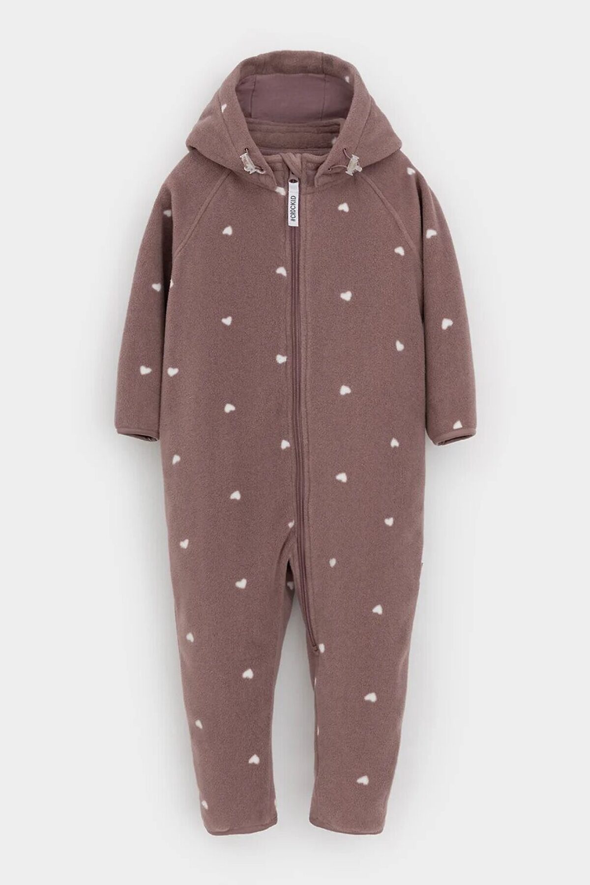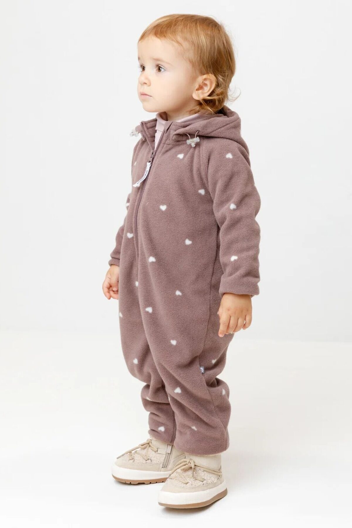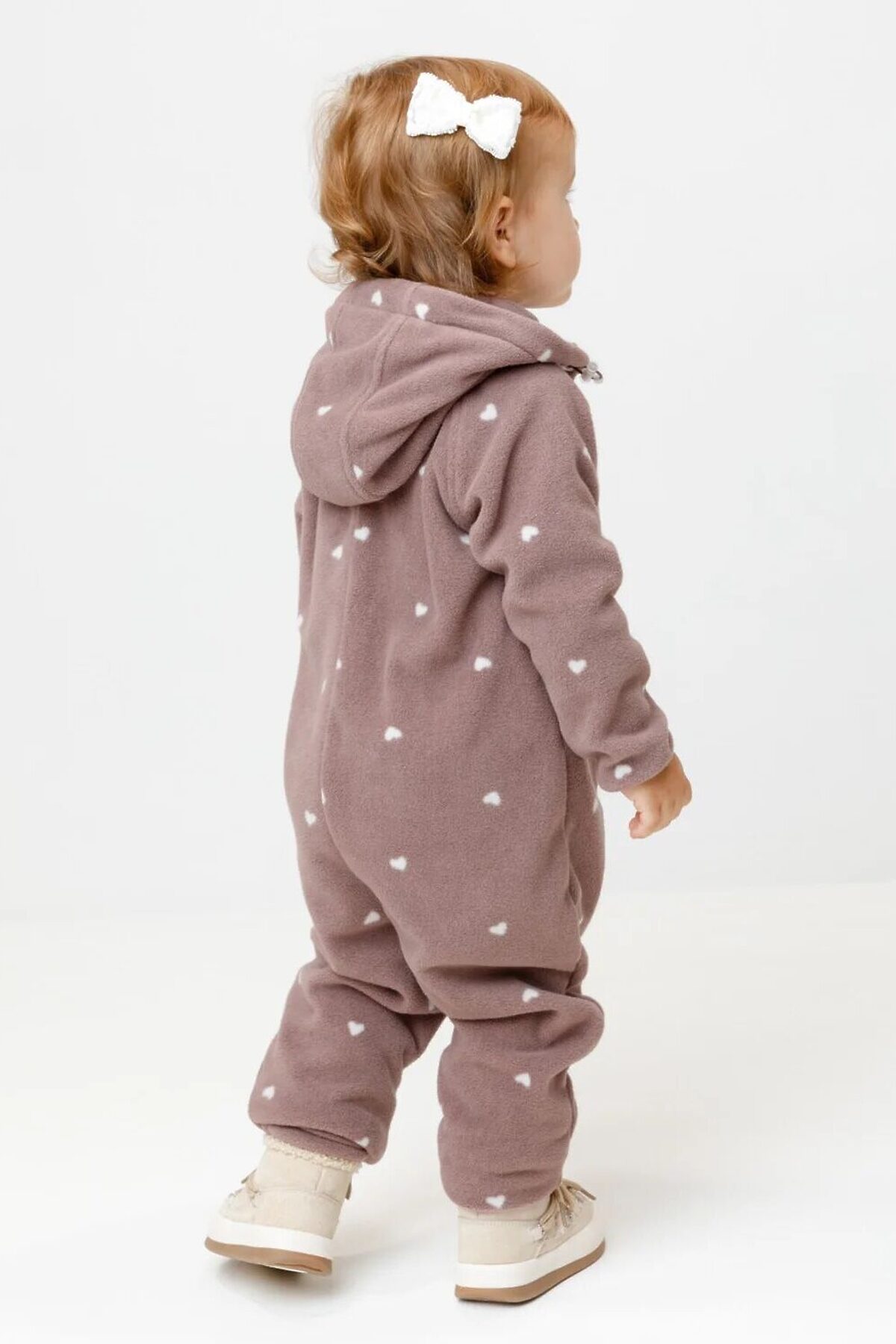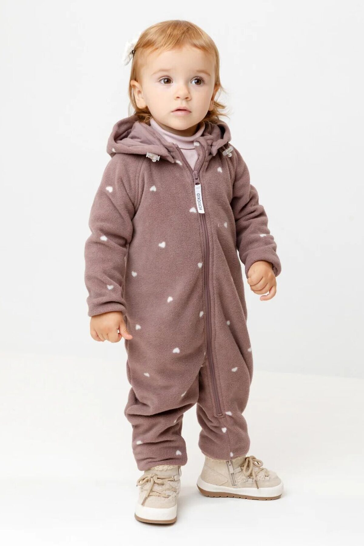 Флисовый комбинезон для девочки со съёмным капюшоном. Капюшон регулируется по ширине с помощью эластичной утяжки со стопперами. Подклад выполнен из гладкого трикотажа супрем, произведённого из высококачественного натурального хлопка. Застёгивается на удлинённую молнию с мягкой защитой шеи и подбородка. В размерах 62, 68 и 74 на рукавах и ножках есть отвороты. Комбинезон сохраняет цвет и форму после многократных стирок.