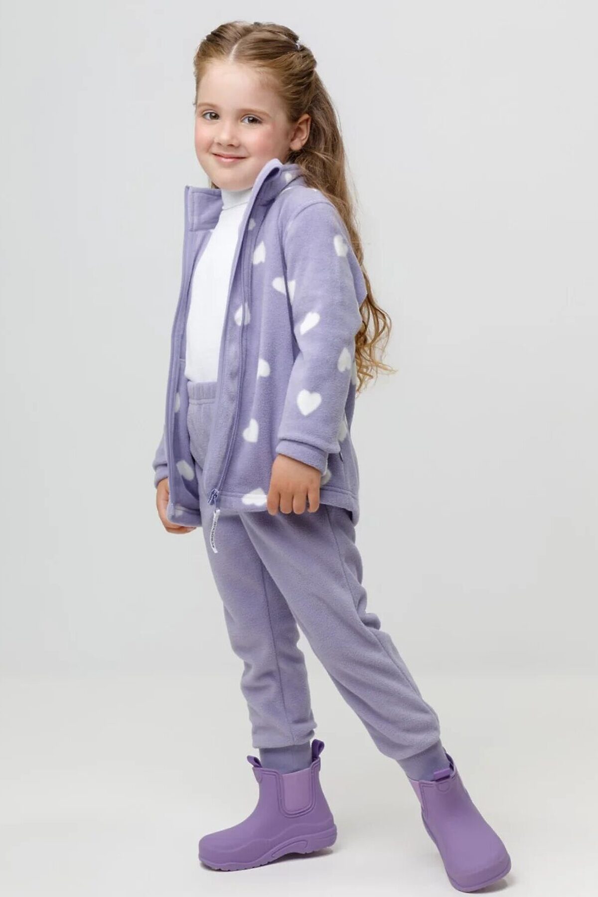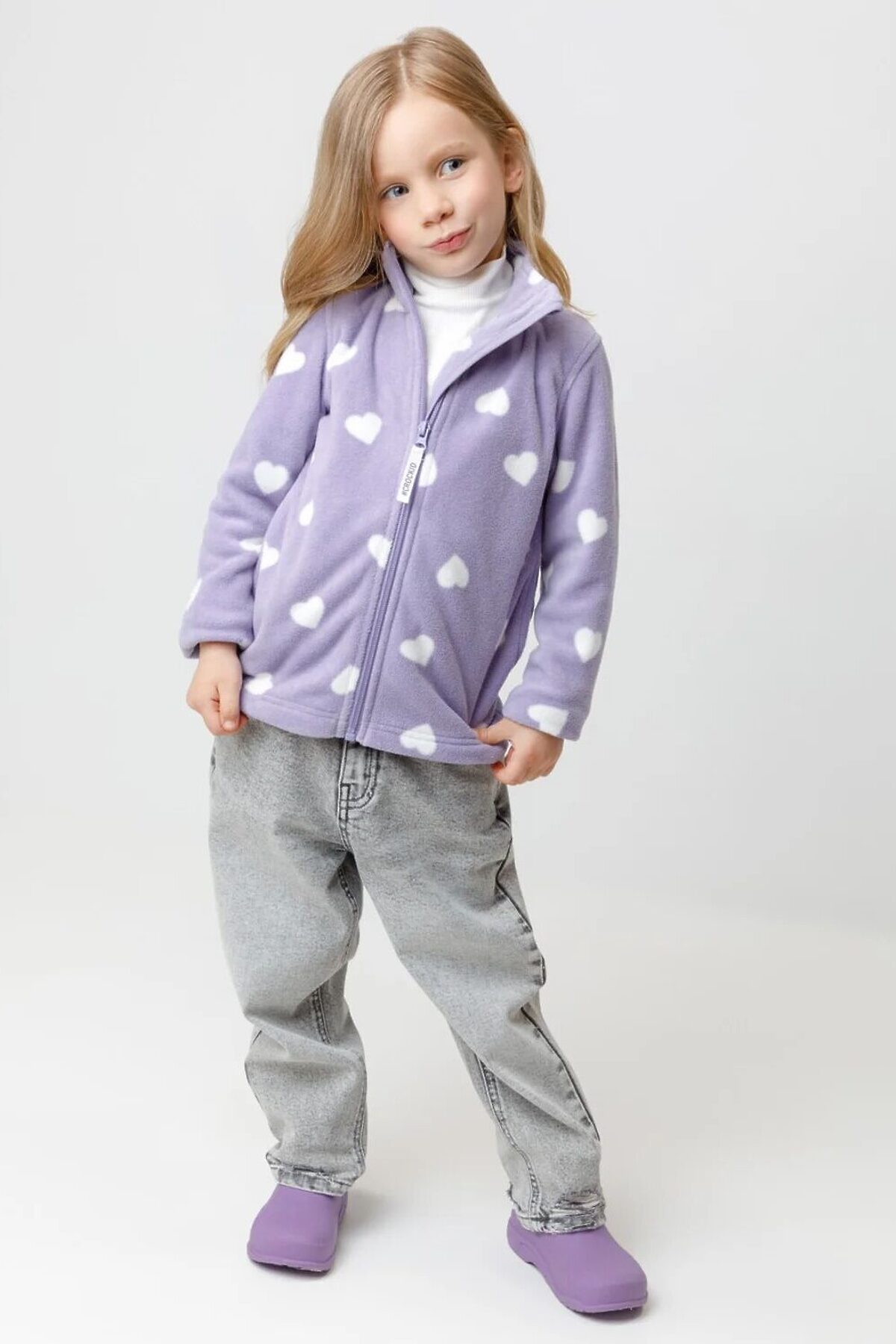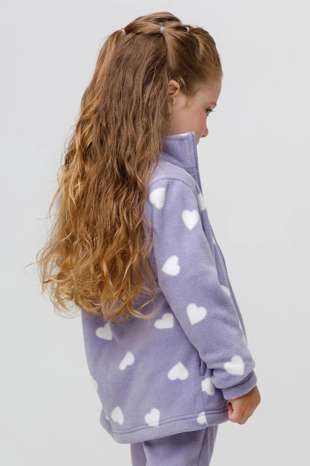 Флисовая куртка для девочки. У изделия высокий воротник и застёжка на молнию с мягкой защитой шеи и подбородка. По бокам два кармана. Оригинальная набивка выполнена из стойких гипоаллергенных текстильных красителей. Куртка сохраняет цвет и форму после многократных стирок.