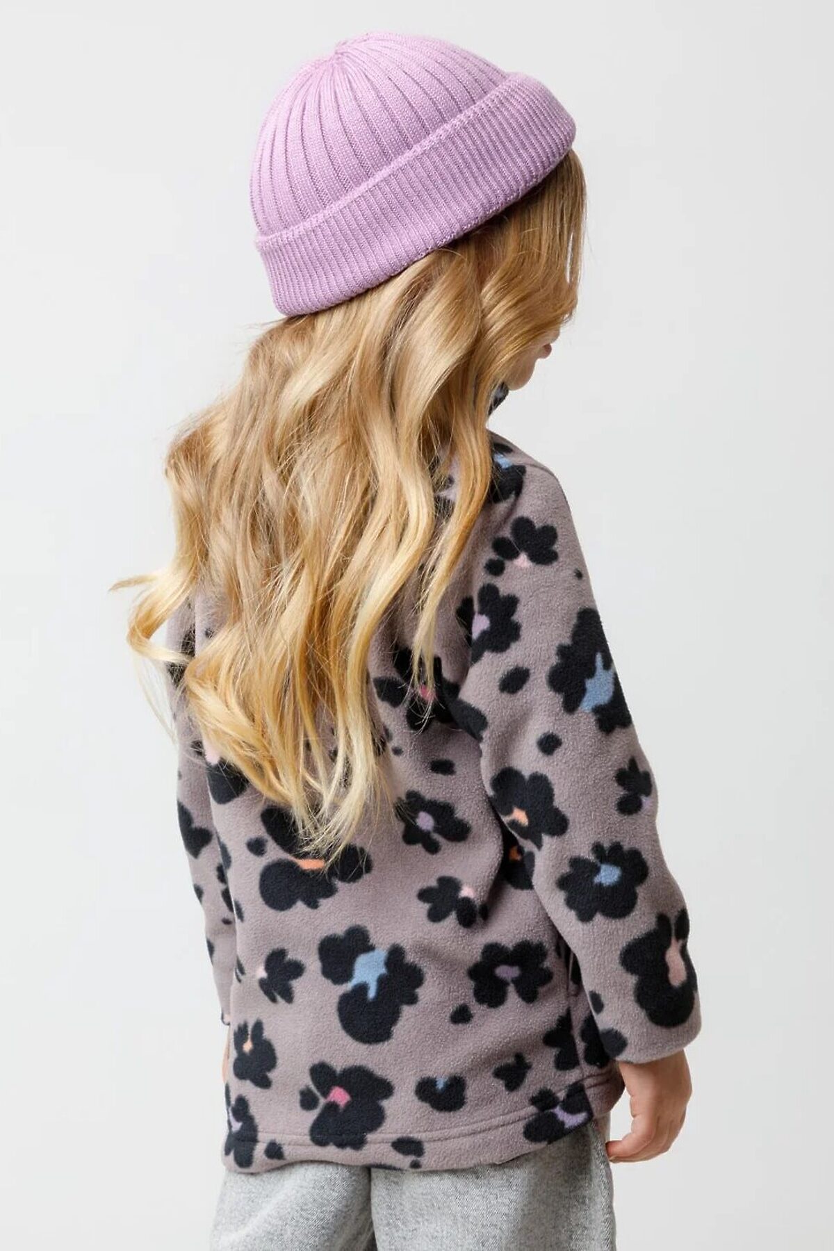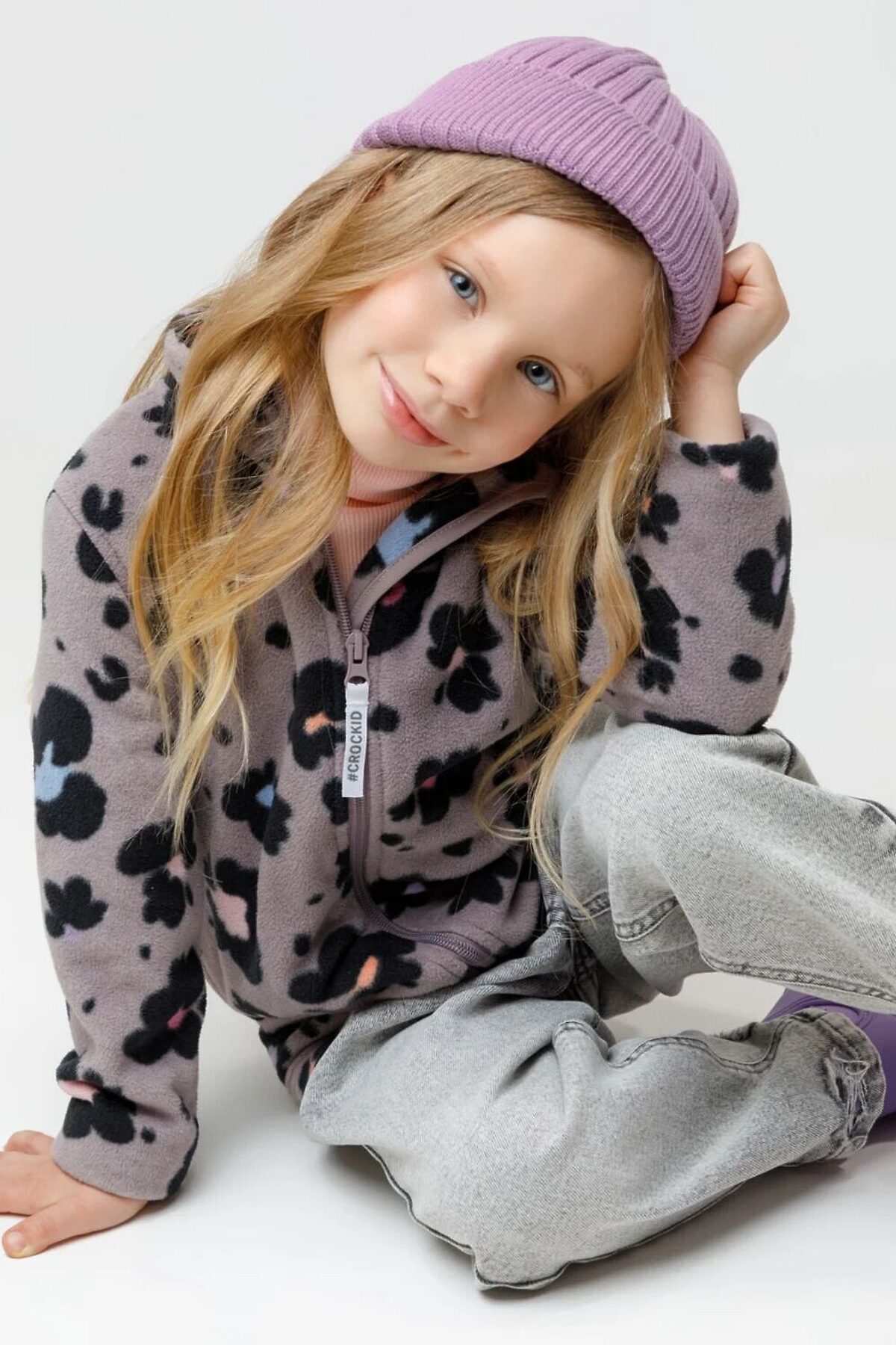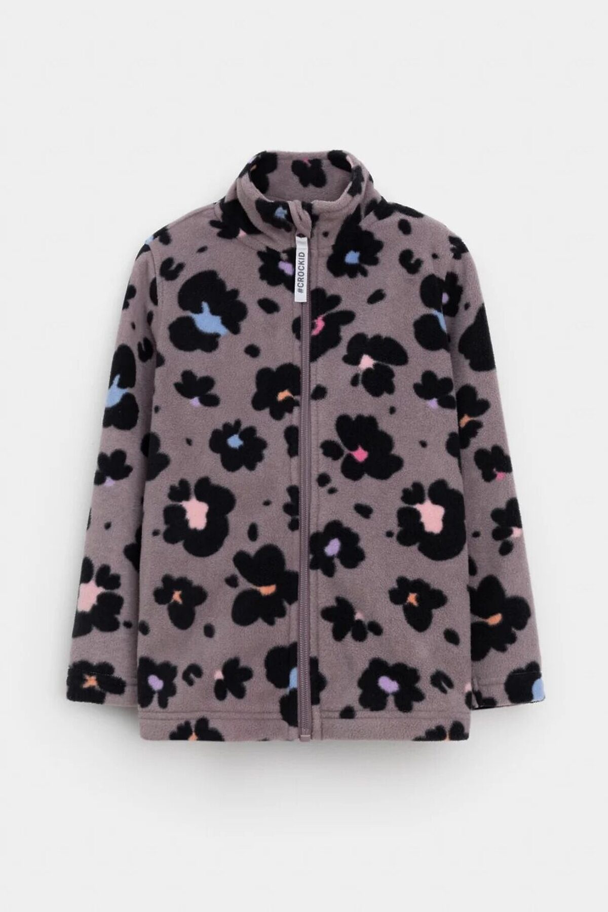 Флисовая куртка для девочки. У изделия высокий воротник и застёжка на молнию с мягкой защитой шеи и подбородка. По бокам два кармана. Оригинальная набивка выполнена из стойких гипоаллергенных текстильных красителей. Куртка сохраняет цвет и форму после многократных стирок.