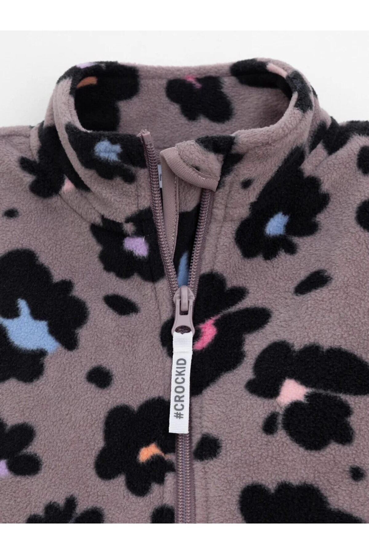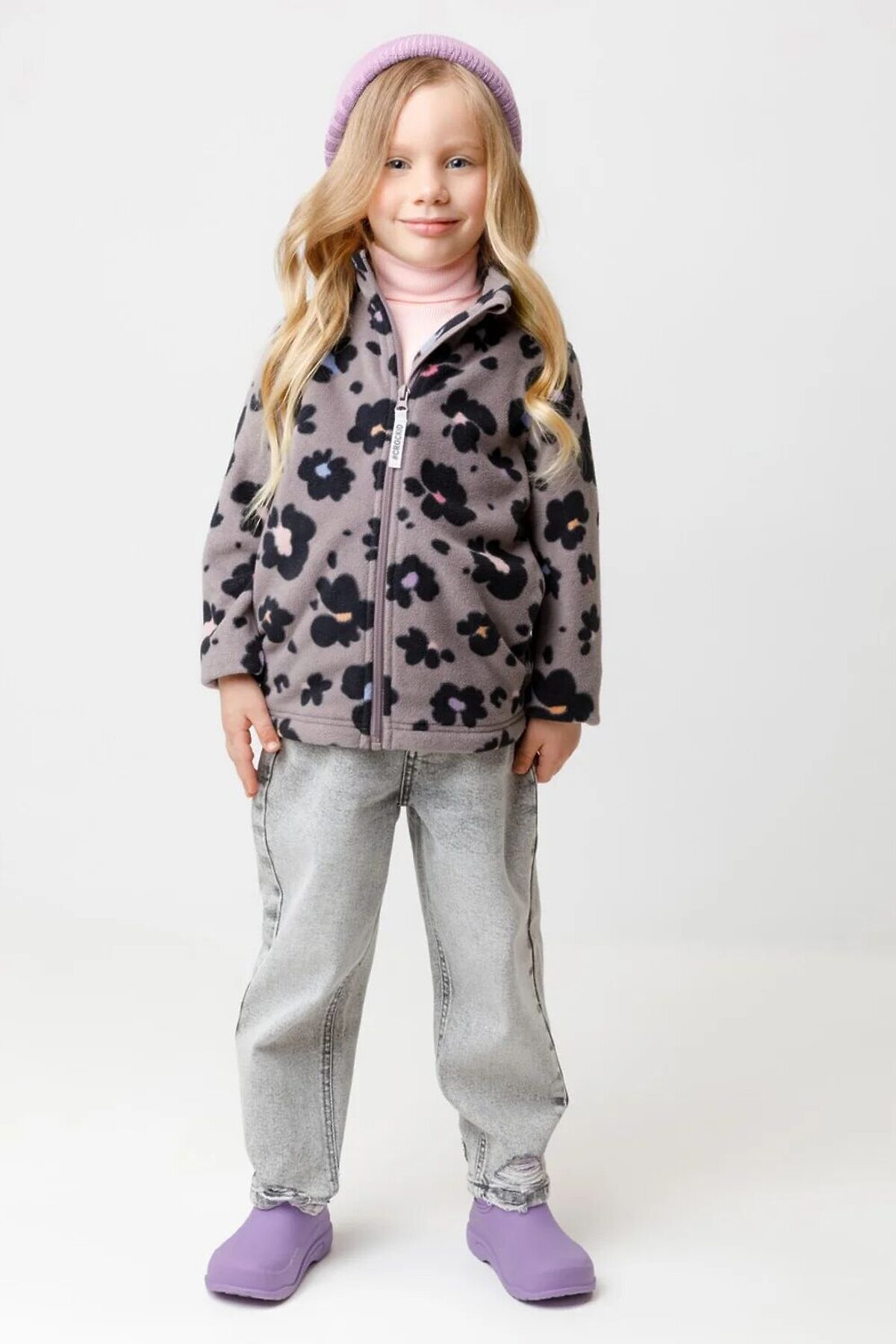 Флисовая куртка для девочки. У изделия высокий воротник и застёжка на молнию с мягкой защитой шеи и подбородка. По бокам два кармана. Оригинальная набивка выполнена из стойких гипоаллергенных текстильных красителей. Куртка сохраняет цвет и форму после многократных стирок.