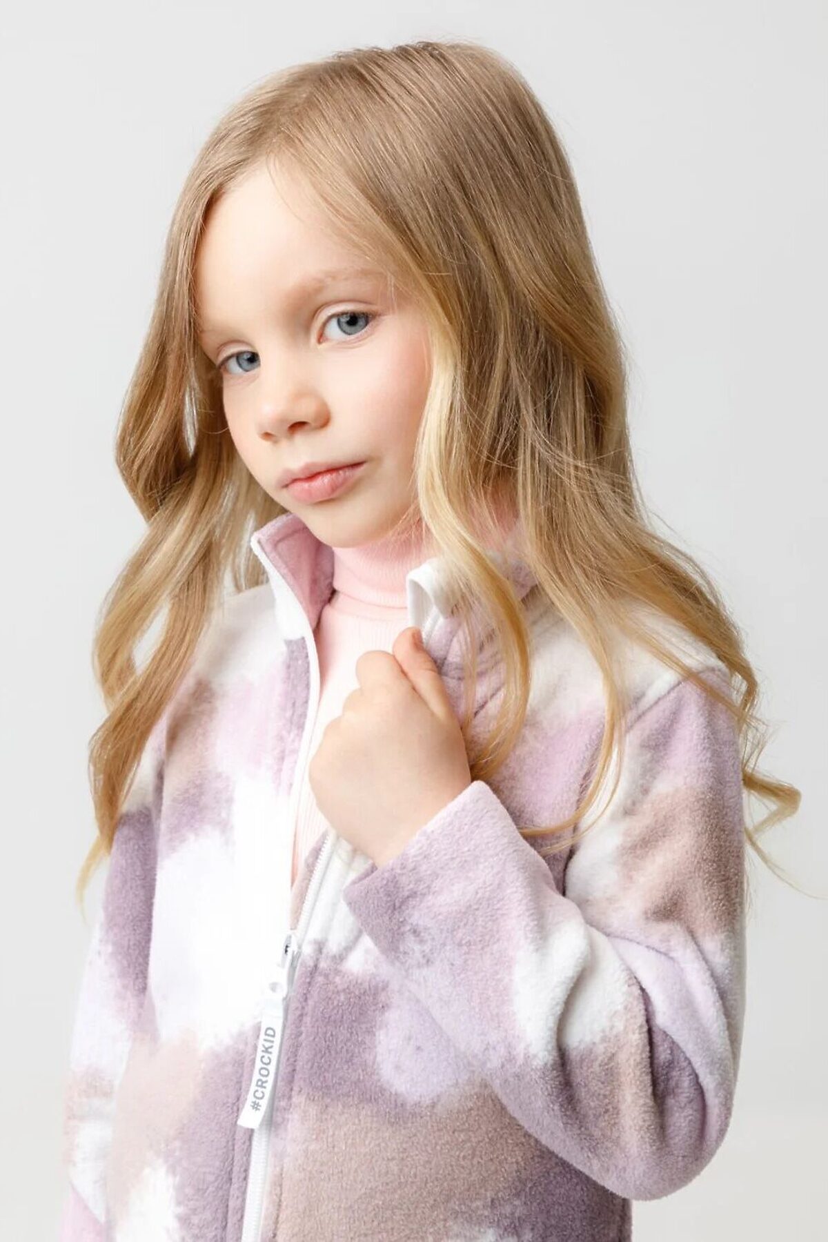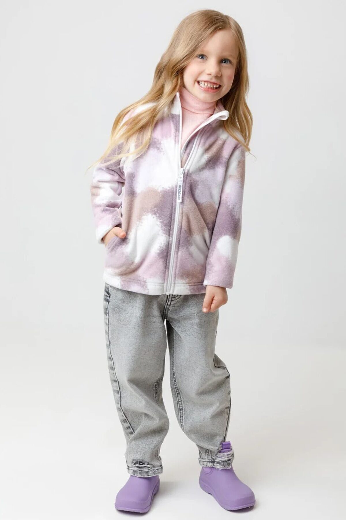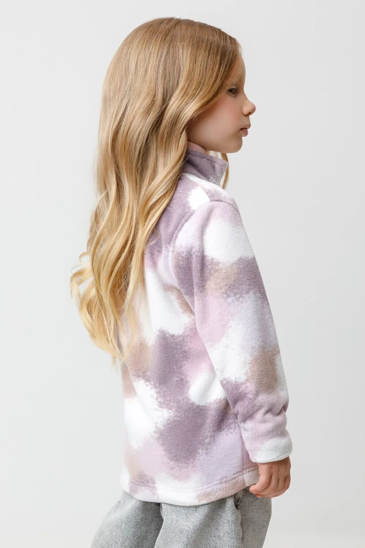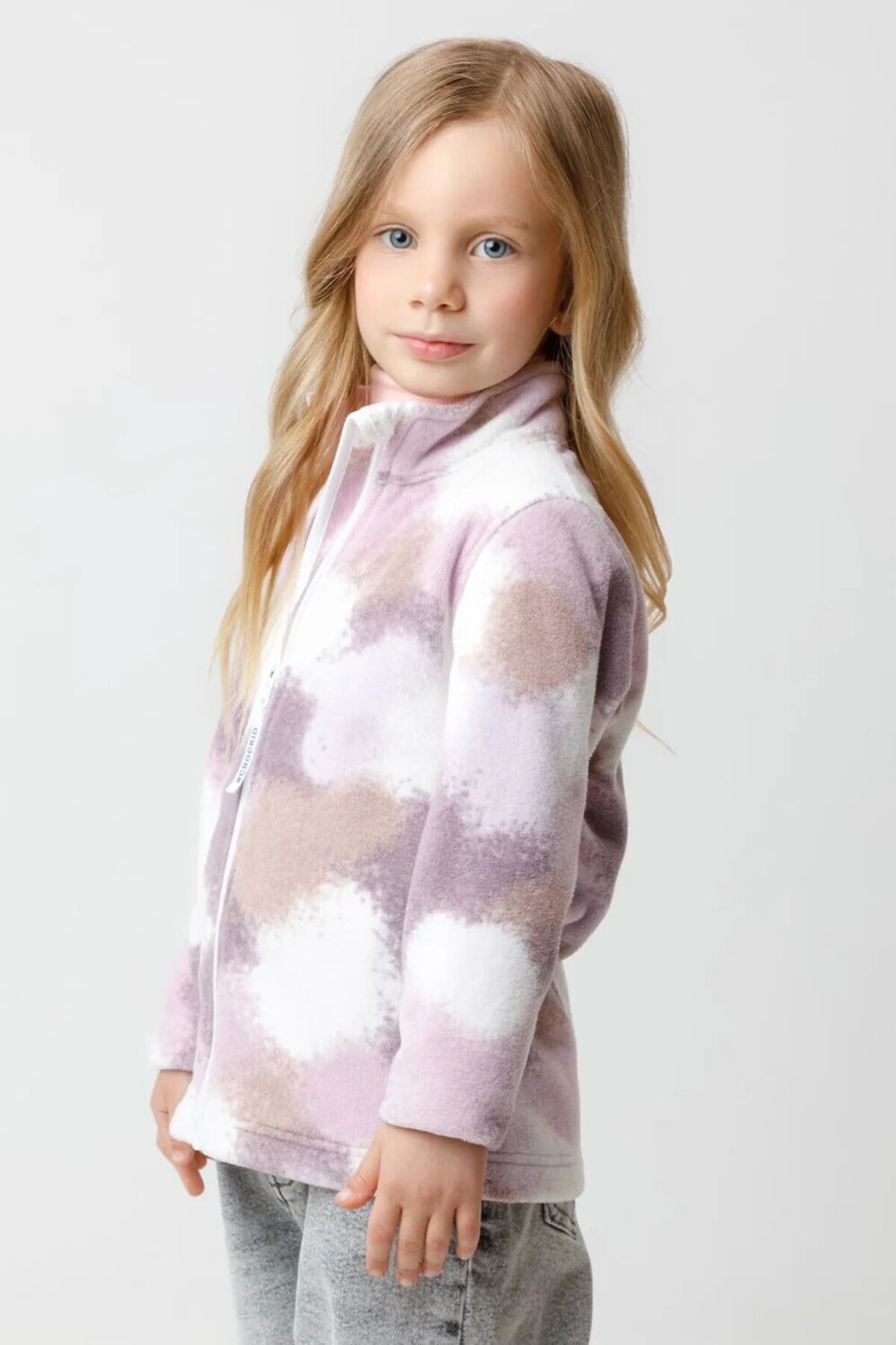 Флисовая куртка для девочки. У изделия высокий воротник и застёжка на молнию с мягкой защитой шеи и подбородка. По бокам два кармана. Оригинальная набивка выполнена из стойких гипоаллергенных текстильных красителей. Куртка сохраняет цвет и форму после многократных стирок.