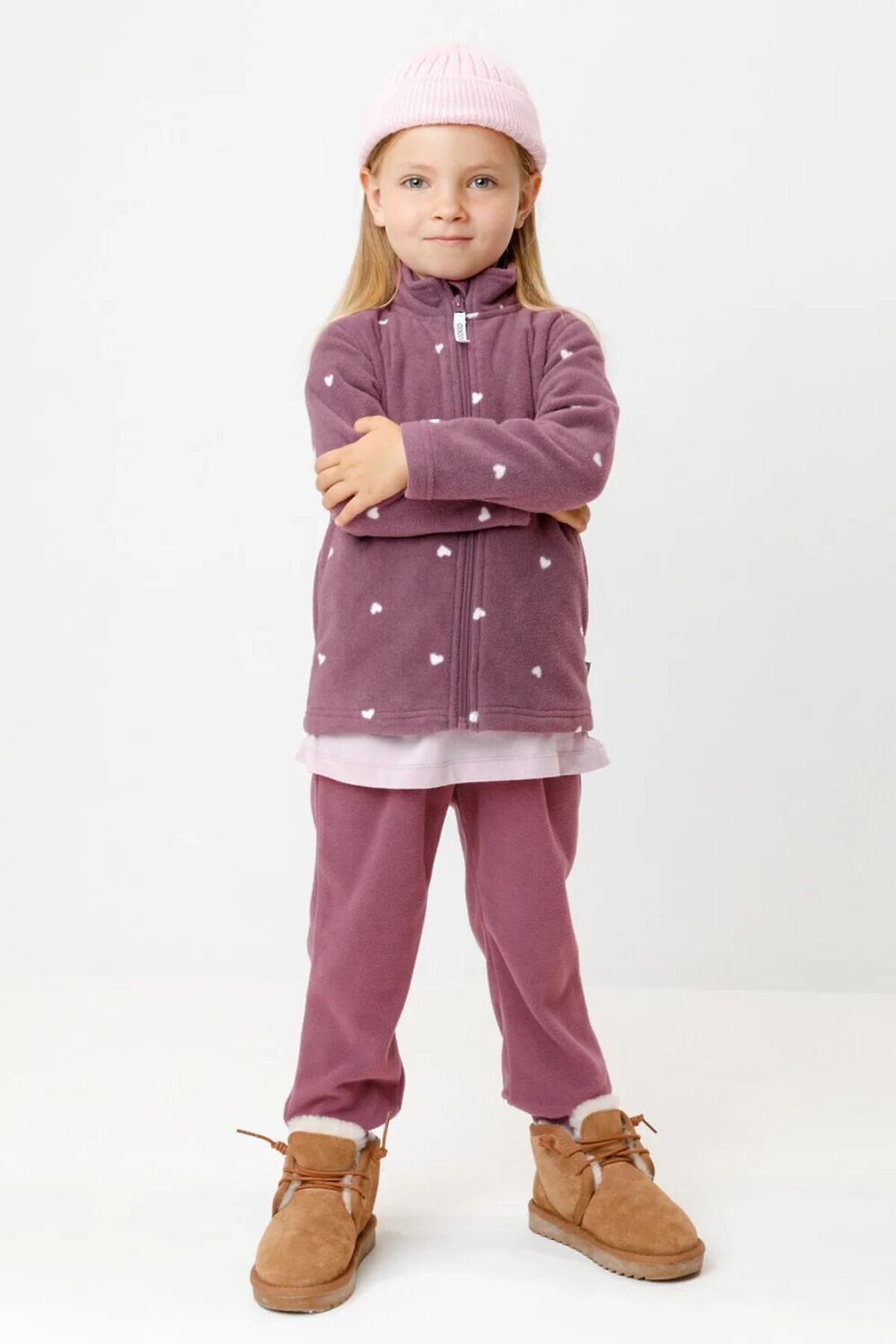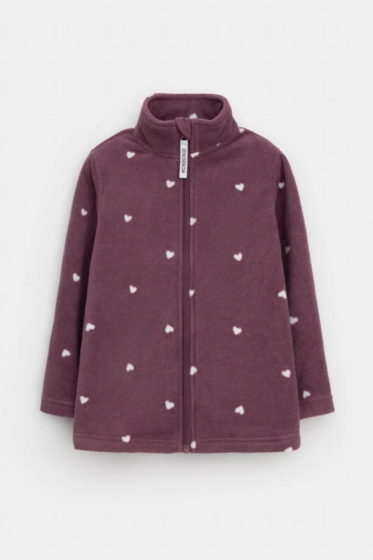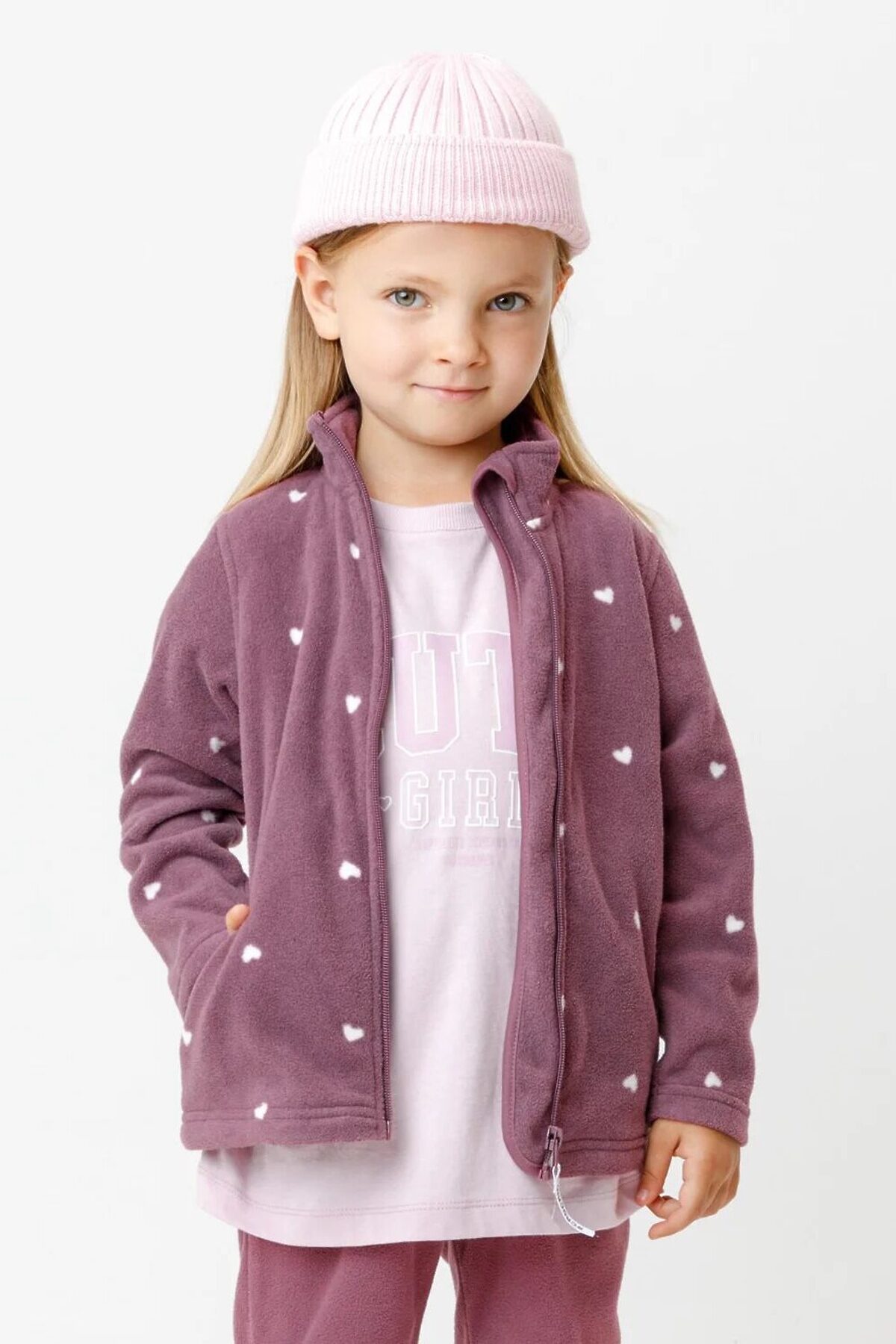 Флисовая куртка для девочки. У изделия высокий воротник и застёжка на молнию с мягкой защитой шеи и подбородка. По бокам два кармана. Оригинальная набивка выполнена из стойких гипоаллергенных текстильных красителей. Куртка сохраняет цвет и форму после многократных стирок.