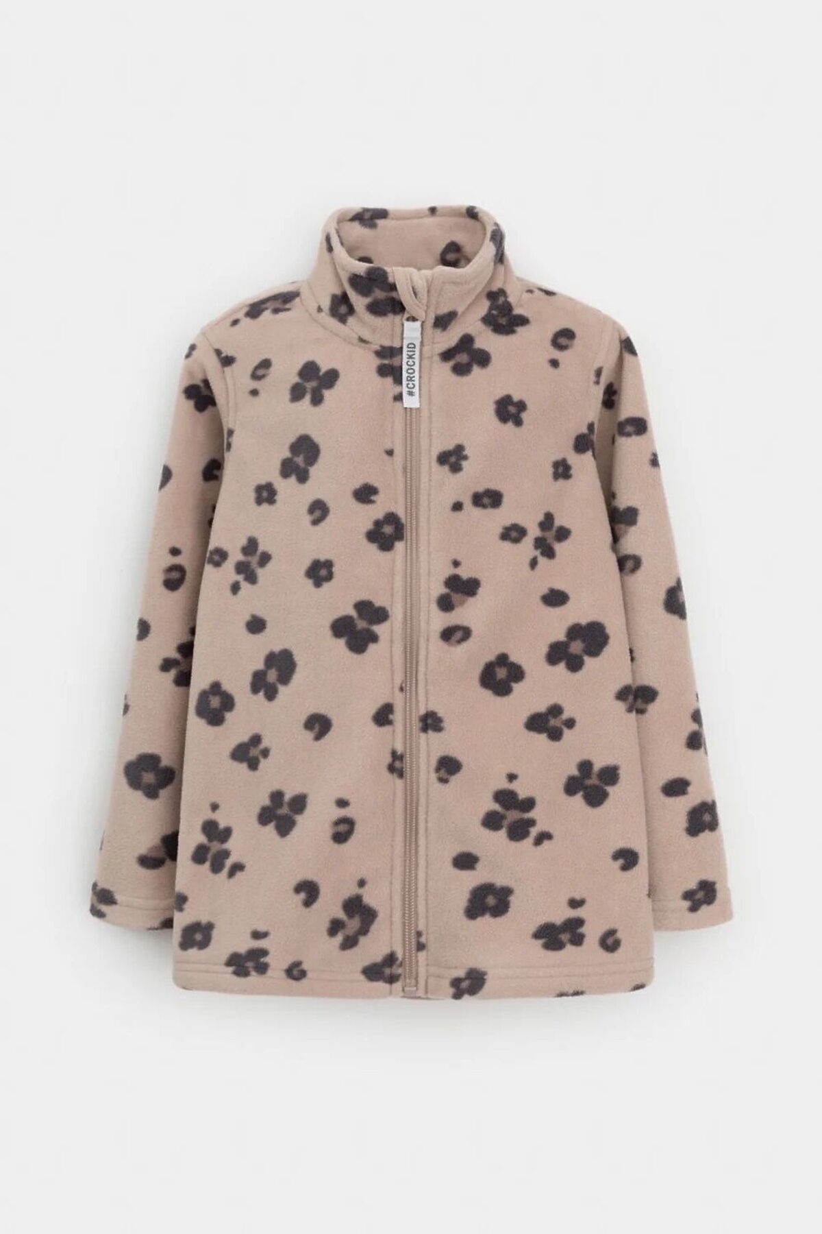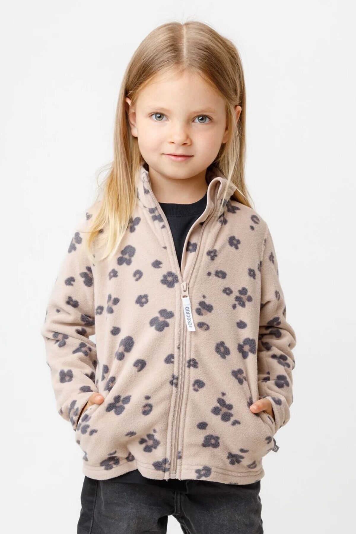 Флисовая куртка для девочки. У изделия высокий воротник и застёжка на молнию с мягкой защитой шеи и подбородка. По бокам два кармана. Оригинальная набивка выполнена из стойких гипоаллергенных текстильных красителей. Куртка сохраняет цвет и форму после многократных стирок.