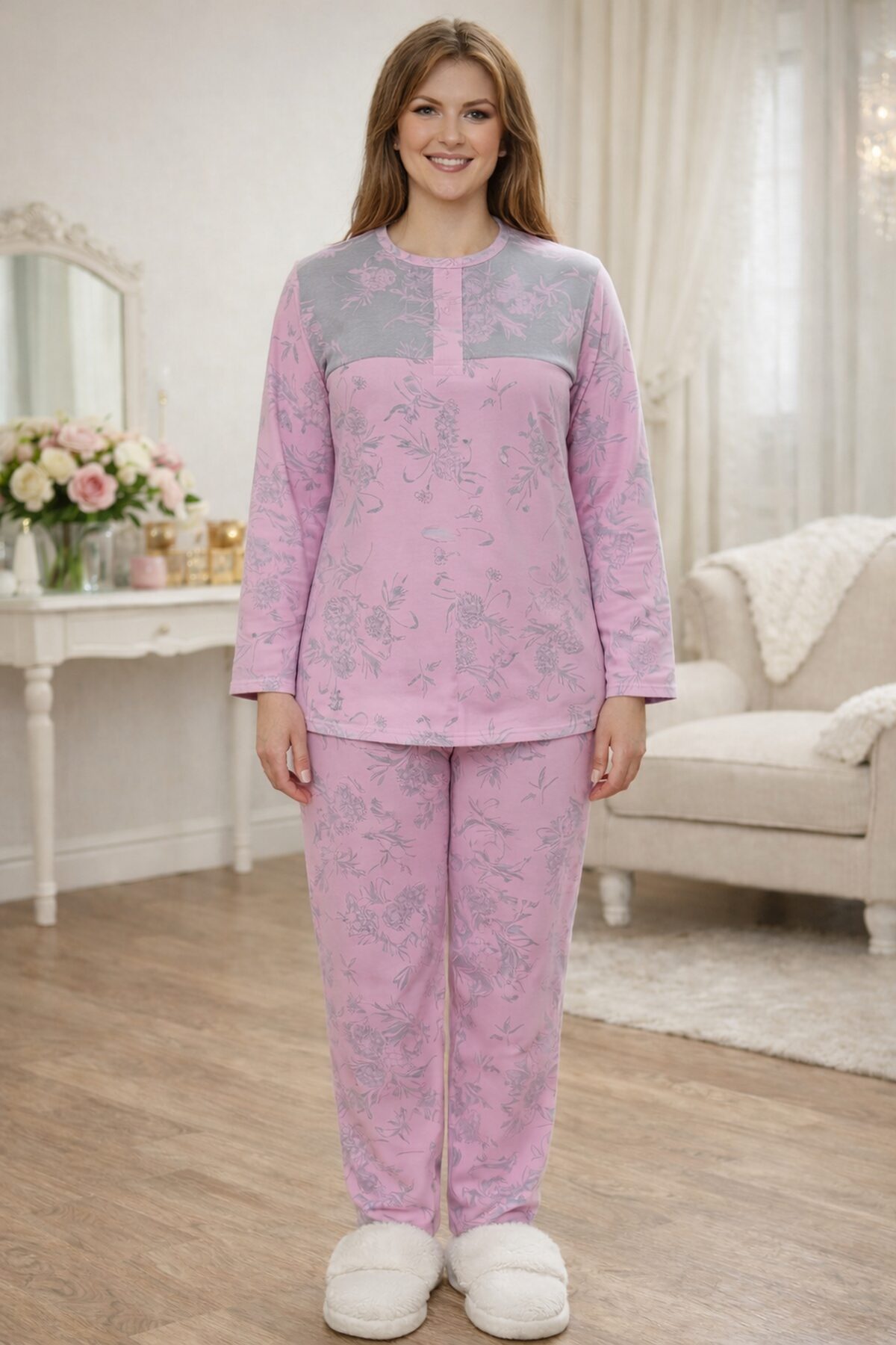 Женский домашний костюм выполнен из мягкого и приятного к телу трикотажа. Модель состоит из лонгслива с длинным рукавом и удобных брюк свободного кроя. Основной цвет серый и розовый украшенный изящным цветочным принтом в пастельно-розовых оттенках. Верх костюма дополнен контрастной розовой вставкой в зоне груди, которая визуально освежает образ и делает его более женственным. Брюки с эластичным поясом обеспечивают комфортную посадку и свободу движений. Костюм идеально подходит для сна, отдыха и уютных домашних вечеров, сочетая в себе комфорт, практичность и элегантный внешний вид.