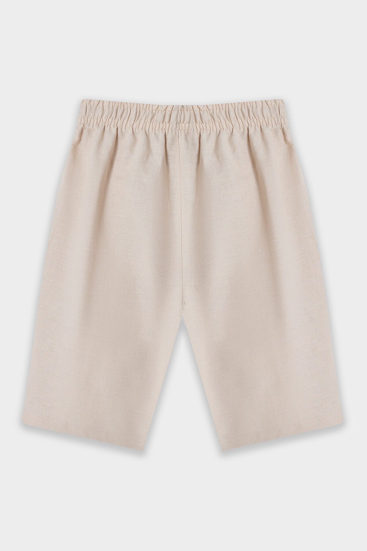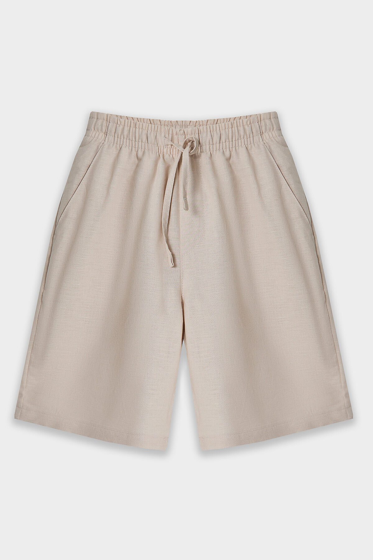 Комплект из двух предметов. Жакет прямого силуэта с воротником. По переду обработана застежка на пуговицы d=10mm и петли. Рукава короткие, втачные, слегка спущены. Нижние срезы изделия и рукавов обработаны швом в подгибку. Шорты прямого силуэта. Посадка средняя. Пояс цельнокроеный с эластичной тесьмой внутри. Шов сидения шорт распошит. На поясе пробиты петли, заправлен шнур из основного полотна. По переду имитация гульфика, обработаны карманы с наклонным входом от боковых швов. Низ шорт обработан швом в подгибку.