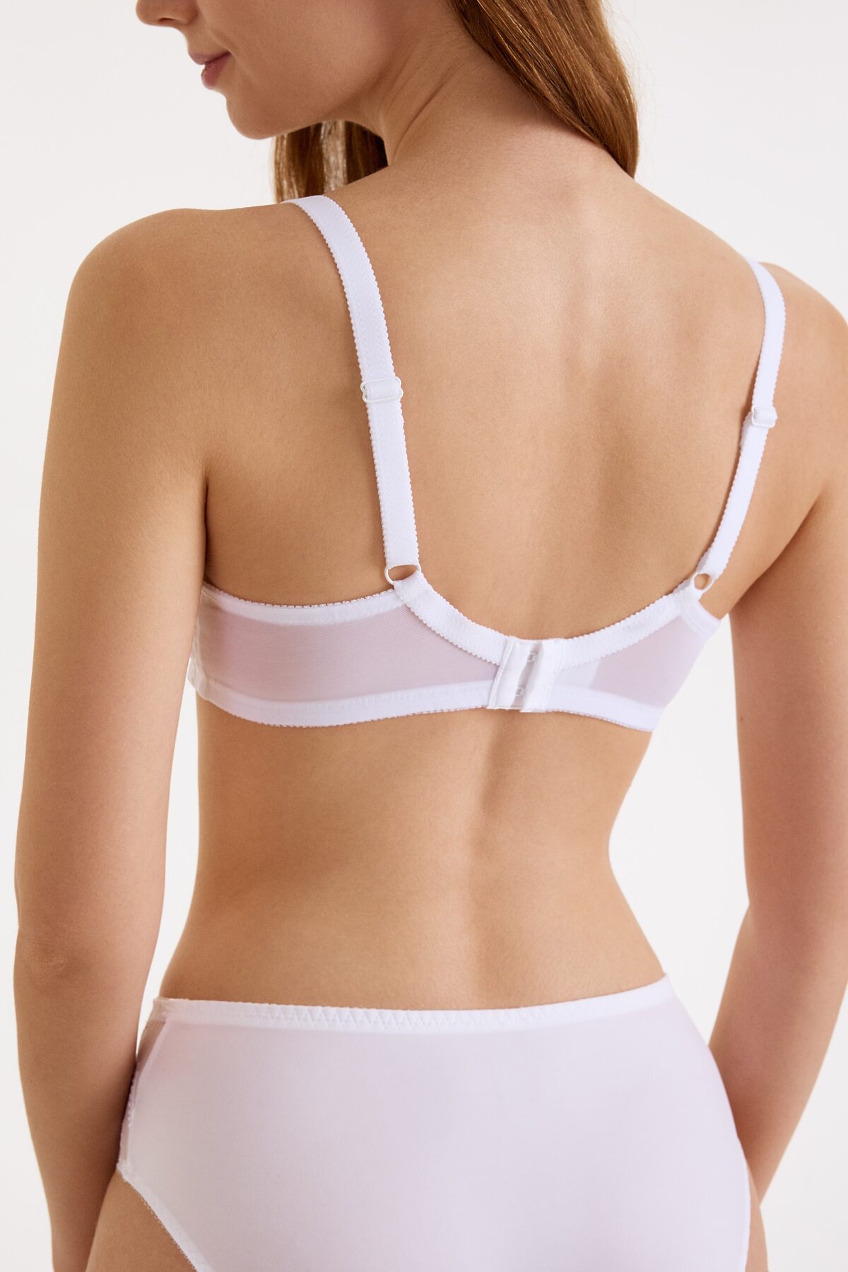 Дублированная чашка с тройным Т- образным членением подойдет женщинам, предпочитающим форму «балконет». Хлопок с внутренней стороны чашки создает максимальный комфорт в носке. Привлекательный элемент дизайна – полупрозрачные элементы из сетчатого полотна в верхней части чашки, которые в сочетании с воздушной вышивкой облегчают и украшают образ.