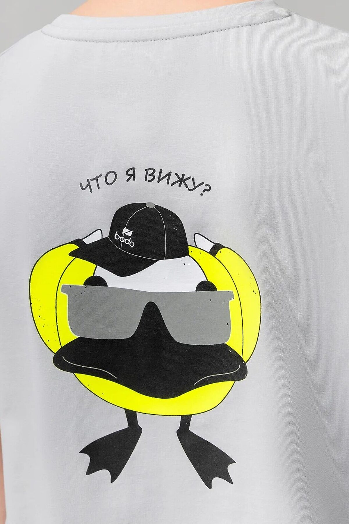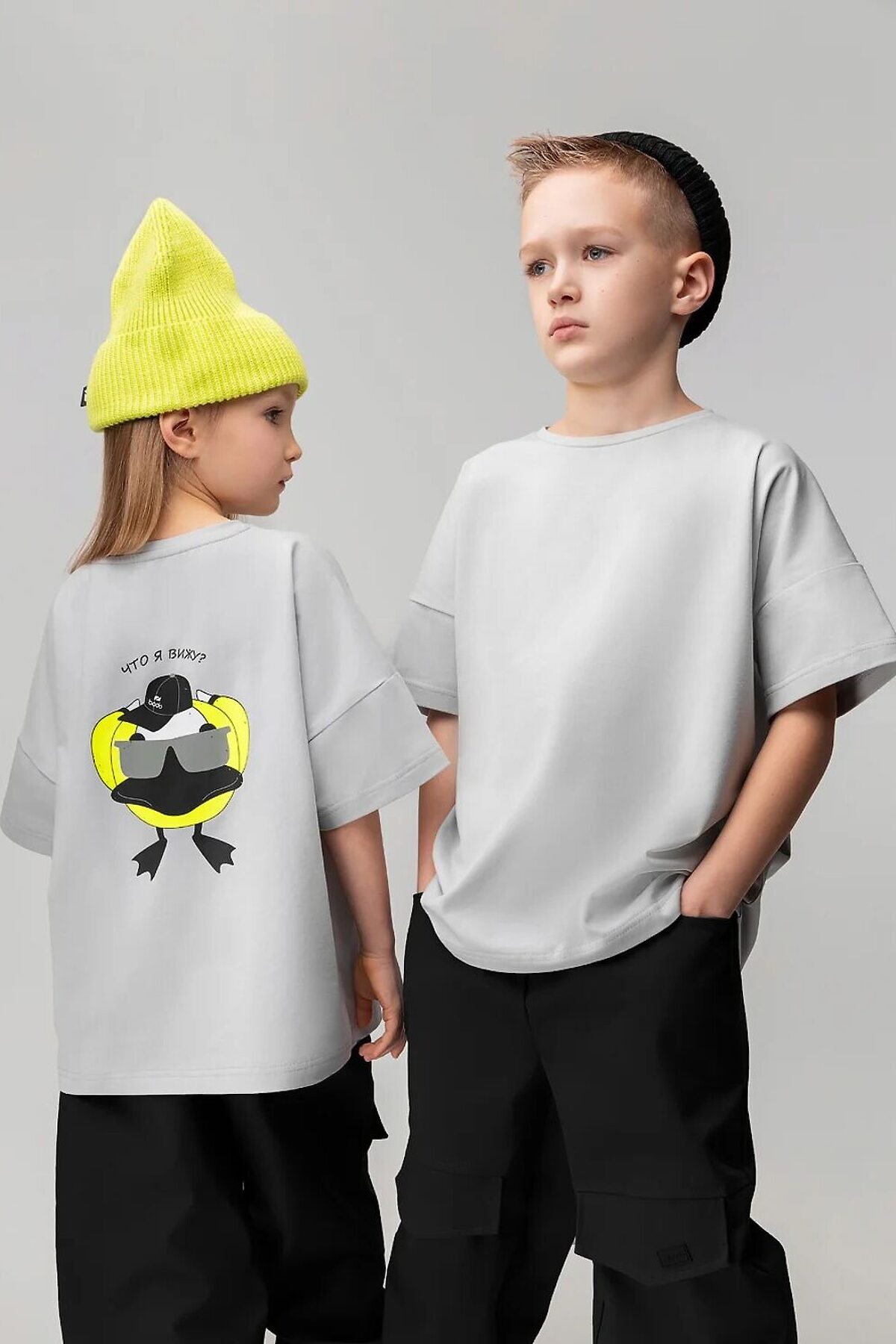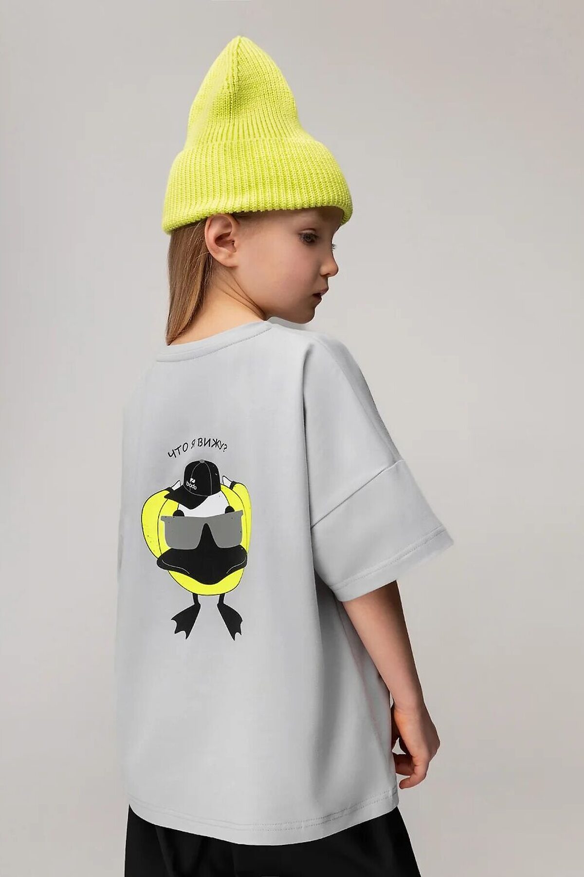 Свободная футболка с коротким рукавом. Горловина футболки округлой формы. Низ изделия прямой. На полочке печать "Гусь"