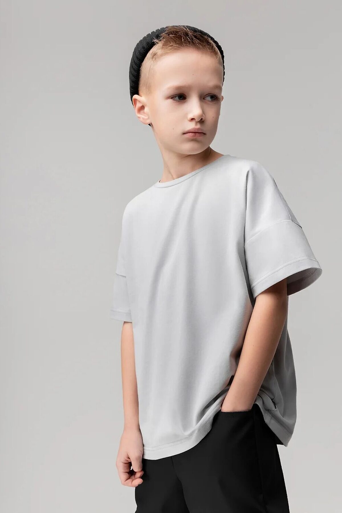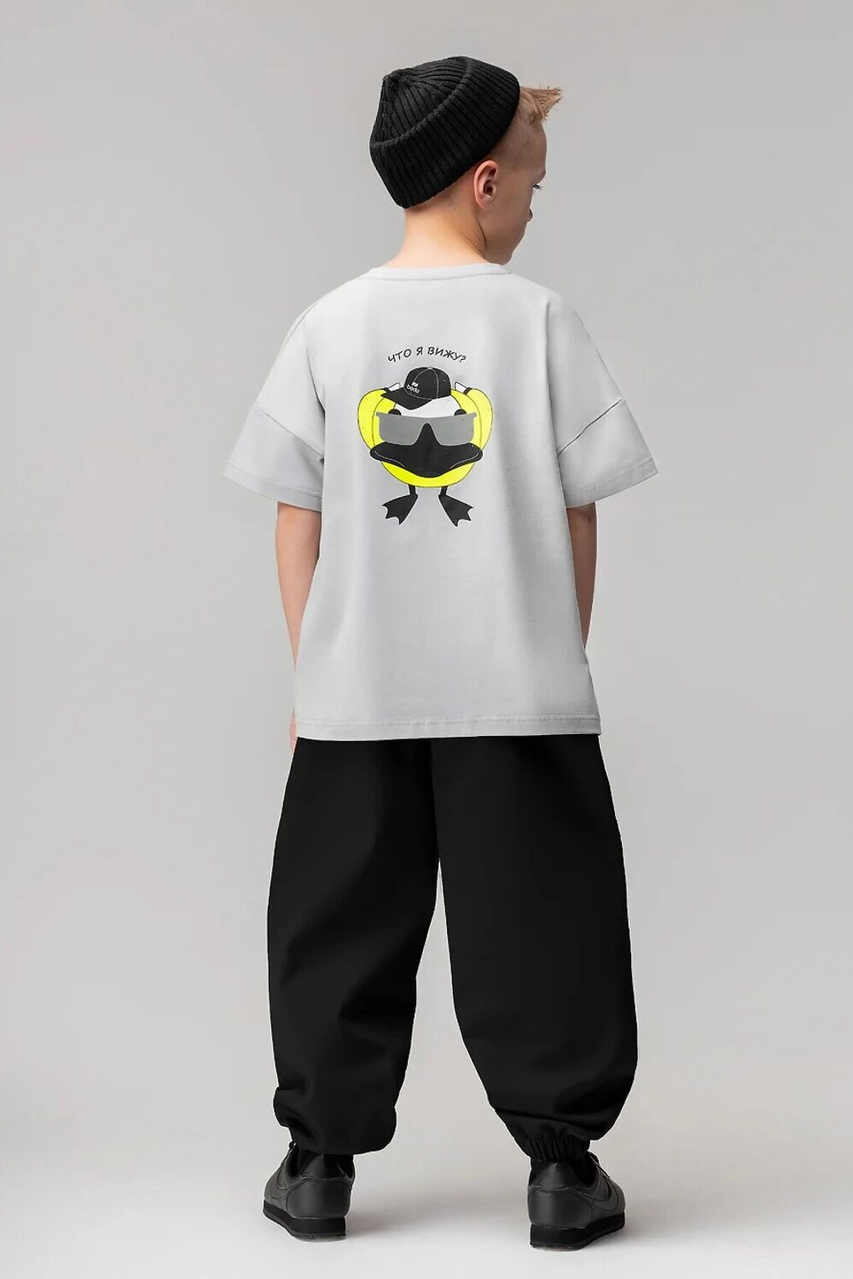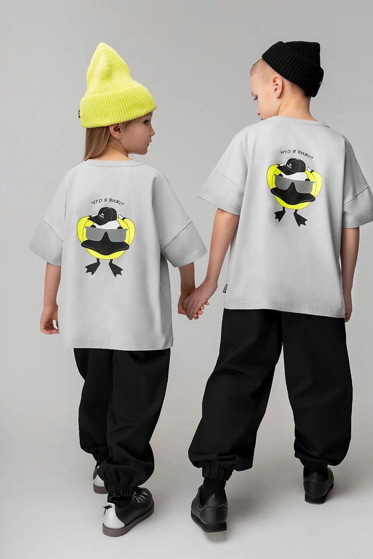 Свободная футболка с коротким рукавом. Горловина футболки округлой формы. Низ изделия прямой. На полочке печать "Гусь"