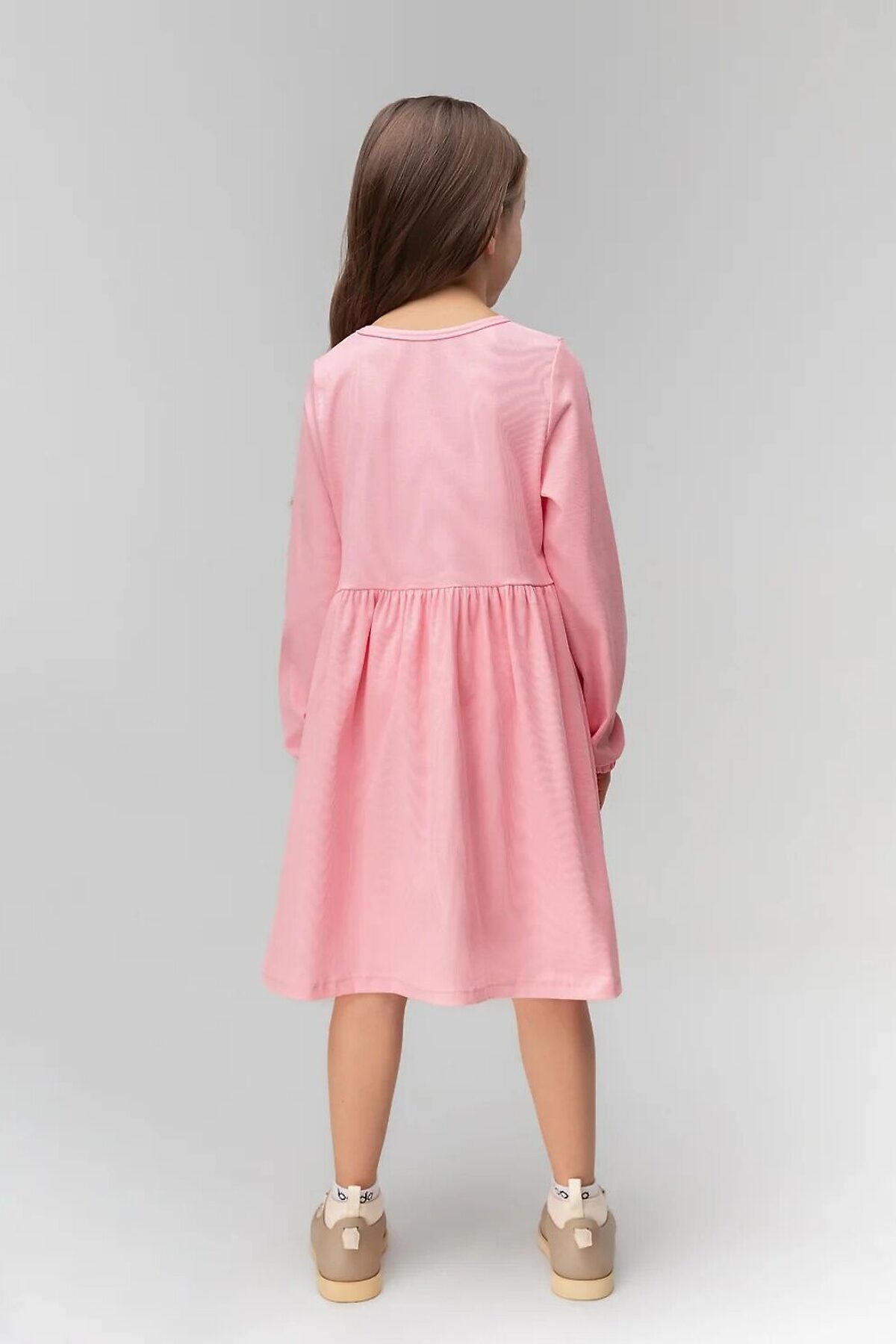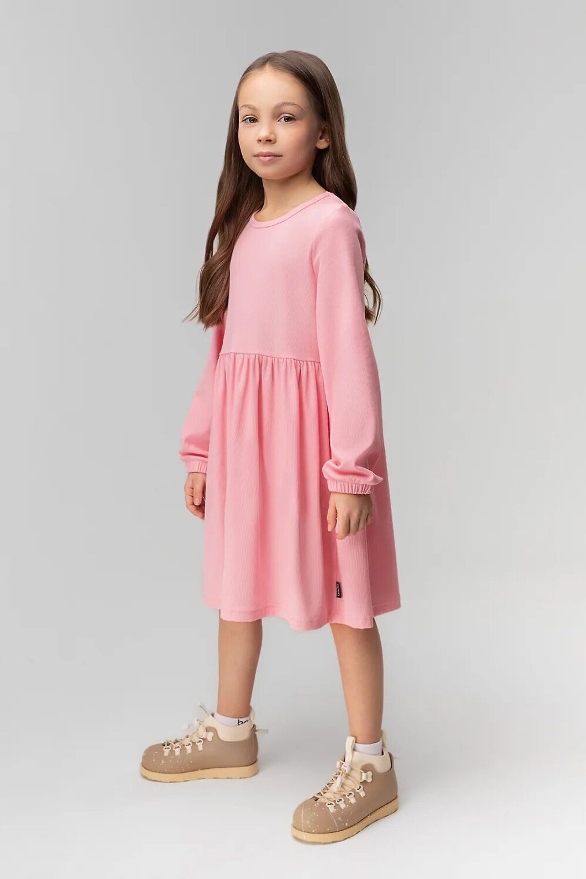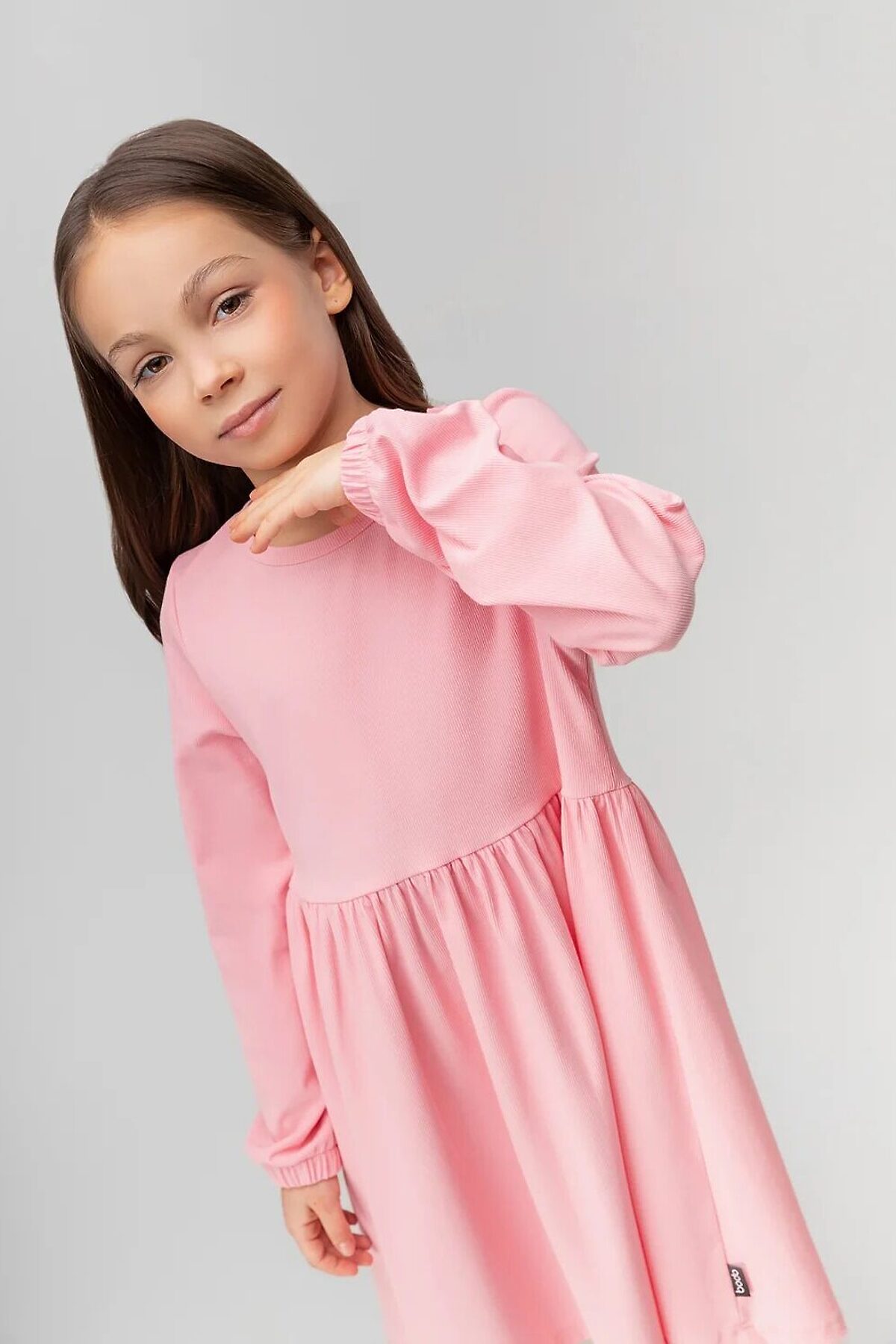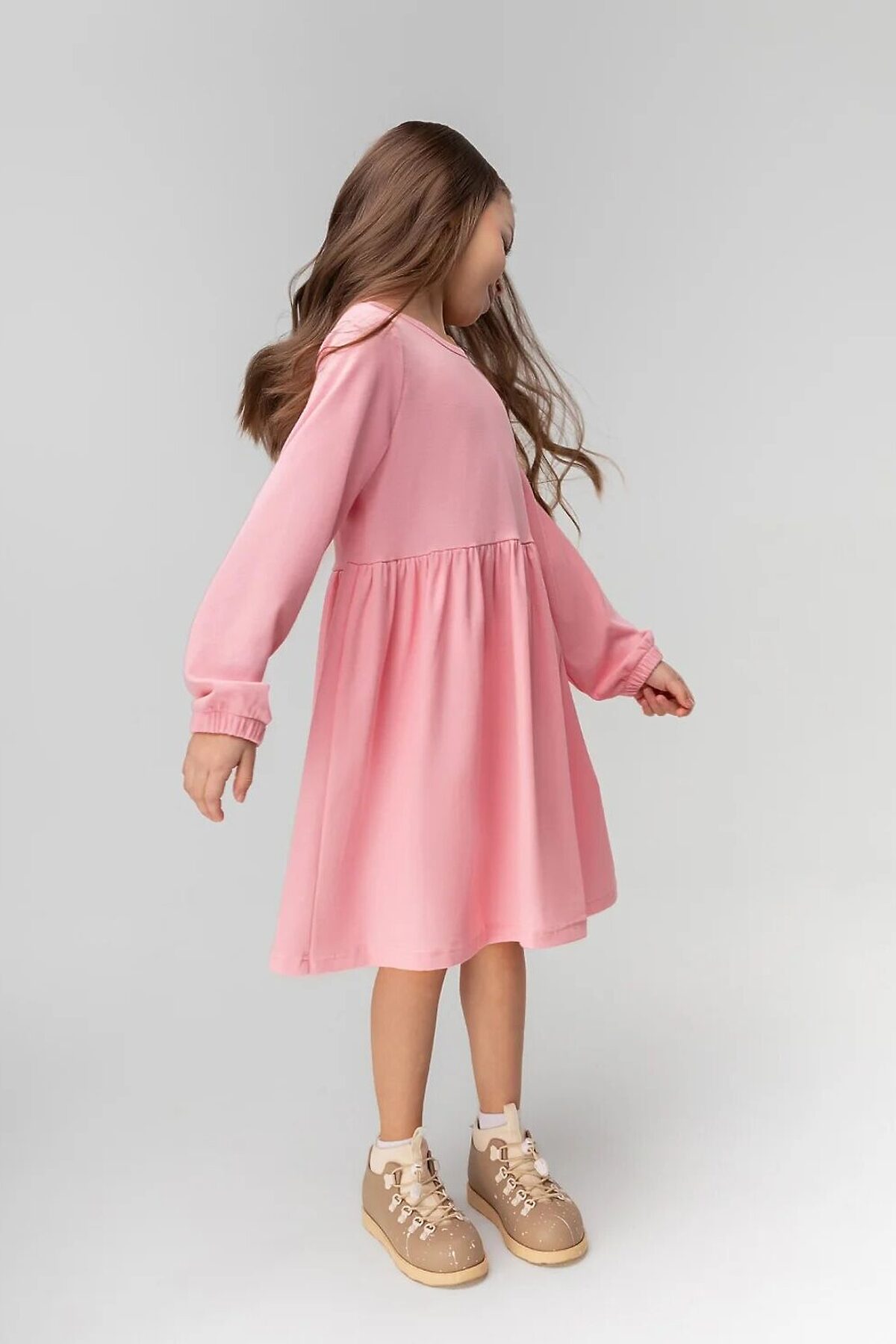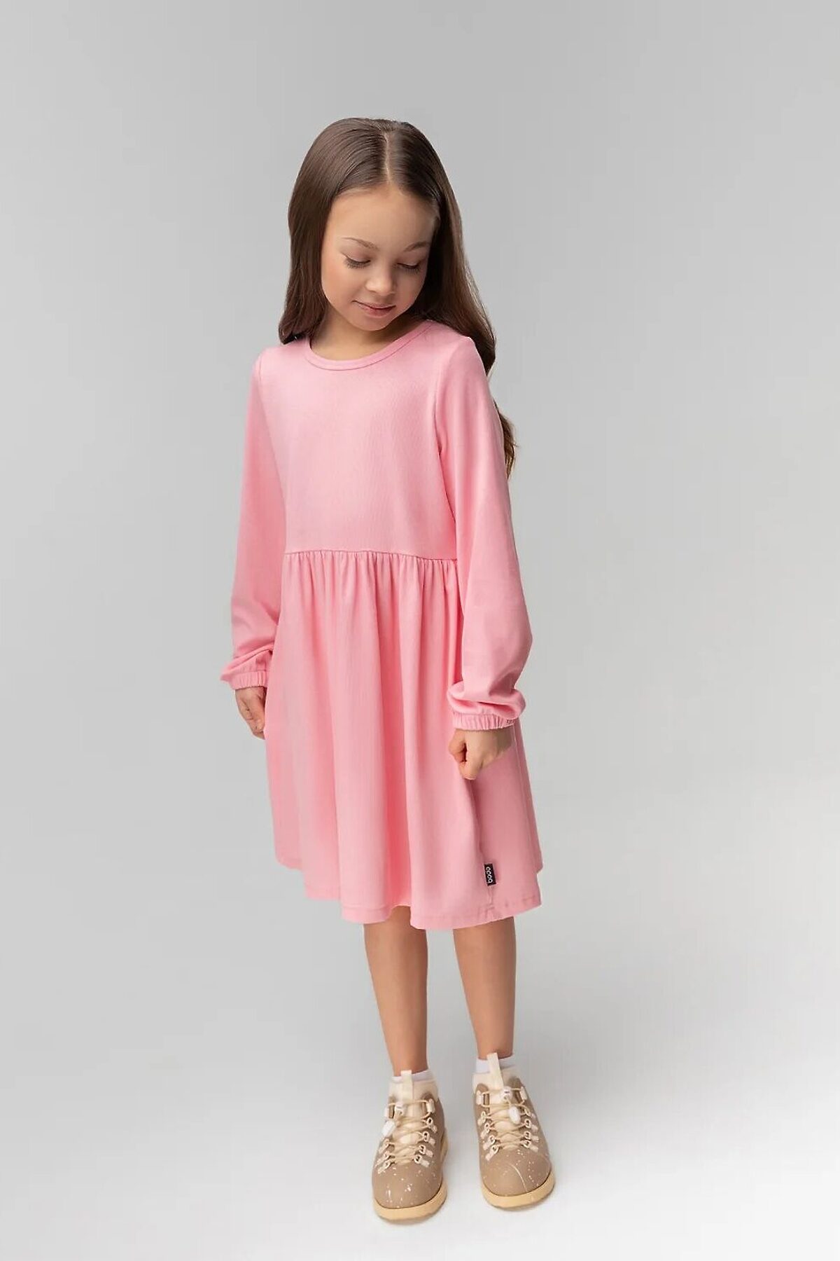 Платье трапециевидного силуэта, нижняя часть со сборкой. Платье с длинным рукавом. Горловина платья округлой формы.
