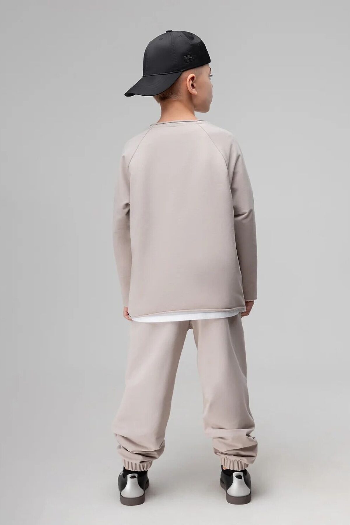 Свободный лонгслив с необработанными краями. Горловина округлой формы. Прямые, свободные брюки на поясе с внутренней резинкой. Низ брюк с манжетой на резинке. Брюки с боковыми карманами в боковых швах.