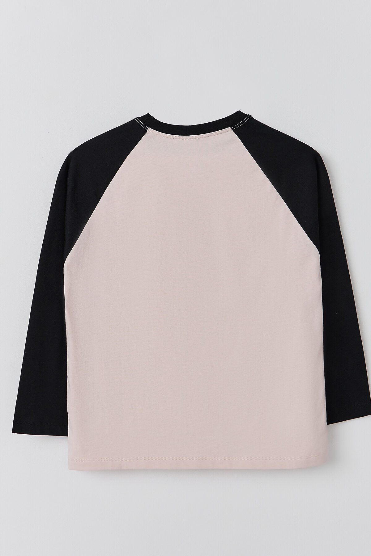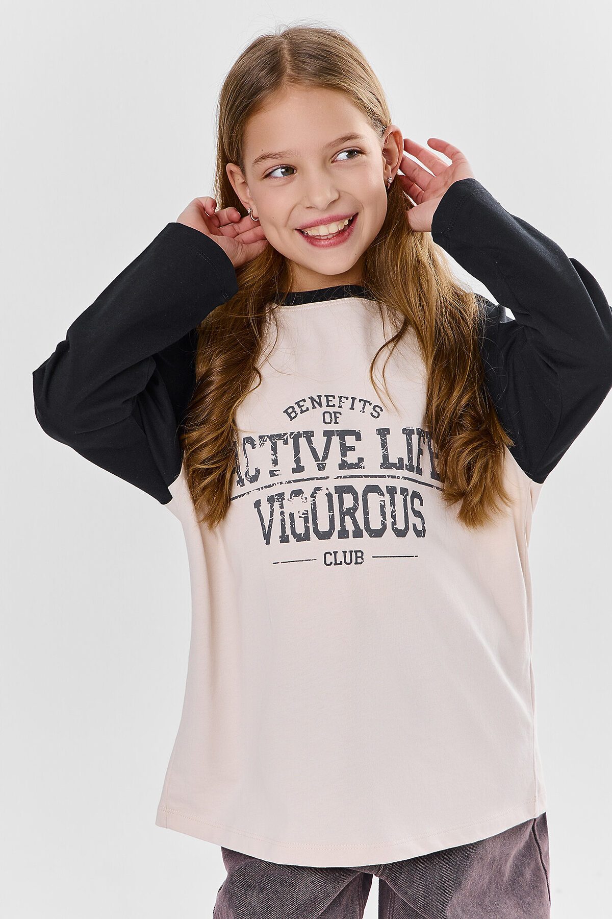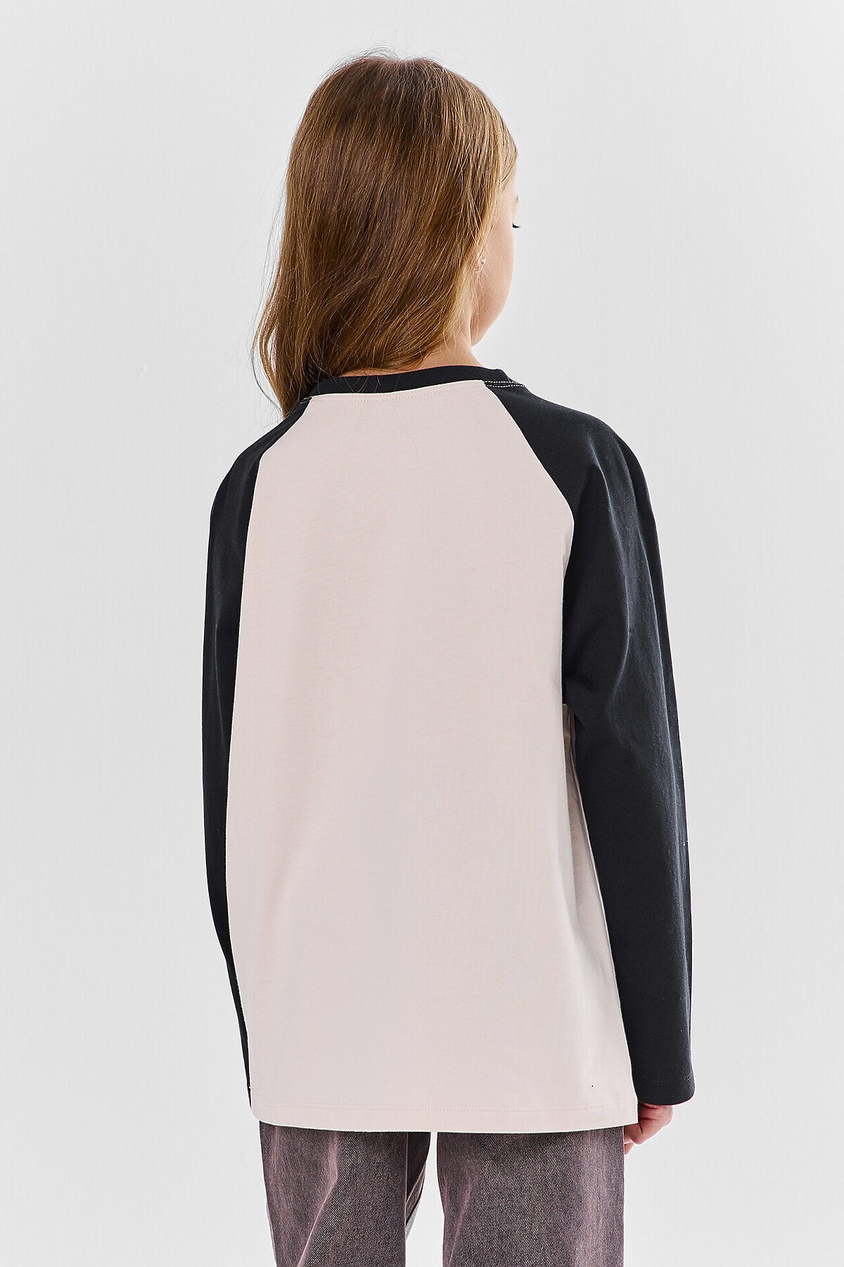 Джемпер для девочек свободного силуэта. Рукава длинные, реглан. Горловина круглой формы, обтачка из трикотажного полотна рибаны 2*2. По горловине отделочная строчка. Нижний срез рукавов и футболки застрочен швом в подгибку на двухигольной плоскошовной машине.