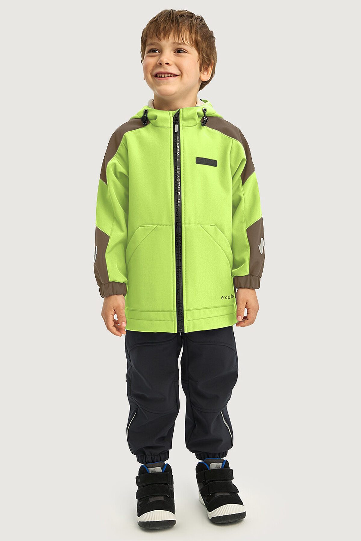 Ветровка для мальчика СКАЙЛАЙН из Softshell идеально подходит активным детям на прогулках, которые много двигаются и не сидят на месте. Softshell - это инновационный материал нового поколения, внешний слой которого защищает от влаги и ветра, внутренний слой из флиса сохраняет тепло и отводит лишнюю влагу, а промежуточный мембранный слой имеет хорошую паропроницаемость и позволяет коже дышать. Softshell приятный на ощупь, легкий и эластичный материал, не сковывающий движения ребенка.Функционал: - центральная застежка с влагоотталкивающей молнией, - ветрозащитная планка, - карманы, - капюшон с кулисой для регулировки объема. Мы все продумали до мелочей, поэтому модель оснащена:- кулисой по низу для регулировки объема изделия, - манжетами на резинке для защиты от проникновения холодного ветра, - светоотражающими элементами для безопасности ребенка в темное время суток.Когда носить? Весной и осенью с теплой поддевой, а также прохладным летом в качестве ветровки на футболку.Температурный режим от +5°С до +15°С.Уход за изделиями из Softshell аналогичен уходу за изделиями из мембранной ткани и достаточно прост — большинство загрязнений легко удаляются влажной салфеткой или щеткой с водой. Возможна машинная стирка при 30°С с использованием жидких средств для мембранной ткани. Отжим на минимальных оборотах, сушить на вешалке в расправленном виде.