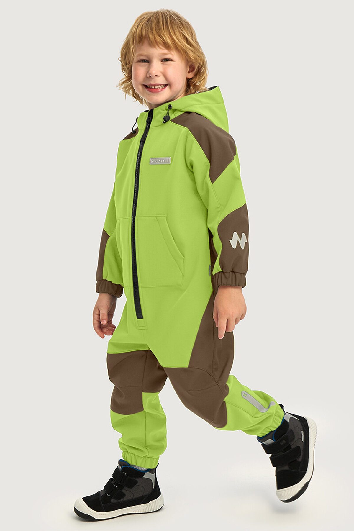 Комбинезоны ТРЕКИНГ из Softshell идеально подходят активным детям на прогулках, которые много двигаются и не сидят на месте. Softshell - это инновационный материал нового поколения, внешний слой которого защищает от влаги и ветра, внутренний слой из флиса сохраняет тепло и отводит лишнюю влагу, а промежуточный мембранный слой имеет хорошую паропроницаемость и позволяет коже дышать. Softshell приятный на ощупь, легкий и эластичный материал, не сковывающий движения ребенка.Функционал: - центральная застежка с влагоотталкивающей молнией, - ветрозащитная планка, - карман «кенгуру», - капюшон с кулисой для регулировки объема, - манжеты и низ брючин на резинке. Мы все продумали до мелочей, поэтому модель оснащена:- внутренними бретелями для возможности снять верхнюю часть изделия в помещении, - силиконовыми штрипками, - светоотражающими элементами для безопасности ребенка в темное время суток.Когда носить? Весной и осенью с теплой поддевой, а также прохладным летом на футболку.Температурный режим от +5°С до +15°С.Уход за изделиями из Softshell аналогичен уходу за изделиями из мембранной ткани и достаточно прост - большинство загрязнений легко удаляются влажной салфеткой или щеткой с водой. Возможна машинная стирка при 30°С с использованием жидких средств для мембранной ткани. Отжим на минимальных оборотах, сушить на вешалке в расправленном виде.