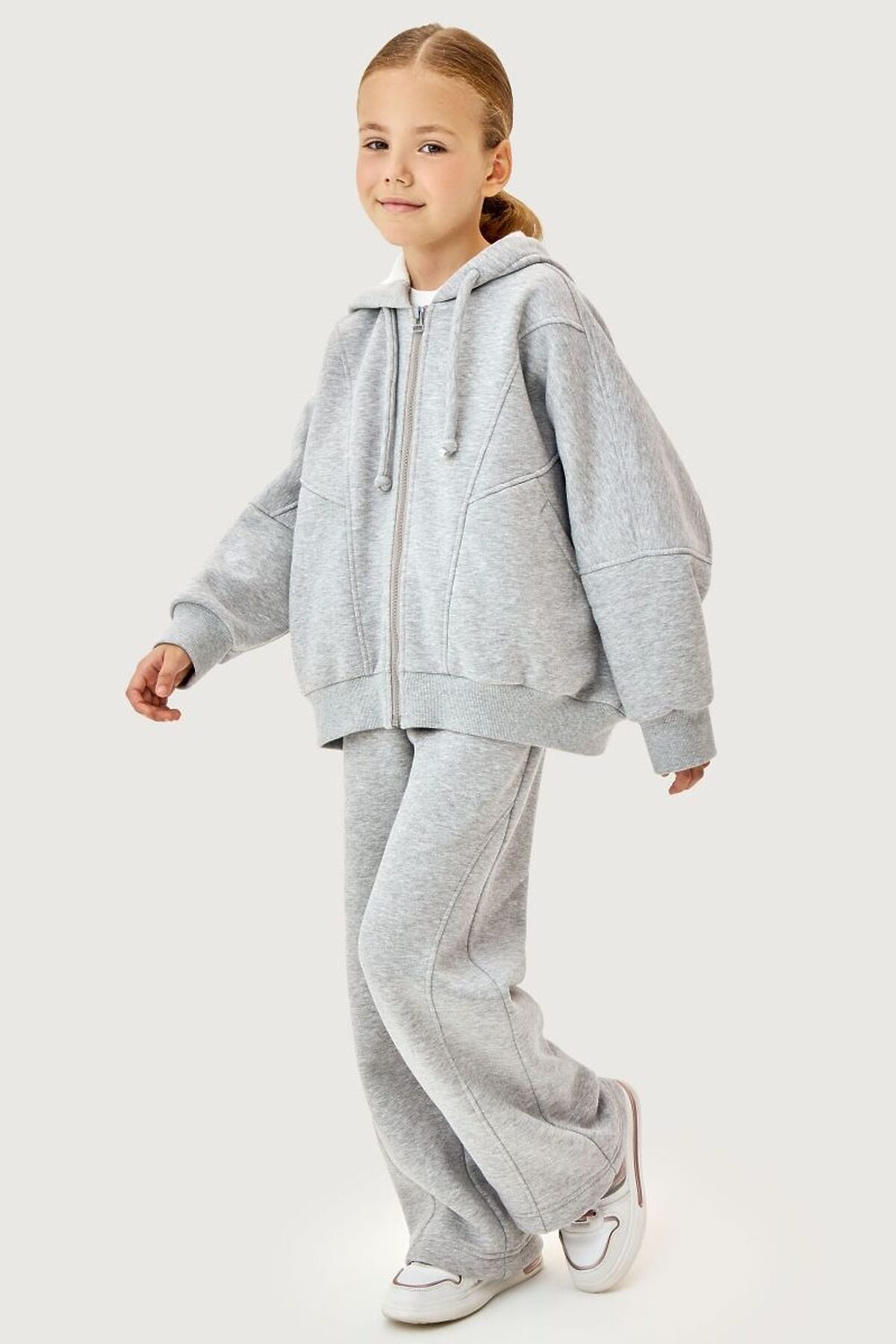 Костюм ФЛАЙ из плотного хлопкового трикотажа с мягким стриженным начесом внутри. Состоит двух предметов — толстовки и брюк. Толстовка свободного силуэта, с застежкой на молнию, с объемным капюшоном, карманами. Манжеты и пояс из трикотажного полотна «кашкорсе».
