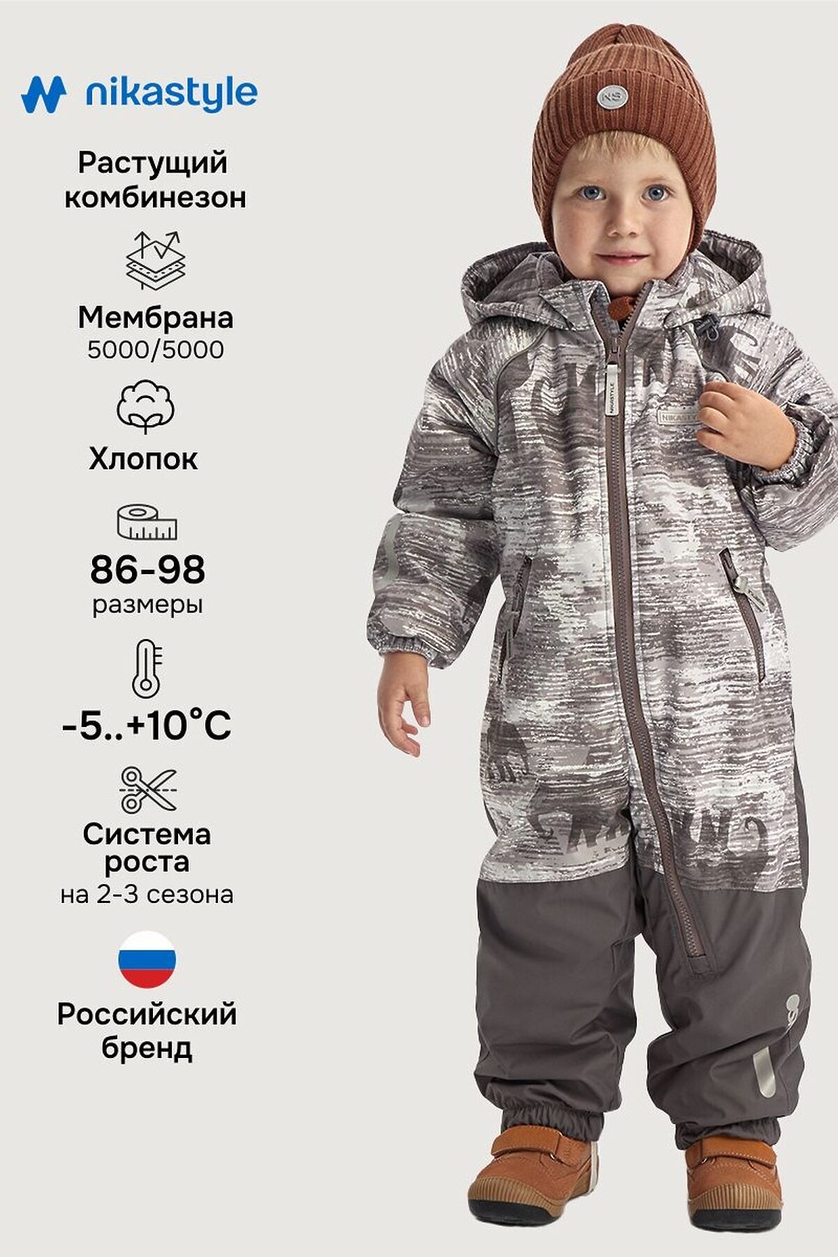 Комбинезон САВАННА с системой роста на один размер (длина рукавов и брючин увеличивается на 4-5см).Комбинезон из мембранной ткани 5000/5000 с водо- грязеотталкивающей технологией TEFLON.Мембранная ткань - это непродуваемый и водонепроницаемый материал, который надежно защитит от ветра и влаги. Благодаря дышащим свойствам мембраны ребенку будет комфортно в любую погоду, и он не вспотеет. Ткань обработана снаружи экологически чистым протектором TEFLON для защиты от воды и грязи. Мембрана в сочетании с утеплителем нового поколения FIBERlite сохранит тепло во время прогулок, позволит телу дышать. Хлопковая подкладка обеспечит повышенный комфорт для ребенка.Функционал: - длинная центральная застежка обеспечивает легкое одевание малыша, - ветрозащитная планка, - карманы на молнии, - капюшон с кулисой для регулировки объема, - резинка на спинке для создания силуэта. Мы все продумали до мелочей, поэтому модель дополнительно оснащена:- манжетами на резинке, силиконовыми штрипками, - внутренними бретелями для возможности снять верхнюю часть изделия в помещении, - светоотражающими элементами для безопасности ребенка в темное время суток. Внутренняя сторона манжета из флиса, шов сидения проклеен, низ брюк на резинке.В комбинезоне предусмотрена СИСТЕМА РОСТА. Удлинить рукава и штанины можно, удалив строчку на подкладке и комбинезон подрастет вместе с ребенком. Комфортная температура эксплуатации от -5°С до +10°С. Рекомендуем приобрести комплектом аксессуары, обувь и другие вещи из капсулы в карточке товара, которые отлично сочетаются с изделиями коллекции.