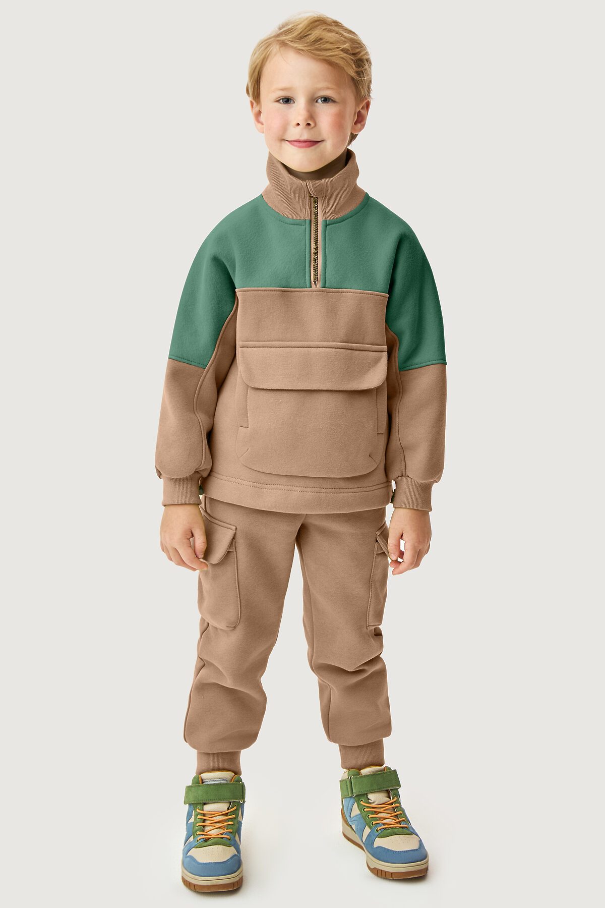 Костюм ХИП-ХОП из плотного хлопкового трикотажа с мягким стриженным начесом внутри. Состоит из двух предметов — анорака и брюк. Анорак свободного силуэта, воротник-стойка на молнии, большой накладной карман с боковыми входами. Манжеты, пояс и воротник из трикотажного полотна «кашкорсе». Брюки свободного силуэта, зауженные к низу, с боковыми карманами и накладными карманами, с трикотажными манжетами. Пояс с резинкой и со шнуром, для дополнительной регулировки объема по талии. Пояс и манжеты из трикотажного полотна «кашкорсе».Комплект можно носить в качестве самостоятельной одежды при t° от +10°С до +20°С, а также в качестве второго слоя под верхнюю одежду.Прекрасный вариант для прогулок и активного отдыха, в поездках просто незаменим. Комплект станет любимой вещью в гардеробе вашего ребенка. Рекомендуется предварительная стирка для удаления лишнего ворса с изделия.