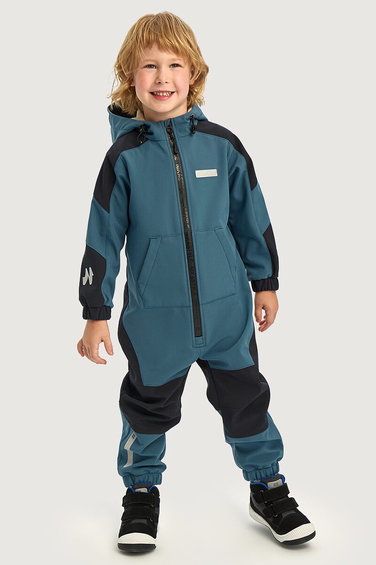 Комбинезоны ТРЕКИНГ из Softshell идеально подходят активным детям на прогулках, которые много двигаются и не сидят на месте. Softshell - это инновационный материал нового поколения, внешний слой которого защищает от влаги и ветра, внутренний слой из флиса сохраняет тепло и отводит лишнюю влагу, а промежуточный мембранный слой имеет хорошую паропроницаемость и позволяет коже дышать. Softshell приятный на ощупь, легкий и эластичный материал, не сковывающий движения ребенка.Функционал: - центральная застежка с влагоотталкивающей молнией, - ветрозащитная планка, - карман «кенгуру», - капюшон с кулисой для регулировки объема, - манжеты и низ брючин на резинке. Мы все продумали до мелочей, поэтому модель оснащена:- внутренними бретелями для возможности снять верхнюю часть изделия в помещении, - силиконовыми штрипками, - светоотражающими элементами для безопасности ребенка в темное время суток.Когда носить? Весной и осенью с теплой поддевой, а также прохладным летом на футболку.Температурный режим от +5°С до +15°С.Уход за изделиями из Softshell аналогичен уходу за изделиями из мембранной ткани и достаточно прост - большинство загрязнений легко удаляются влажной салфеткой или щеткой с водой. Возможна машинная стирка при 30°С с использованием жидких средств для мембранной ткани. Отжим на минимальных оборотах, сушить на вешалке в расправленном виде.