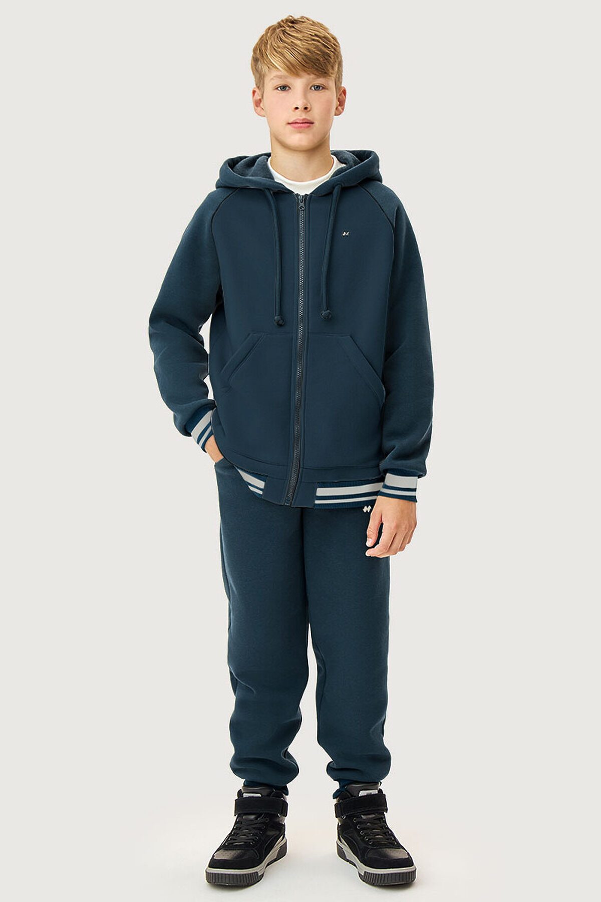 Костюм КОЛЛЕДЖ из плотного хлопкового трикотажа с мягким стриженным начесом внутри. Состоит из двух предметов — толстовки и брюк. Толстовка свободного силуэта, на молнии, с капюшоном, с карманами «кенгуру». Манжеты и пояс из трикотажного полотна «кашкорсе». Брюки свободного силуэта, зауженные к низу, с боковыми карманами, с трикотажными манжетами. Пояс с резинкой и со шнуром, для дополнительной регулировки объема по талии. Манжеты и пояс из трикотажного полотна «кашкорсе».Костюм можно носить в качестве самостоятельной одежды при t° от +10°С до +20°С, а также в качестве второго слоя под верхнюю одежду.Прекрасный вариант для занятий спортом, прогулок и активного отдыха, в поездках просто незаменим. Комплект станет любимой вещью в гардеробе вашего ребенка. Рекомендуется предварительная стирка для удаления лишнего ворса с изделия.