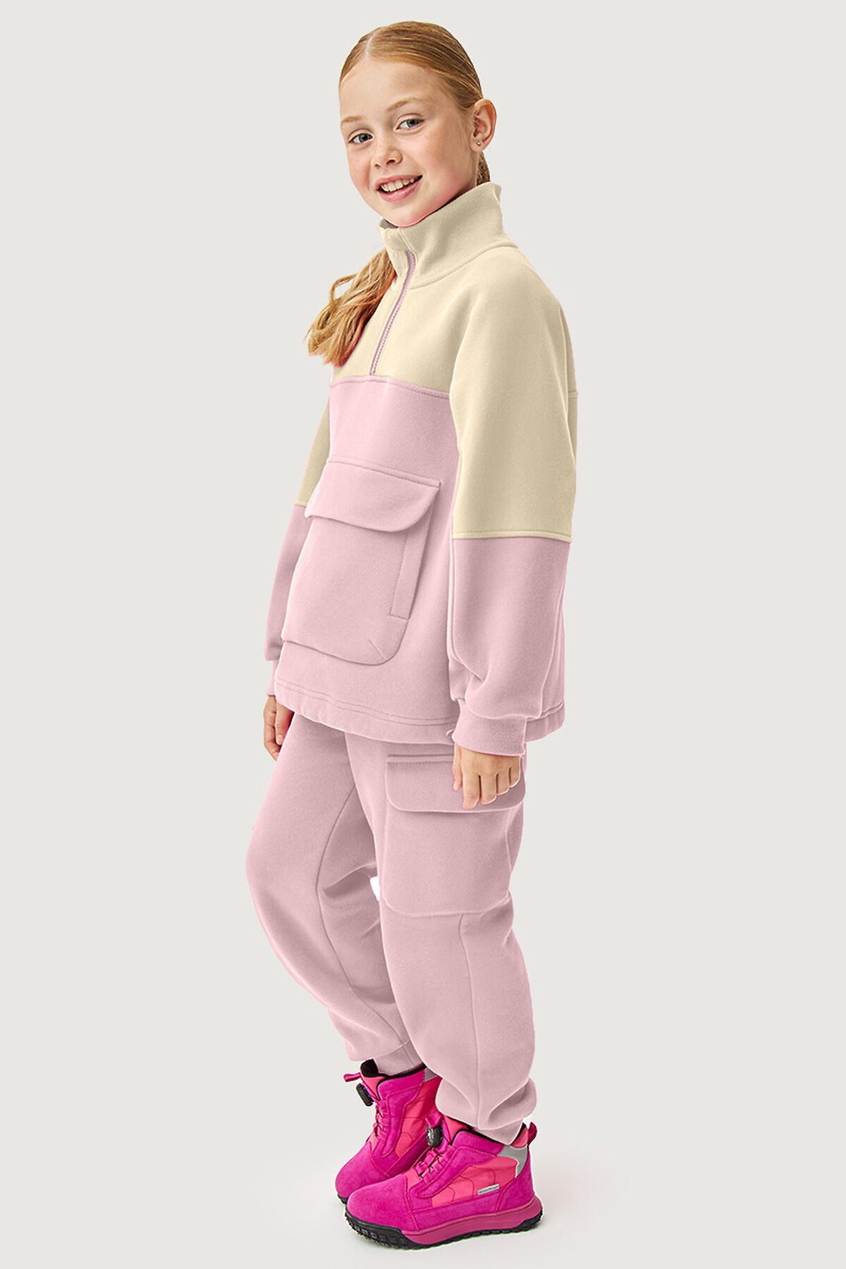 Костюм ХИП-ХОП из плотного хлопкового трикотажа с мягким стриженным начесом внутри. Состоит из двух предметов — анорака и брюк. Анорак свободного силуэта, воротник-стойка на молнии, большой накладной карман с боковыми входами. Манжеты, пояс и воротник из трикотажного полотна «кашкорсе». Брюки свободного силуэта, зауженные к низу, с боковыми карманами и накладными карманами, с трикотажными манжетами. Пояс с резинкой и со шнуром, для дополнительной регулировки объема по талии. Пояс и манжеты из трикотажного полотна «кашкорсе».Комплект можно носить в качестве самостоятельной одежды при t° от +10°С до +20°С, а также в качестве второго слоя под верхнюю одежду.Прекрасный вариант для прогулок и активного отдыха, в поездках просто незаменим. Комплект станет любимой вещью в гардеробе вашего ребенка. Рекомендуется предварительная стирка для удаления лишнего ворса с изделия.