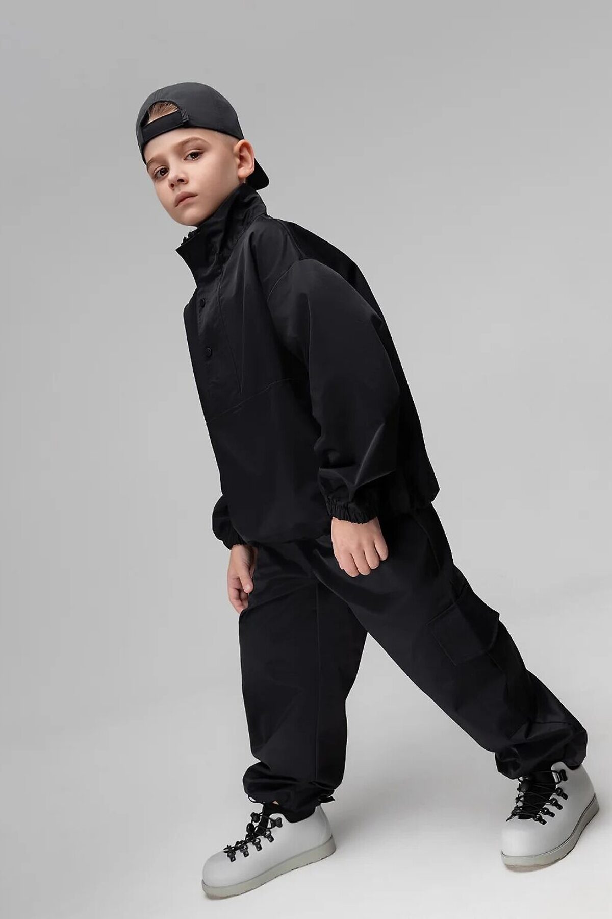 Свободная куртка без подклада на молнии с планкой на кнопках. Рукава с манжетой на резинке. По низу куртки имеется утяжка. Свободные, прямые брюки на поясе с внутренней резинкой. Брюки с двумя видами карман, боковые карманы и накладной карман по левому боковому шву закрытый клапаном, по низу брюк имеется дополнительная резинка с фиксатором для затяжки.