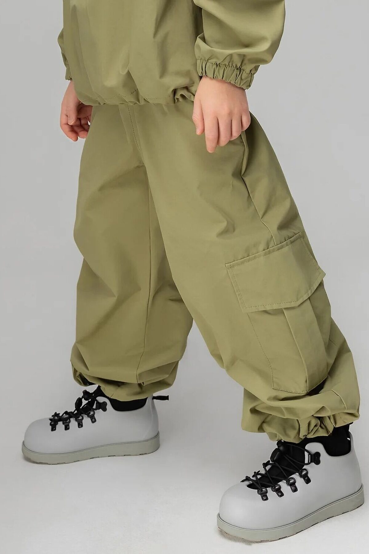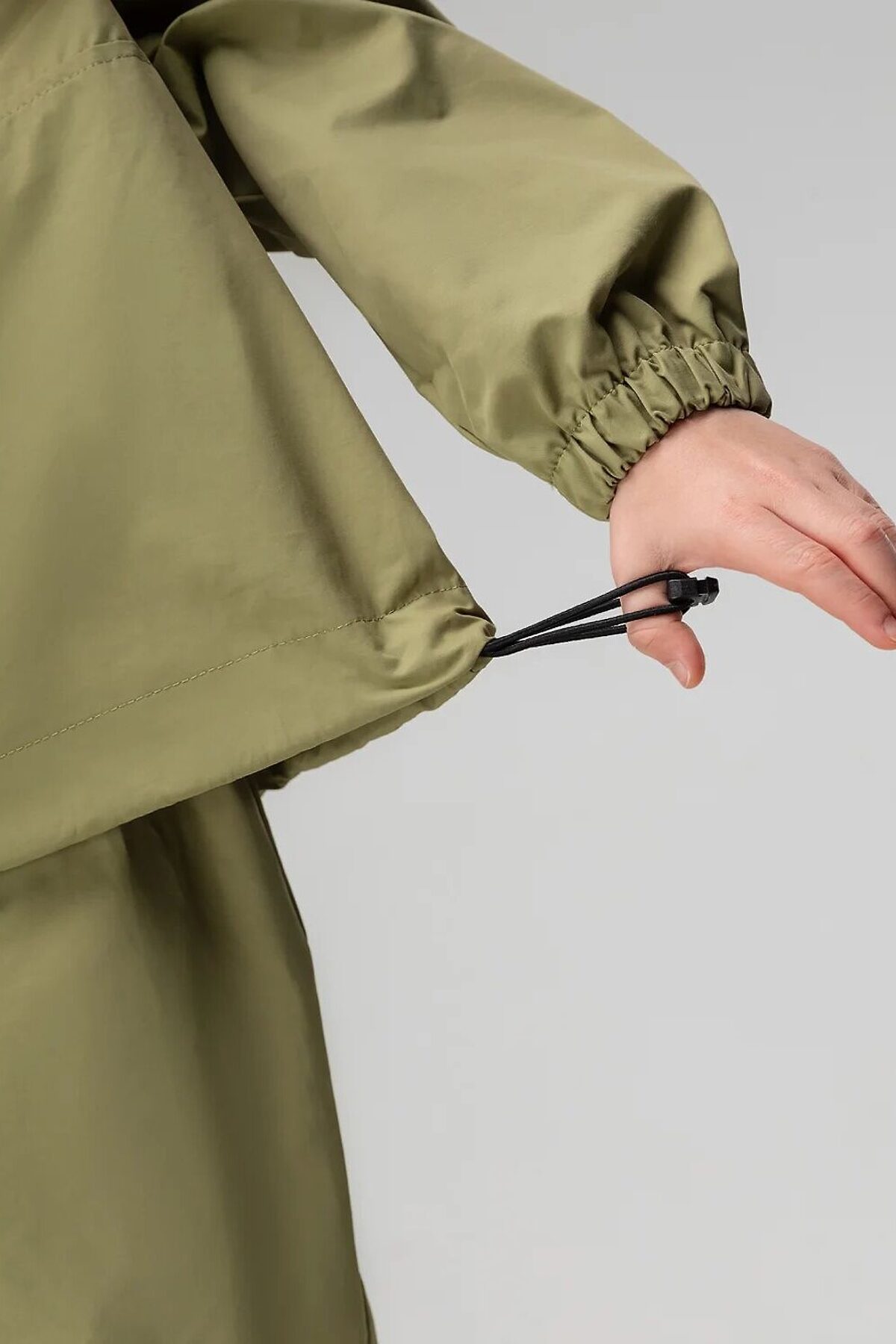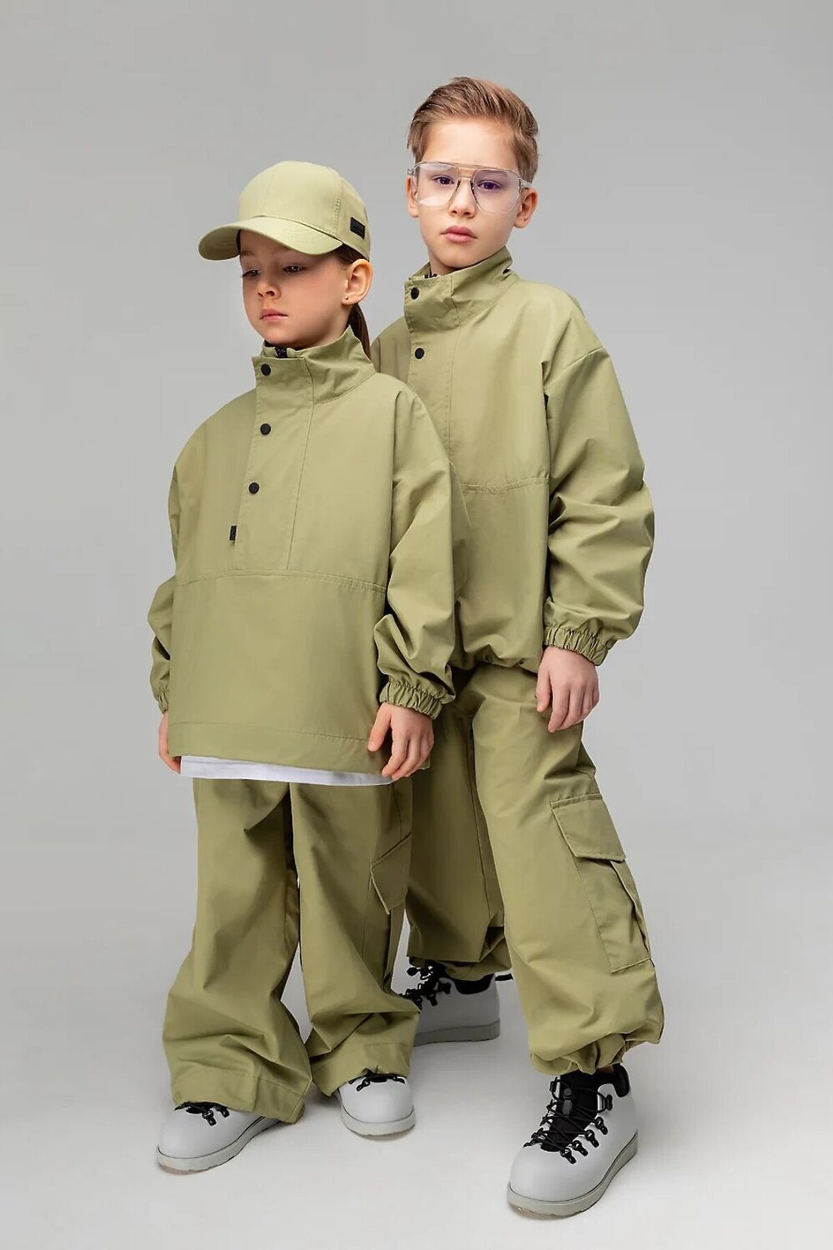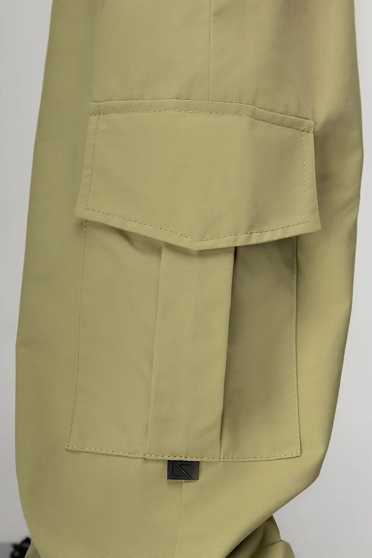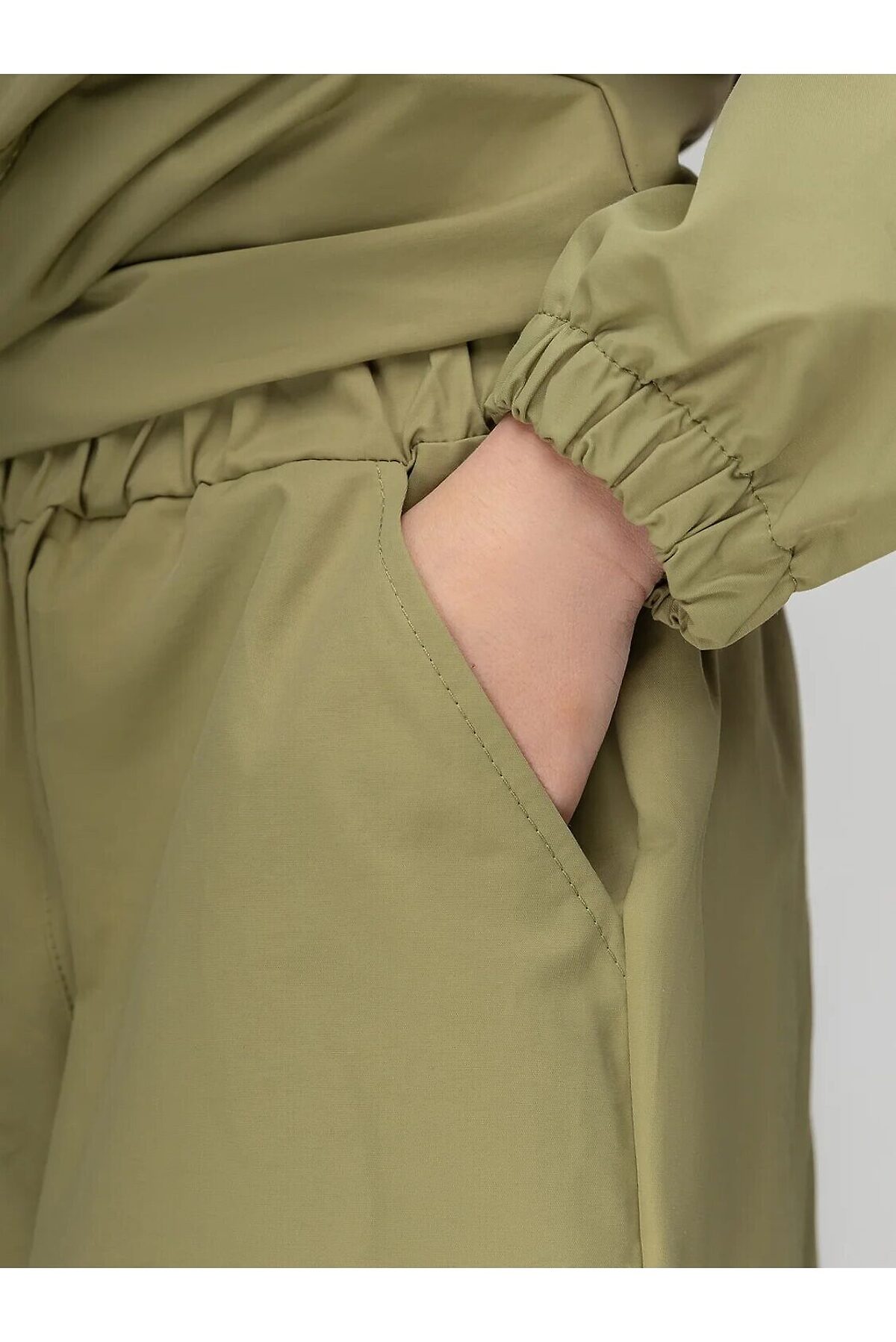 Свободная куртка без подклада на молнии с планкой на кнопках. Рукава с манжетой на резинке. По низу куртки имеется утяжка. Свободные, прямые брюки на поясе с внутренней резинкой. Брюки с двумя видами карман, боковые карманы и накладной карман по левому боковому шву закрытый клапаном, по низу брюк имеется дополнительная резинка с фиксатором для затяжки.
