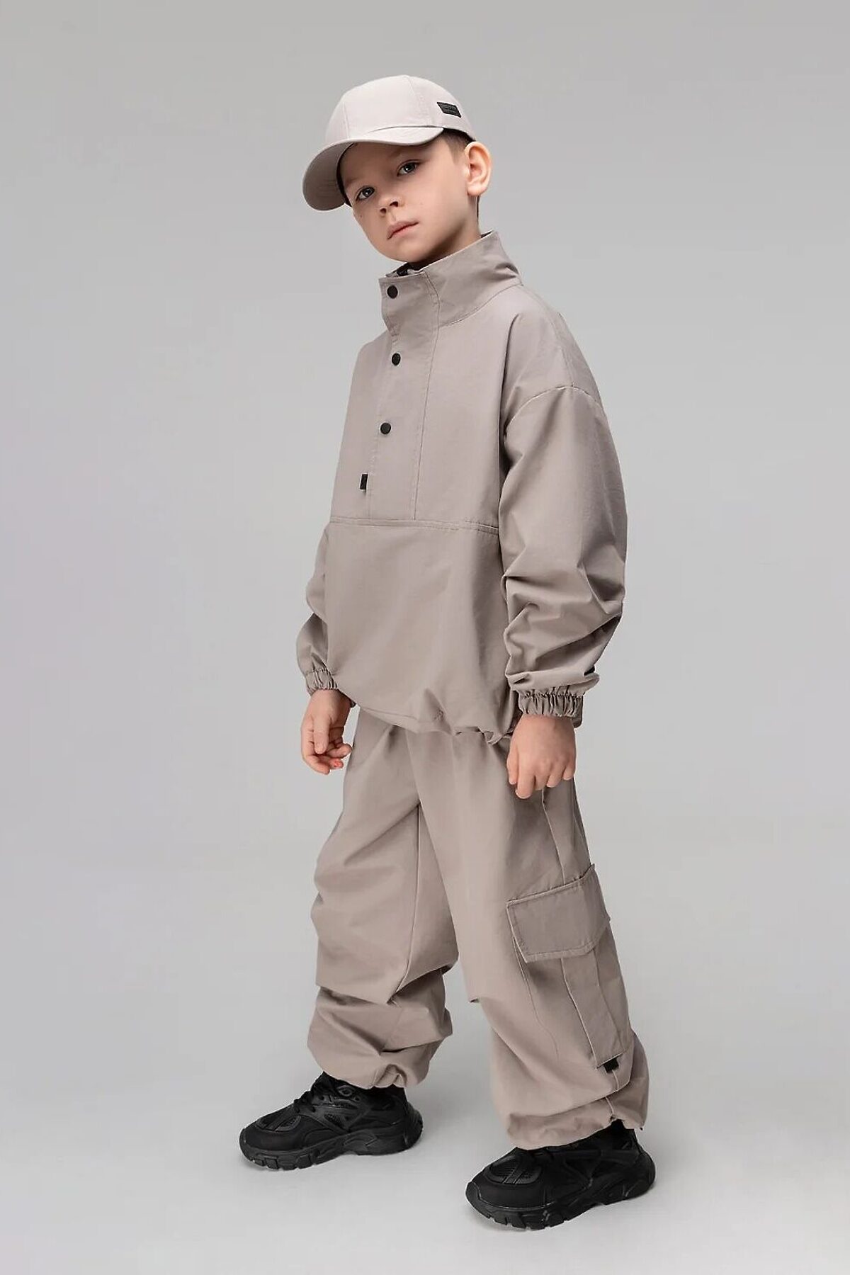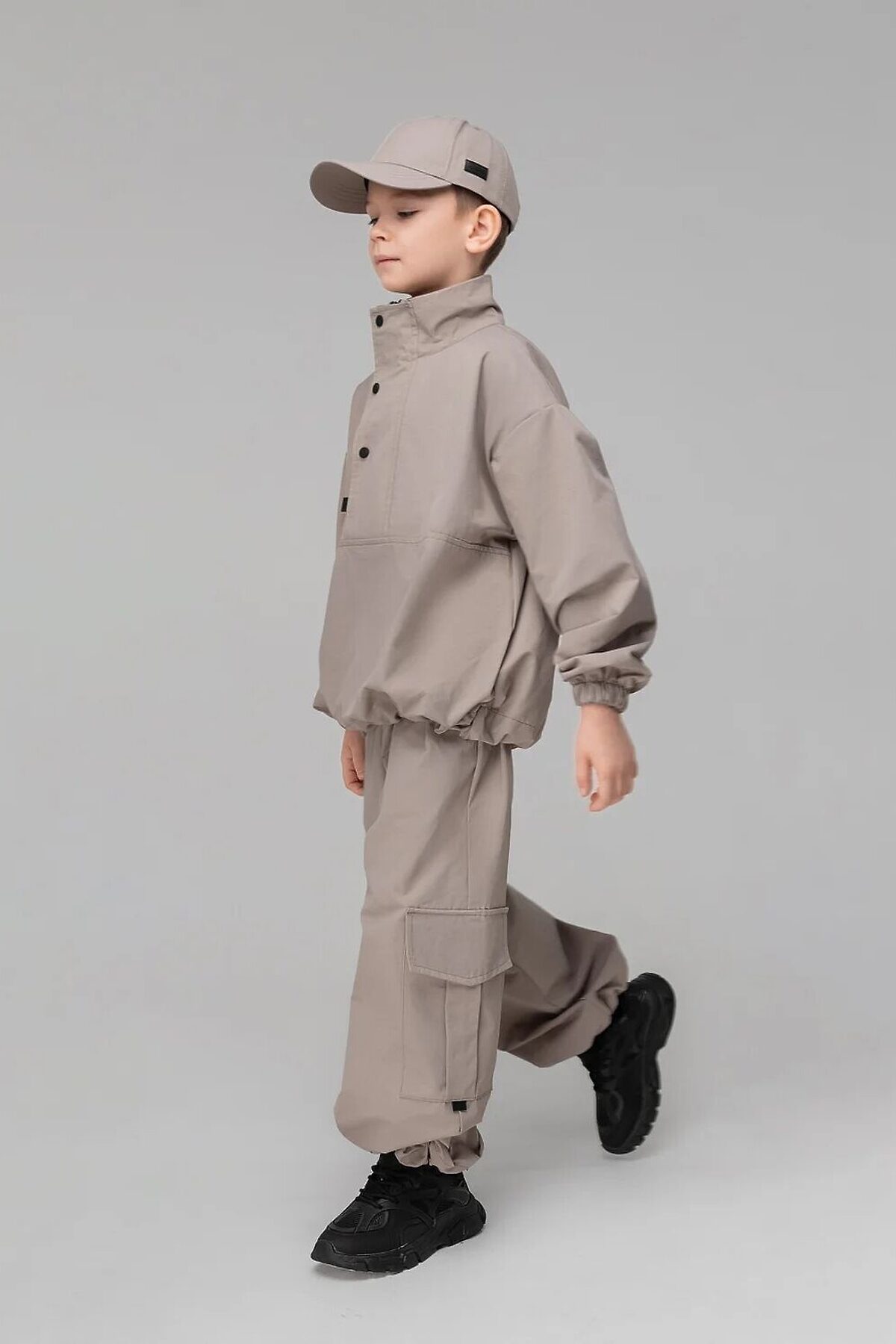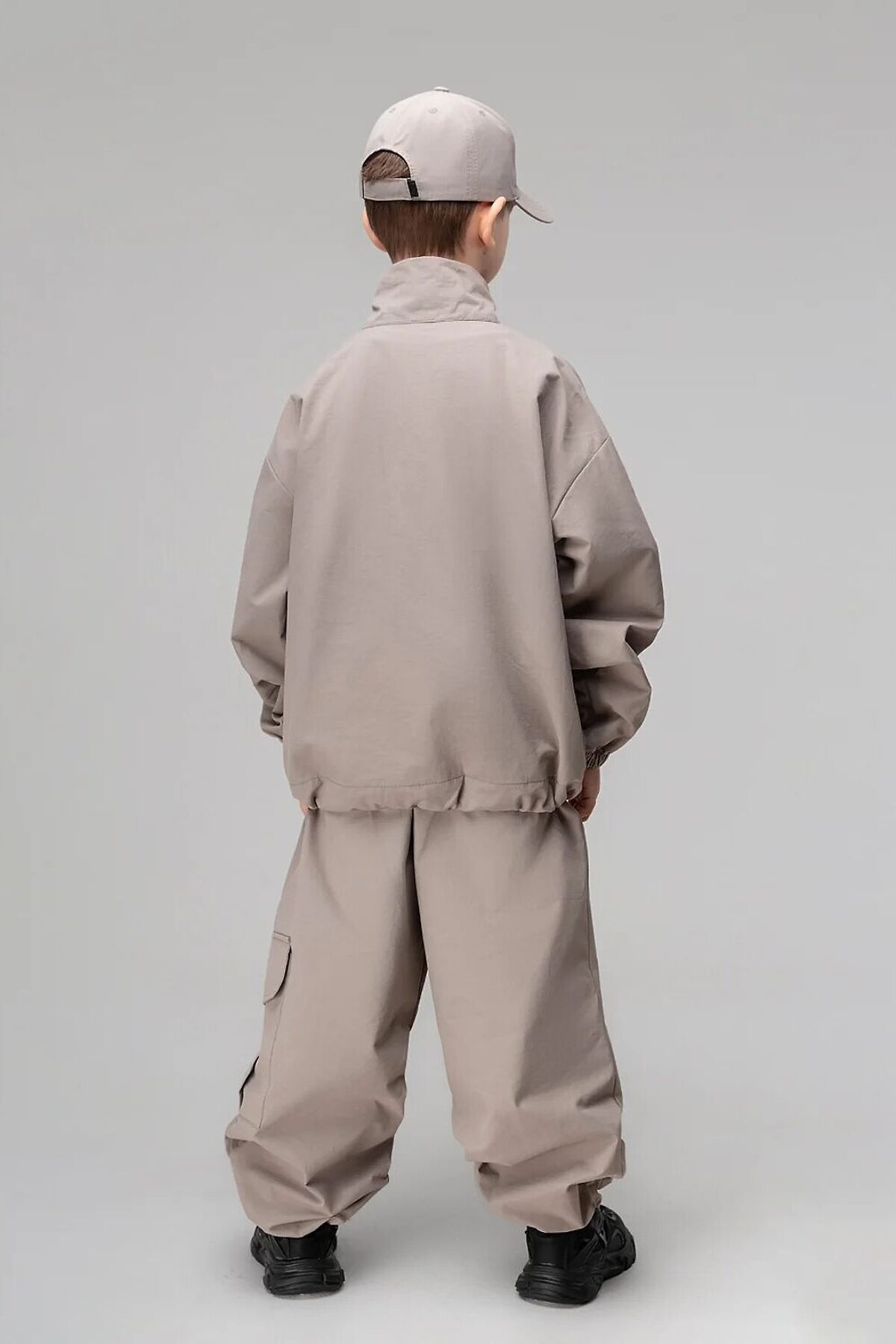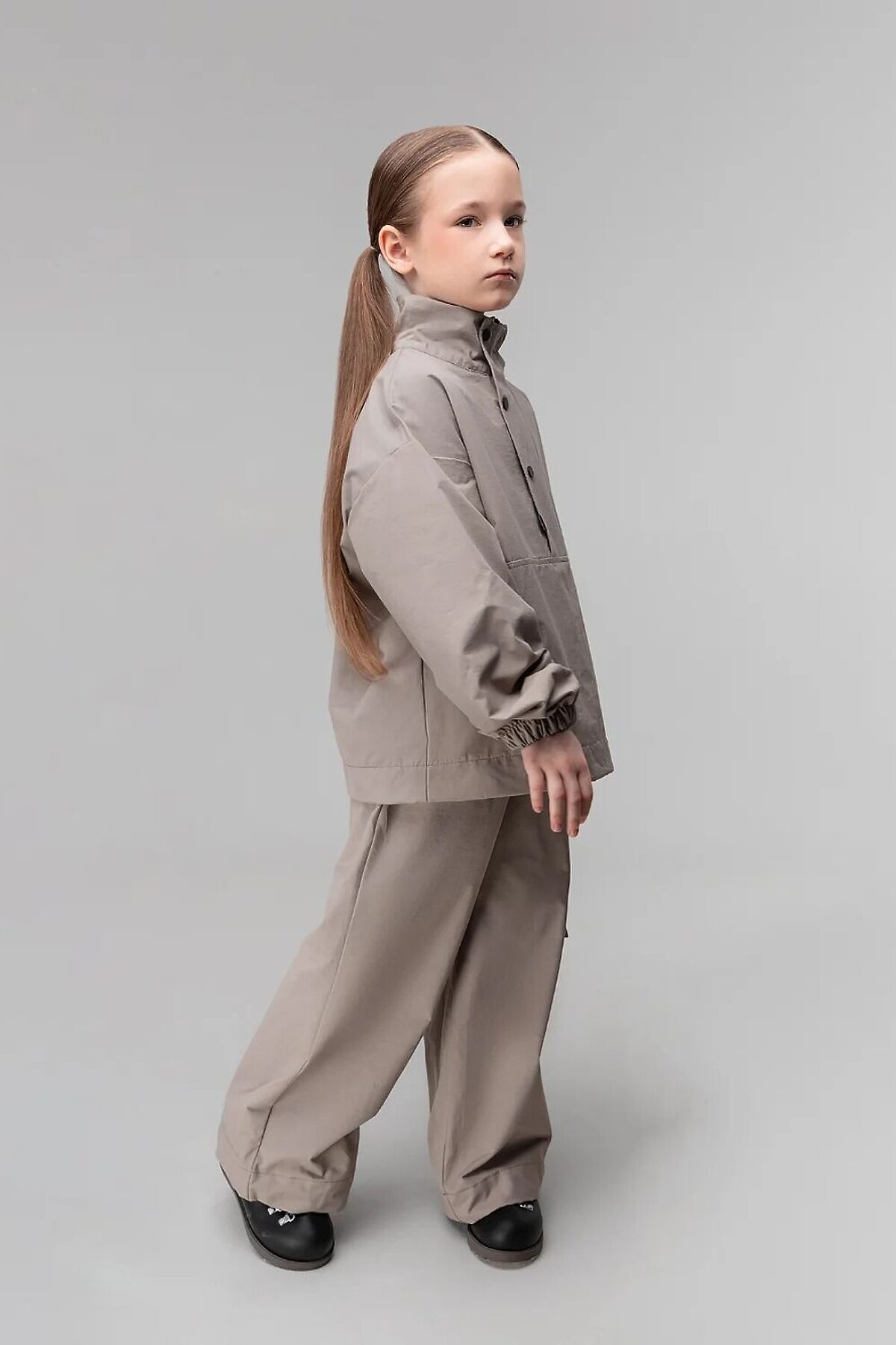 Свободная куртка без подклада на молнии с планкой на кнопках. Рукава с манжетой на резинке. По низу куртки имеется утяжка. Свободные, прямые брюки на поясе с внутренней резинкой. Брюки с двумя видами карман, боковые карманы и накладной карман по левому боковому шву закрытый клапаном, по низу брюк имеется дополнительная резинка с фиксатором для затяжки.