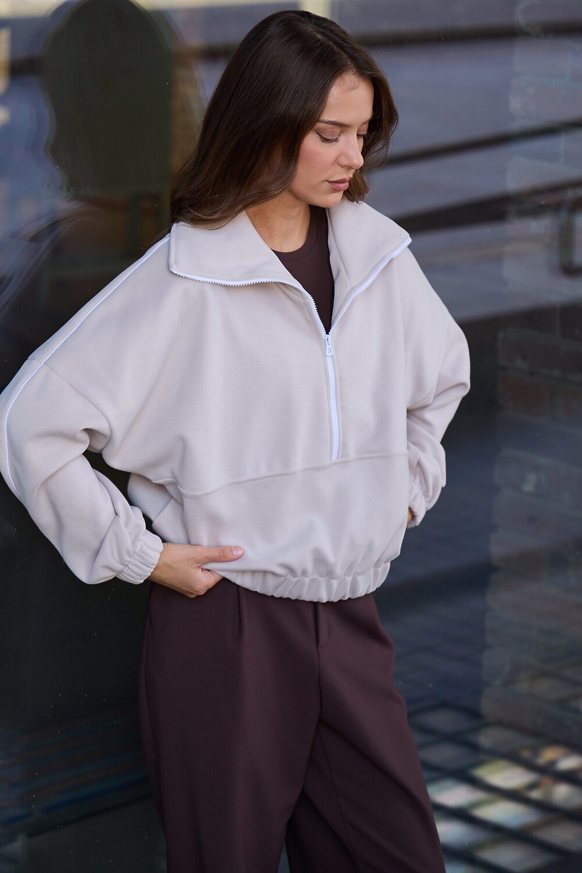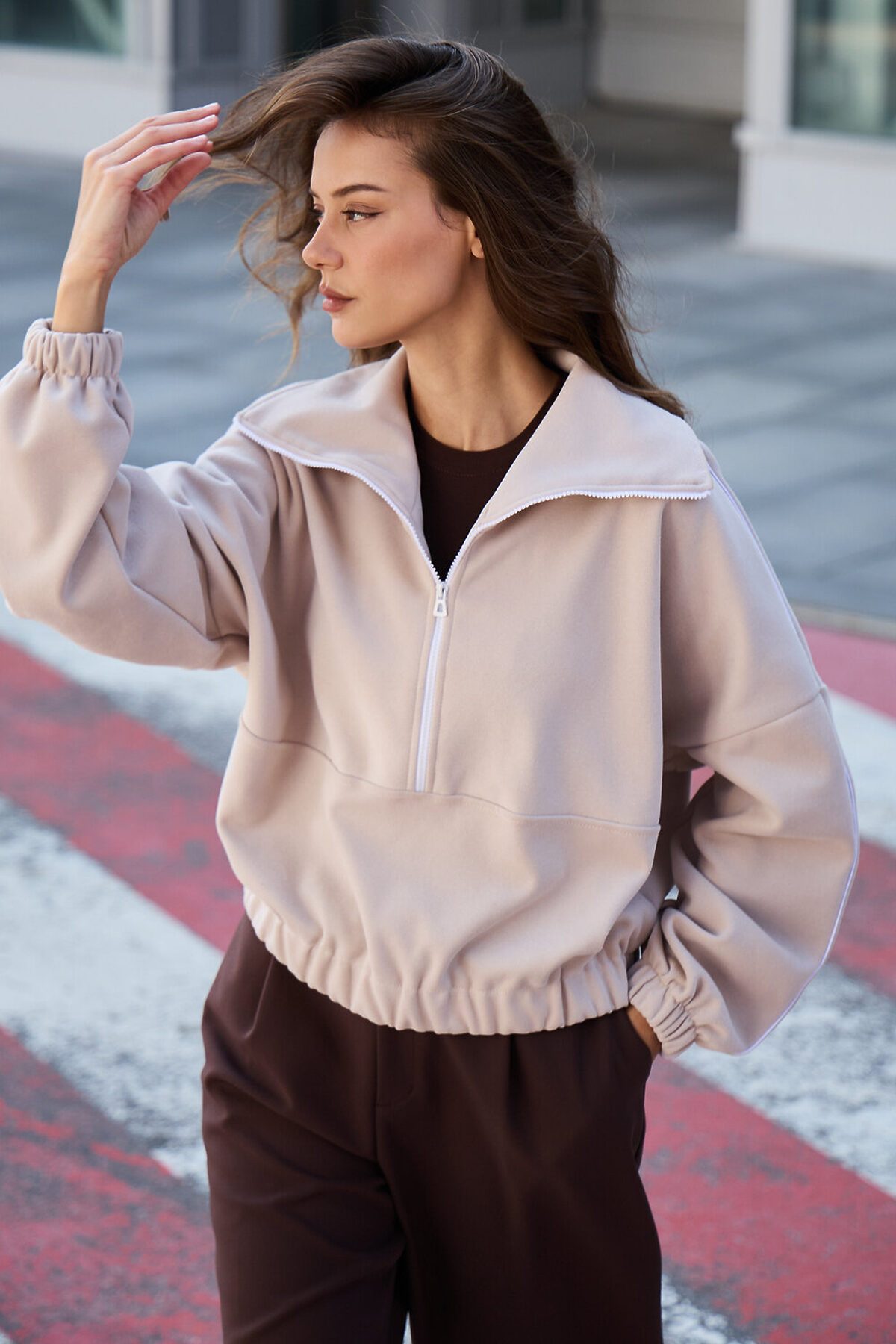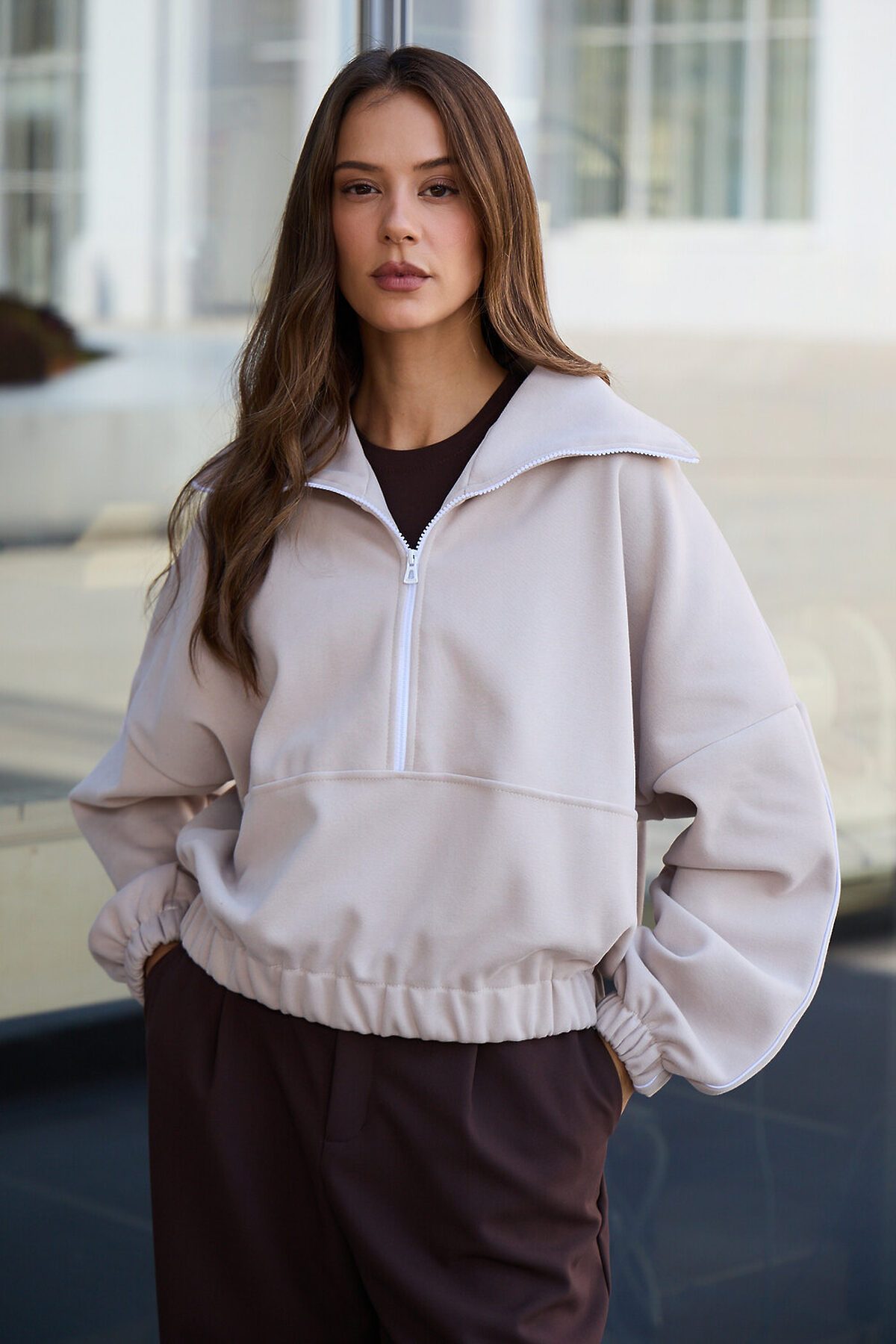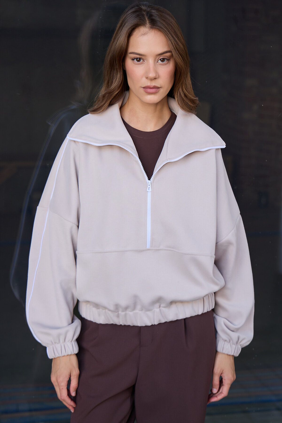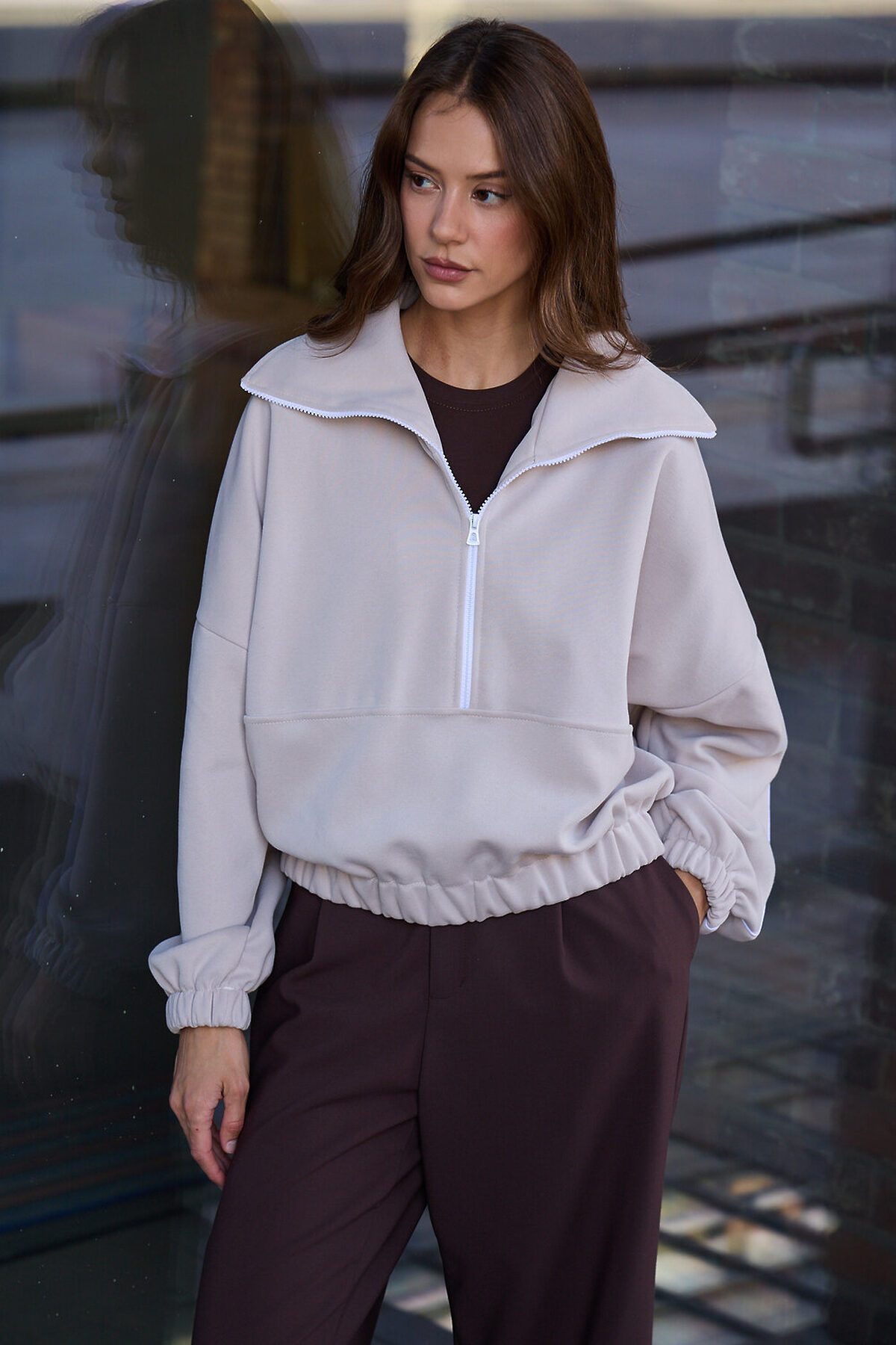 Свитшот это воплощение комфорта и стиля, универсальная толстовка свободного кроя, часто дополненная высоким воротником на молнии. Однотонный свитшот лаконичный манифест моды, бессмертный элемент гардероба, сохраняющий актуальность даже в своей минималистичной чистоте. Декоративный контрастный кант и изящная полузастежка-молния превращают обыденную вещь в предмет дизайнерского искусства. Такая кофта легко вольется в ритм повседневной жизни, став незаменимой частью базового гардероба. Благодаря расслабленному крою oversize, удлиненным рукавам и эластичной резинке по низу, свитшот словно создан для любой фигуры, деликатно подчеркивая достоинства и скрывая недостатки, будь то хрупкий силуэт или пышные формы. P.S: Данные по длине рукава с учетом длины плеча.
