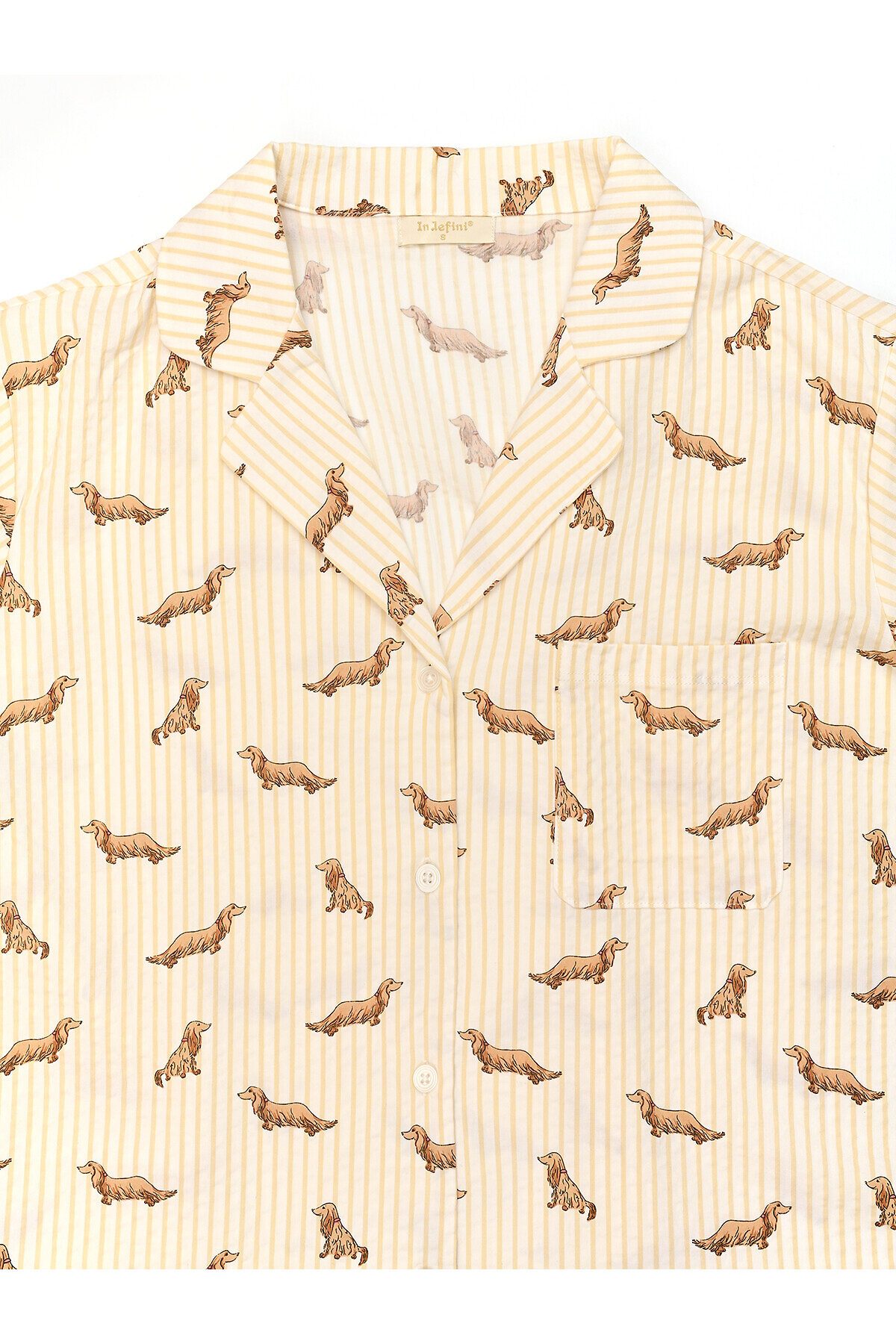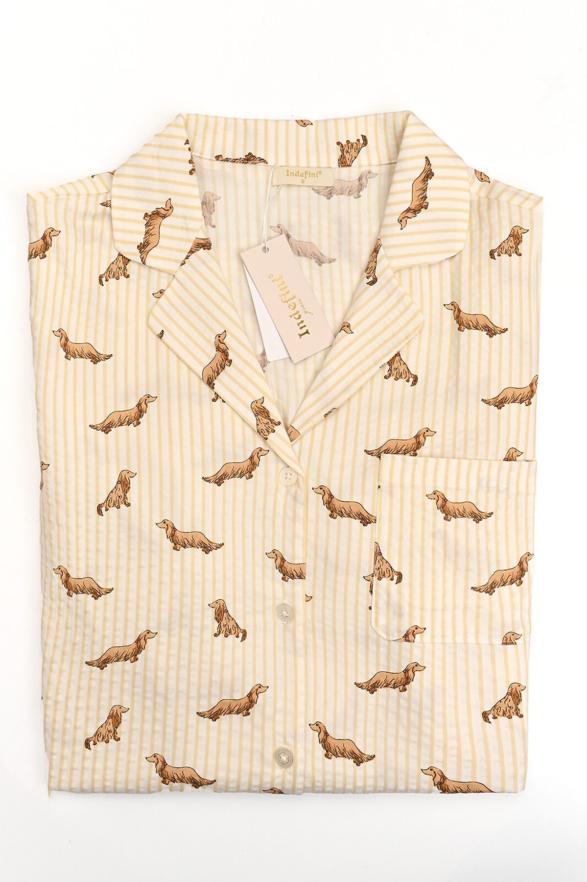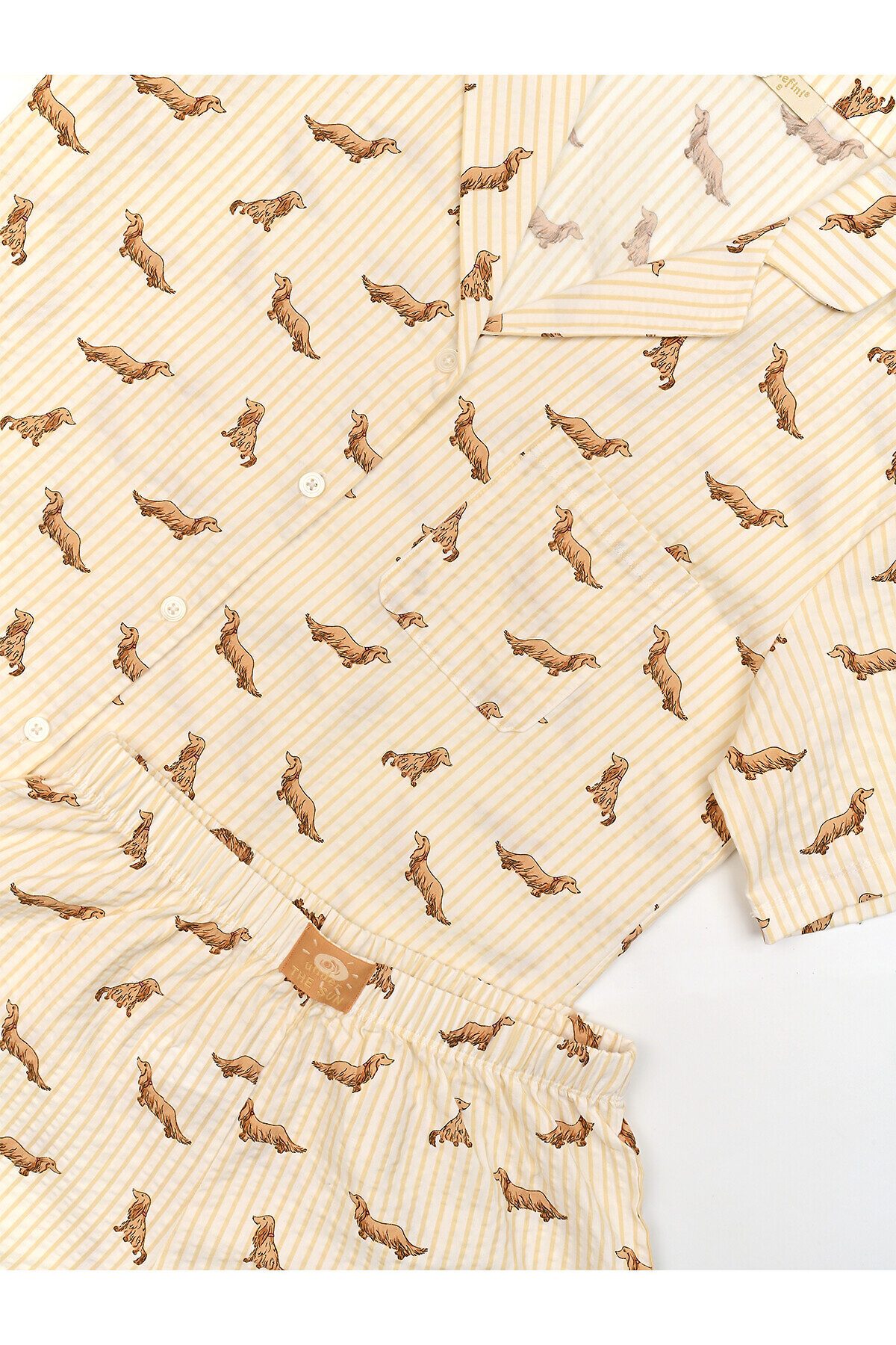 Пижама в молочном оттенке с принтом. Сшита из нежной к коже вискозе и дышащего хлопка, подходит для любого времени года. Рубашка прямого кроя с пуговицами в тон и аккуратным нагрудным карманом. Шорты с плотной эластичной лентой.