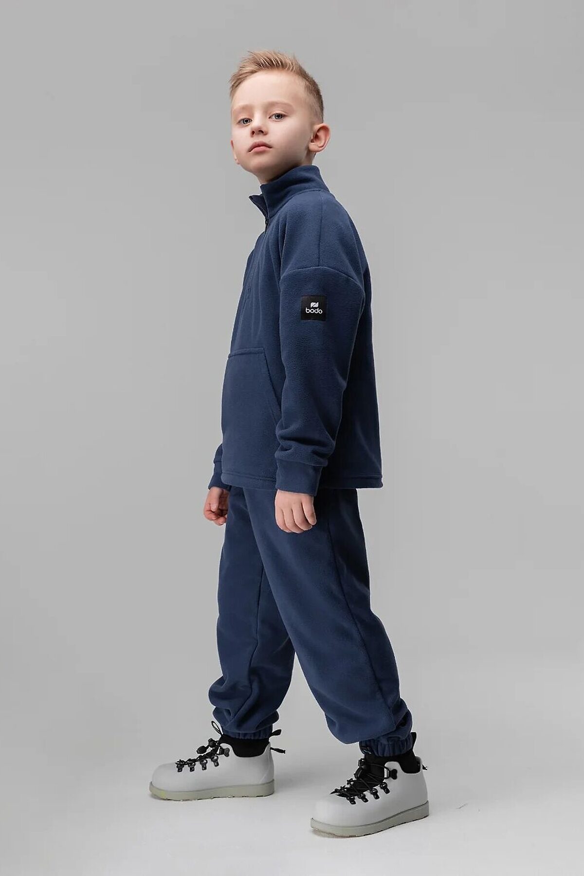 Костюм флисовый для детей дошкольного возраста. Толстовка без подкладки, прямого силуэта со спущенным плечом и втачными рукавами с притачной манжетой, воротник стойка, застёгивается на короткую молнию по центру полочки, на полочке расположен накладной карман — кенгуру. Брюки прямые свободные на притачном поясе с внутренней резинкой, на цельнокроеной манжете по низу изделия с внутренней резинкой, брюки без карманов. Состав: флис 100% полиэстер