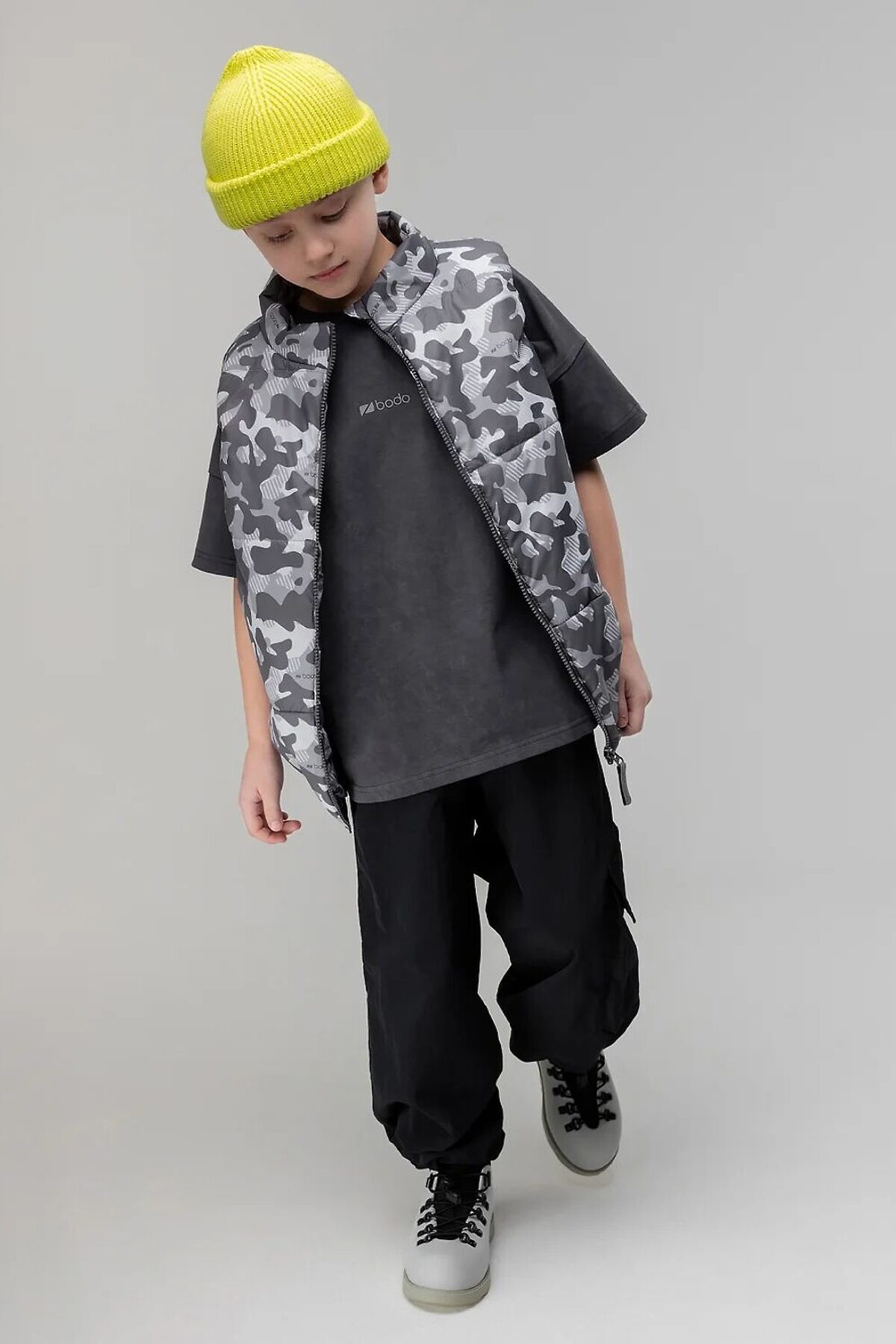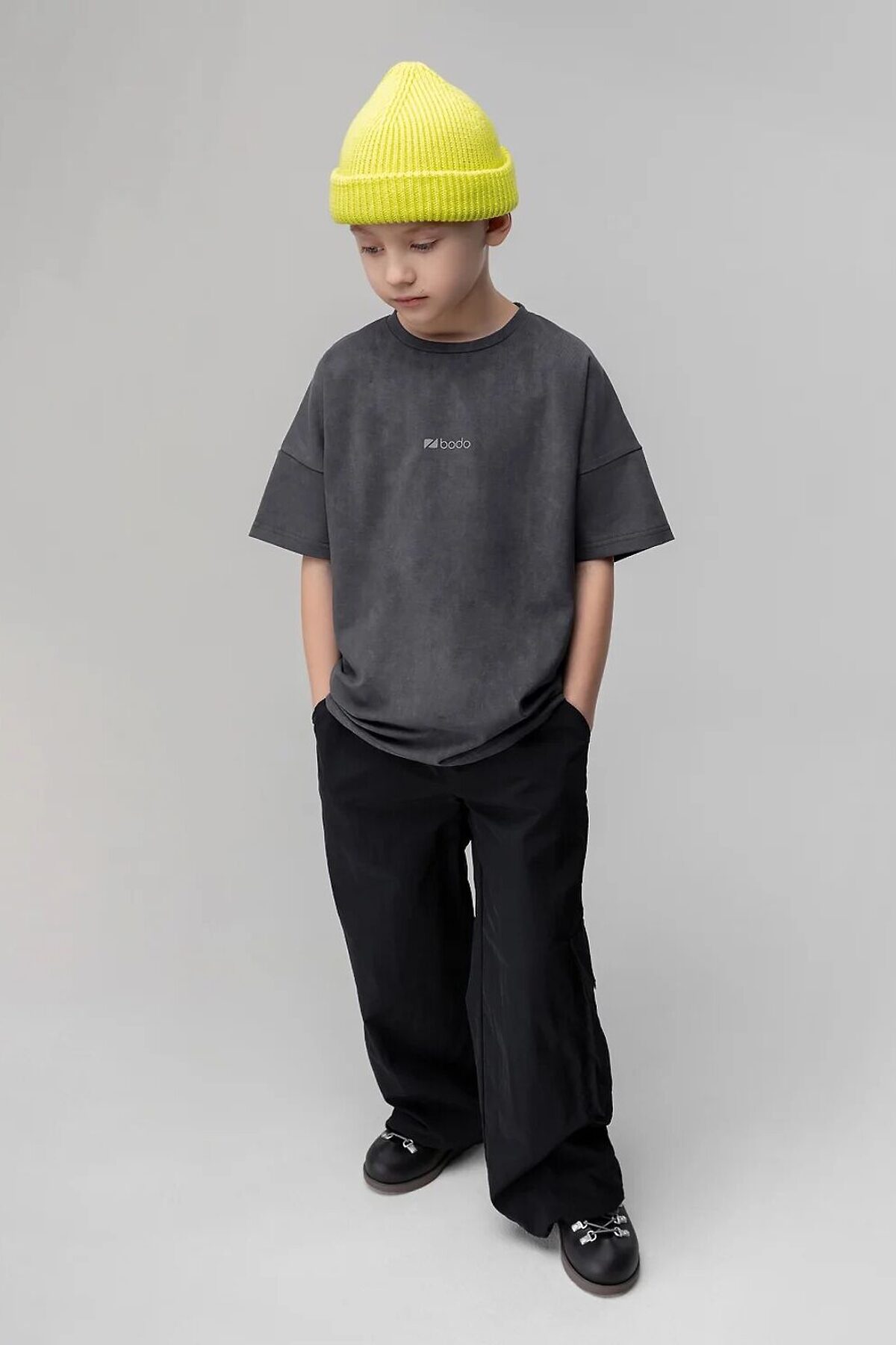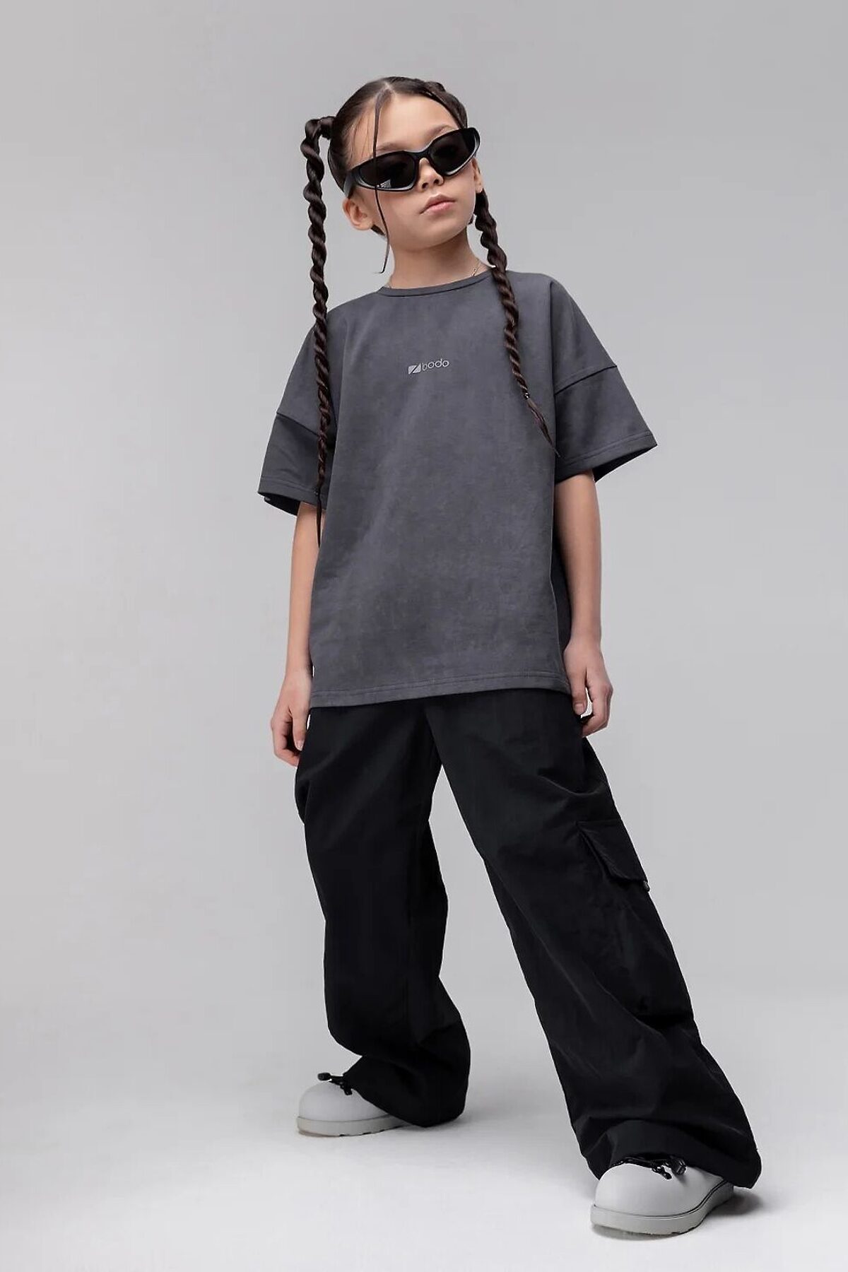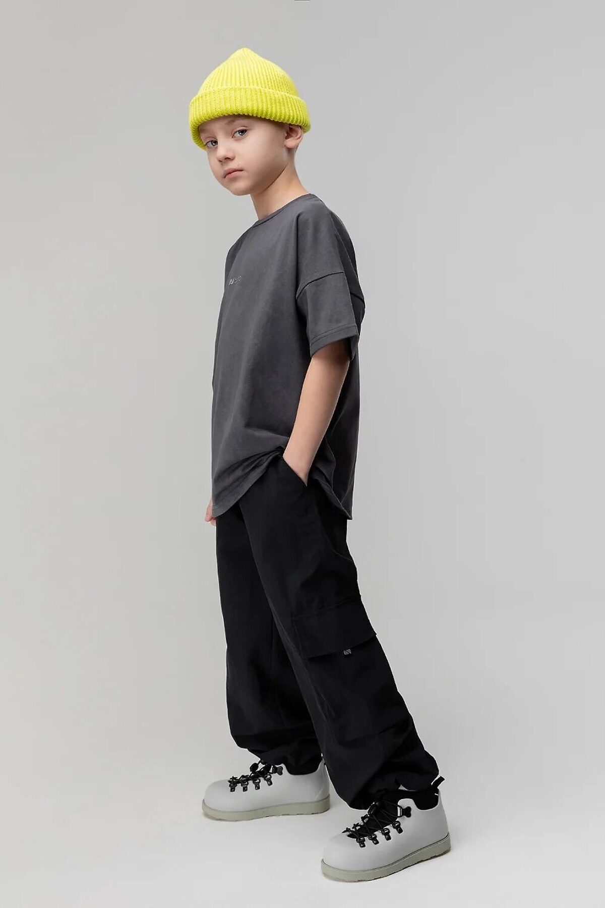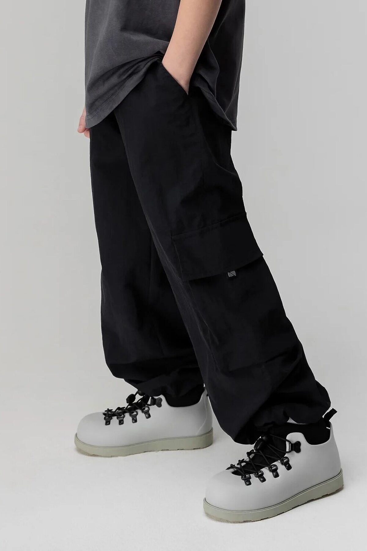 Свободные брюки. Прямые к низу, на поясе с внутренней резинкой. Брюки с двумя видами карман, боковые карманы и накладной карман по левому боковому шву закрытый клапаном, по низу брюк имеется дополнительная резинка с фиксатором для затяжки.