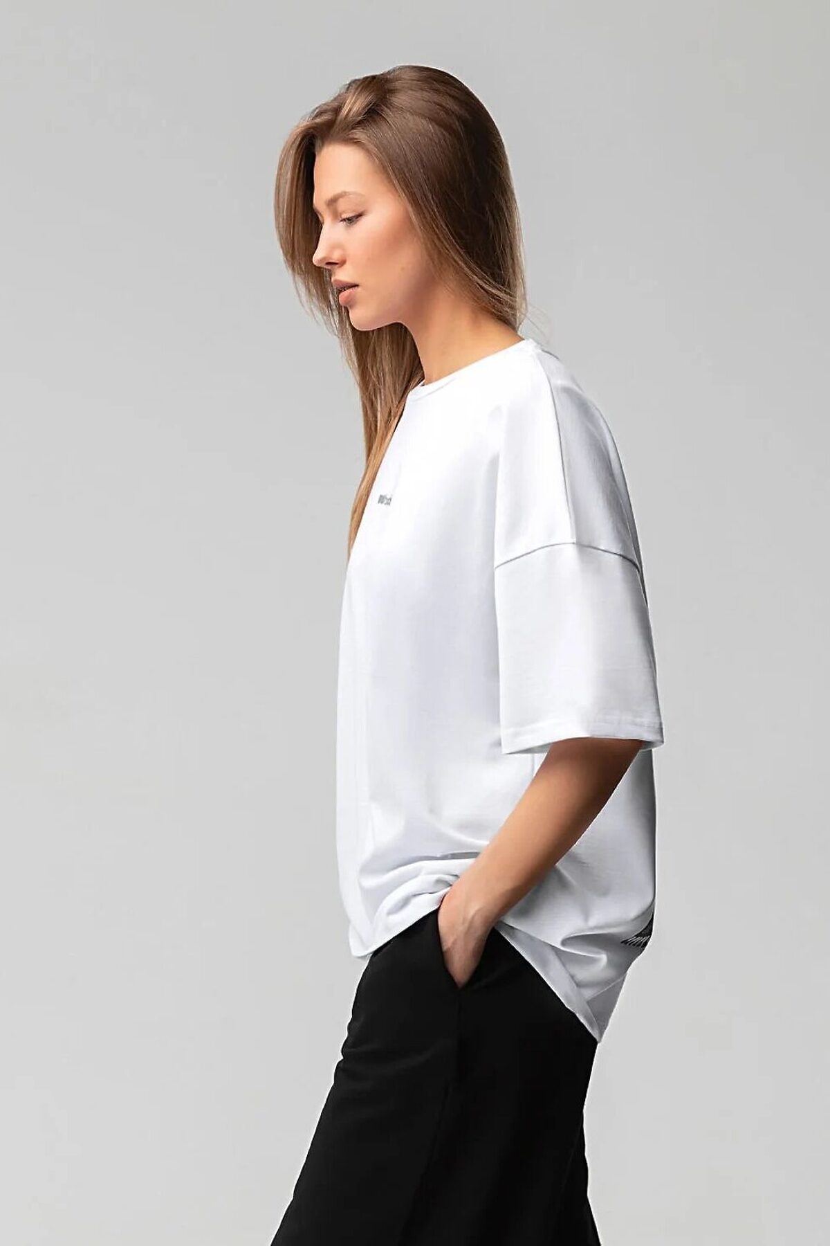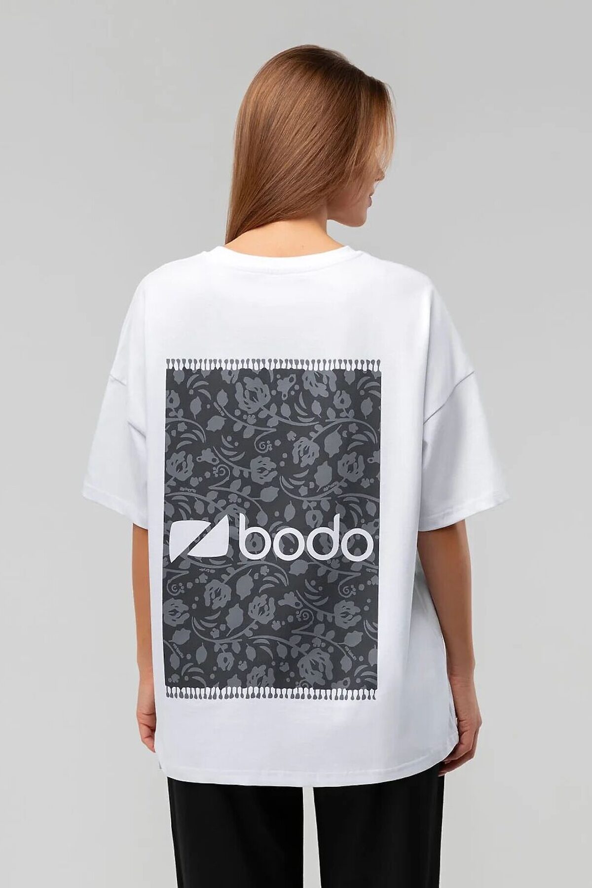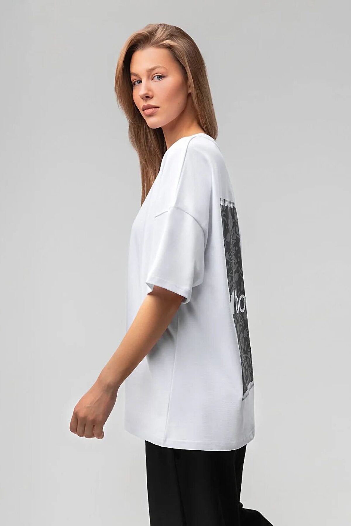 Свободная футболка с коротким рукавом. Единый размер, на спине принт "Матрешка". Рост модели: девушка 165 см., парень 179 см.