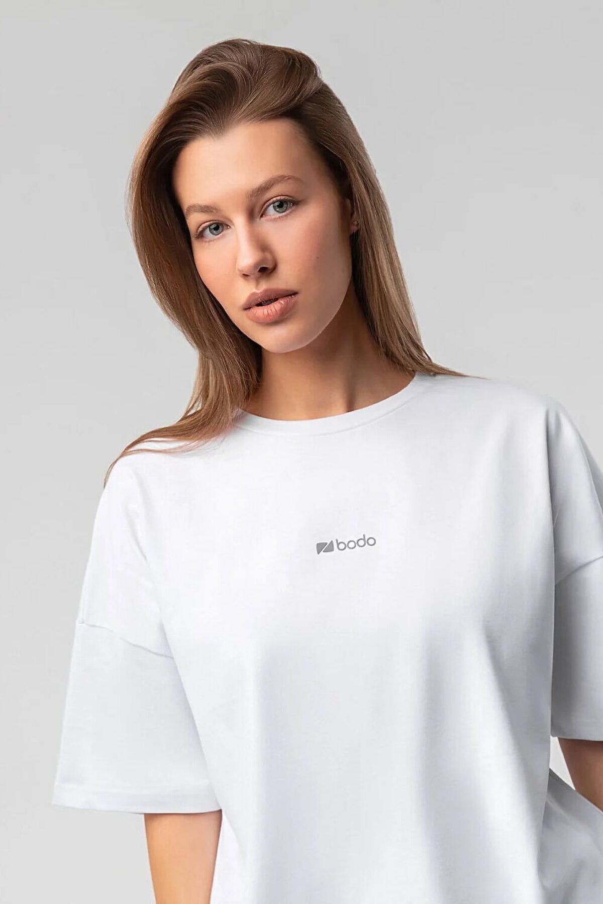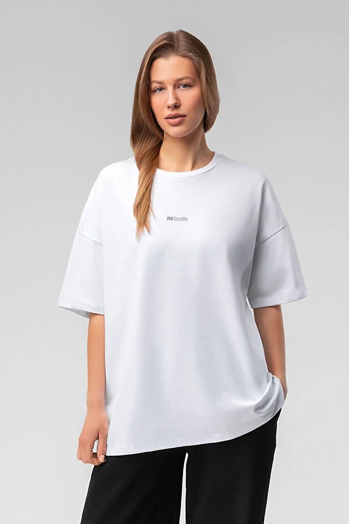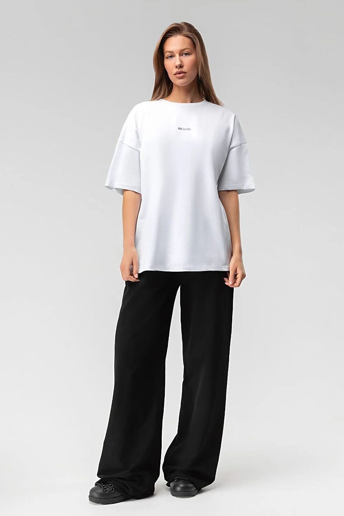 Свободная футболка с коротким рукавом. Единый размер, на спине принт "Матрешка". Рост модели: девушка 165 см., парень 179 см.