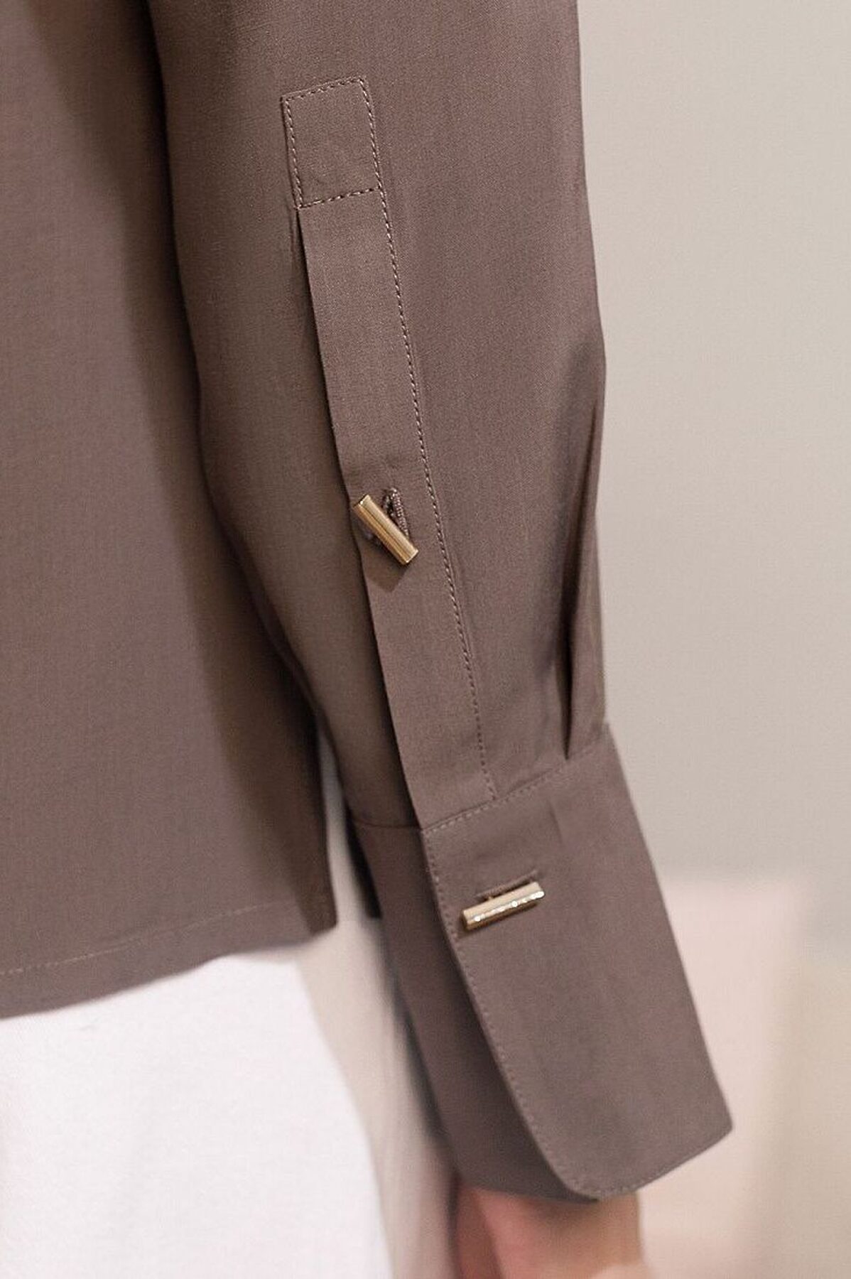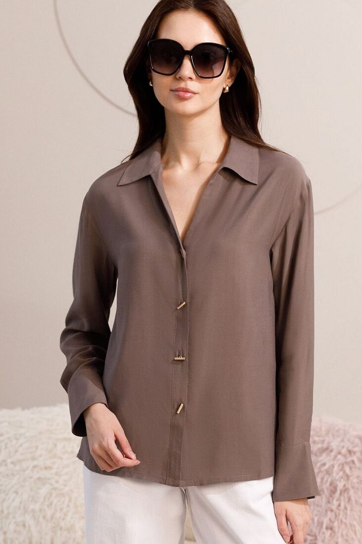 Блузка кофейного цвета сочетает в себе комфорт и элегантность благодаря материалу из вискозы с лиоцеллом. Аккуратный отложной воротник подчеркивает утонченность образа, а продолговатые металлические пуговицы золотистого цвета добавляют выразительный акцент и придают блузке благородный вид. Широкие манжеты на рукавах привлекают внимание и делают силуэт современным. Спущенная линия плеча формирует расслабленный, но стильный внешний вид, что идеально для тех, кто ценит индивидуальность и уверенность в деталях. Крой продуман так, чтобы подчеркивать достоинства фигуры и на больших размерах, создавая гармоничный силуэт без лишних усилий. Ткань из вискозы с добавлением лиоцелла обеспечивает приятные ощущения и отличную посадку, струится на теле и охлаждает в жаркую погоду. Рубашка легко впишется как в деловой гардероб, так и в повседневный стиль, позволяя выглядеть безупречно независимо от ситуации.
