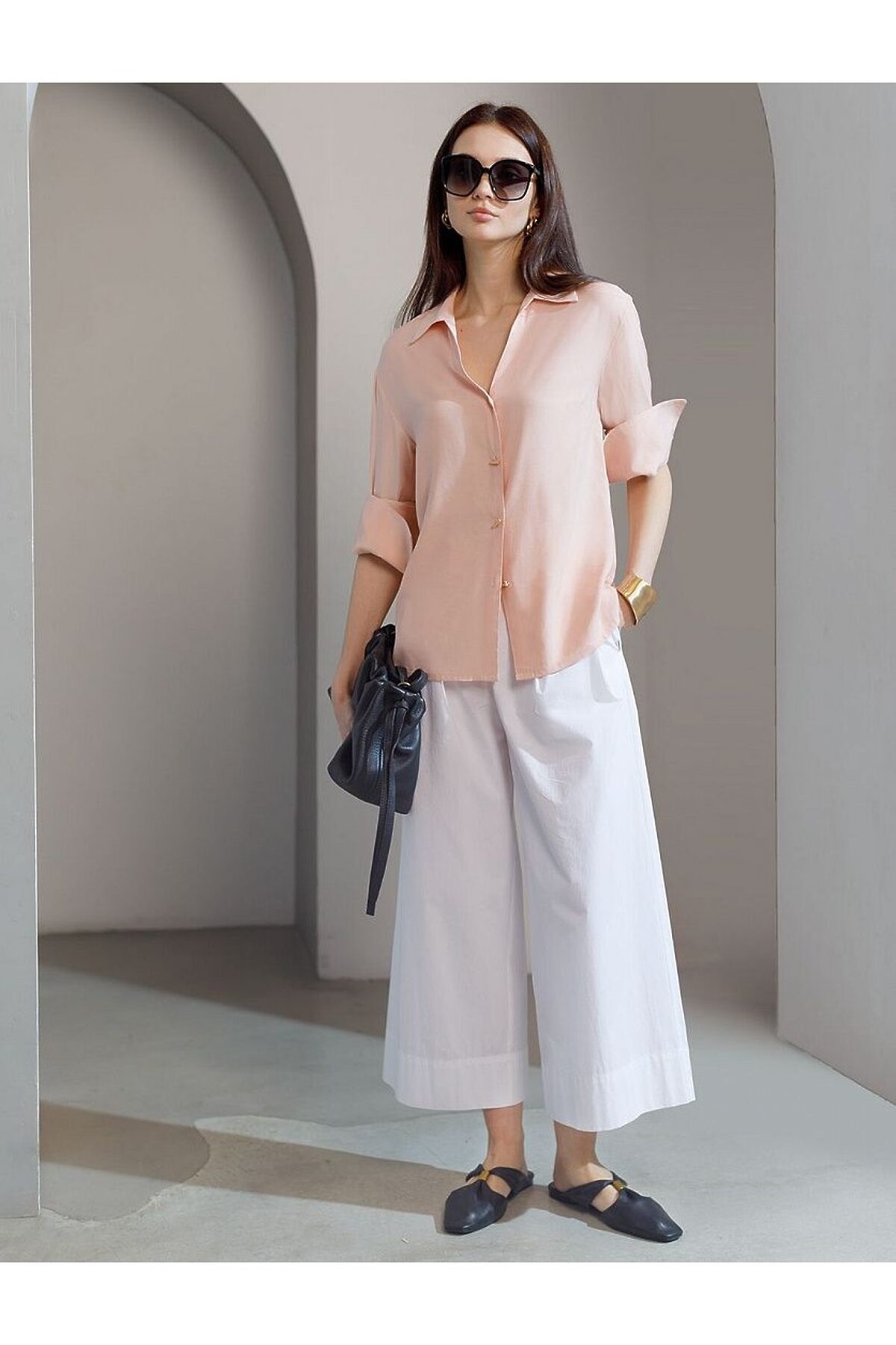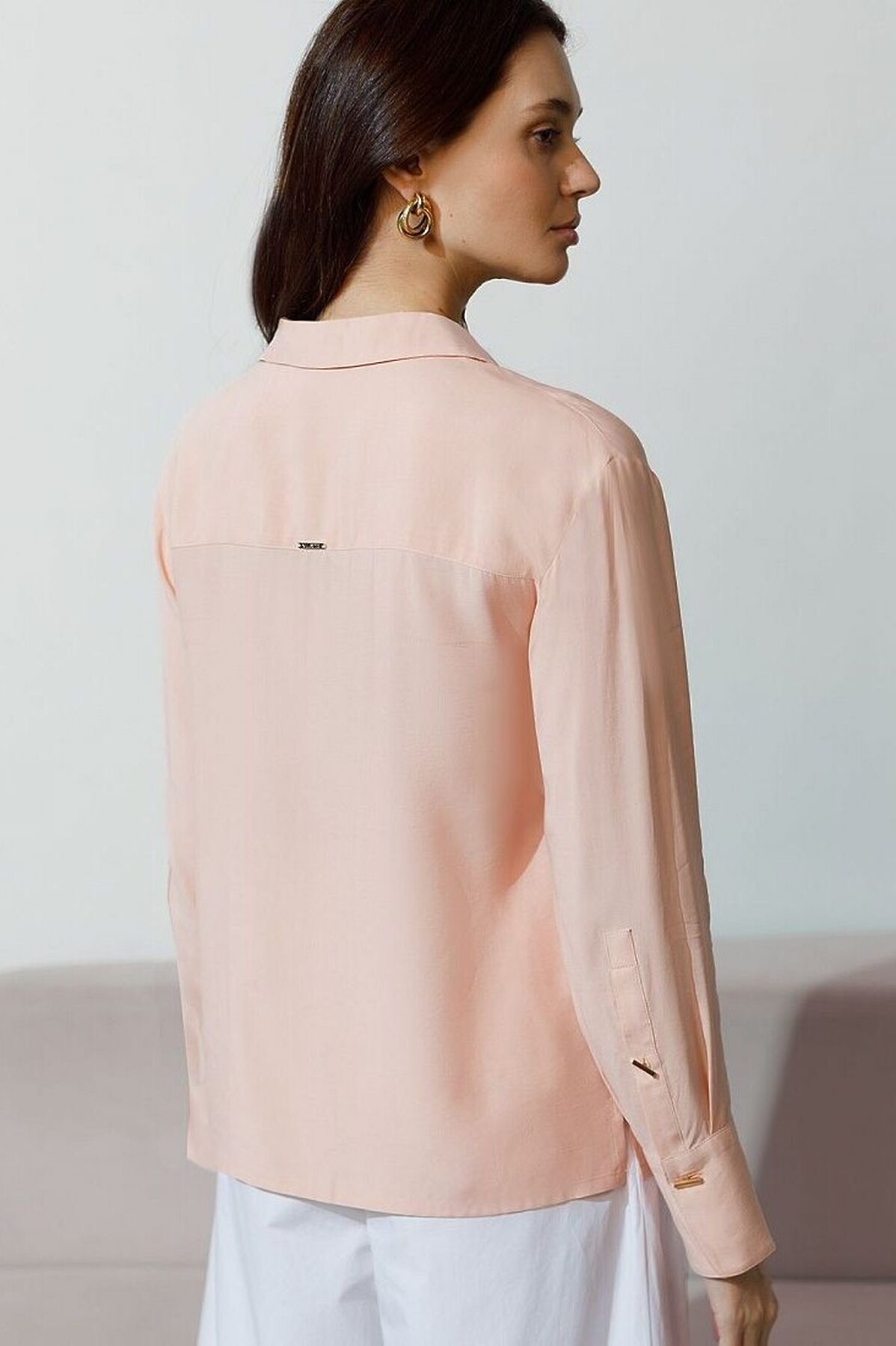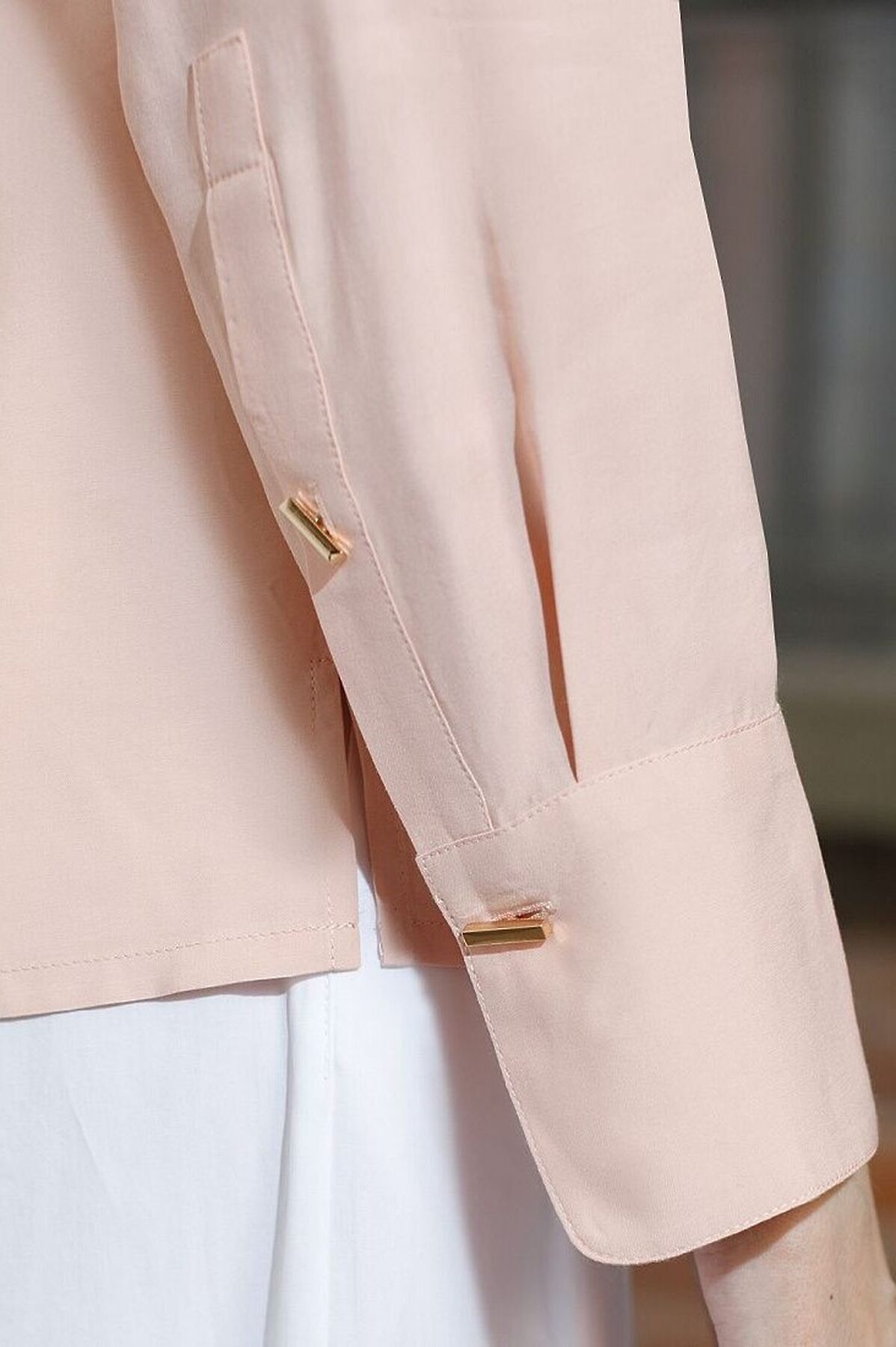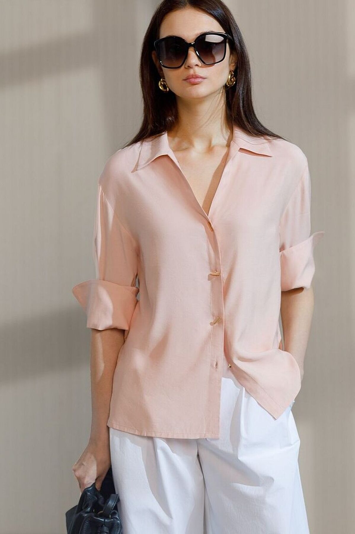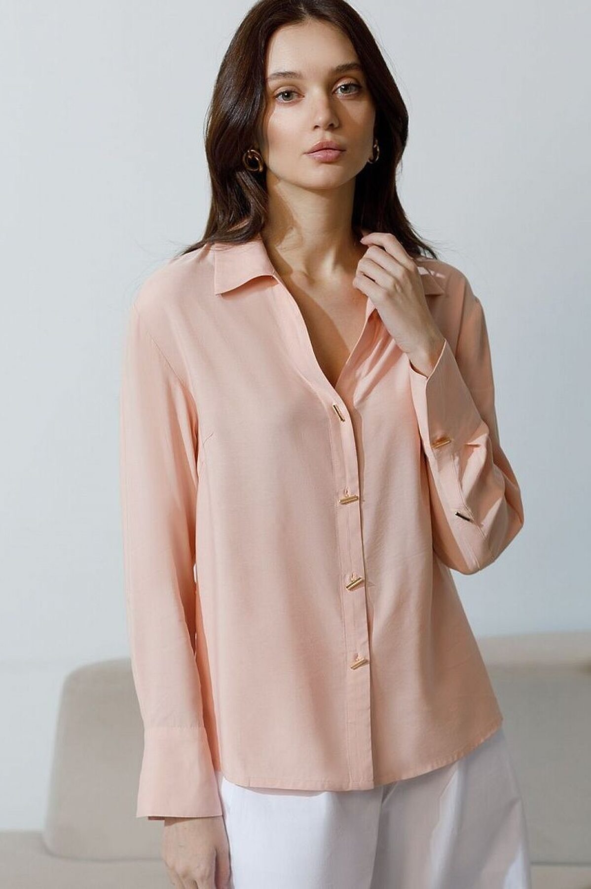 Блузка пудрового цвета сочетает в себе комфорт и элегантность благодаря материалу из вискозы с лиоцеллом. Аккуратный отложной воротник подчеркивает утонченность образа, а продолговатые металлические пуговицы золотистого цвета добавляют выразительный акцент и придают блузке благородный вид. Широкие манжеты на рукавах привлекают внимание и делают силуэт современным. Спущенная линия плеча формирует расслабленный, но стильный внешний вид, что идеально для тех, кто ценит индивидуальность и уверенность в деталях. Крой продуман так, чтобы подчеркивать достоинства фигуры и на больших размерах, создавая гармоничный силуэт без лишних усилий. Ткань из вискозы с добавлением лиоцелла обеспечивает приятные ощущения и отличную посадку, струится на теле и охлаждает в жаркую погоду. Рубашка легко впишется как в деловой гардероб, так и в повседневный стиль, позволяя выглядеть безупречно независимо от ситуации.