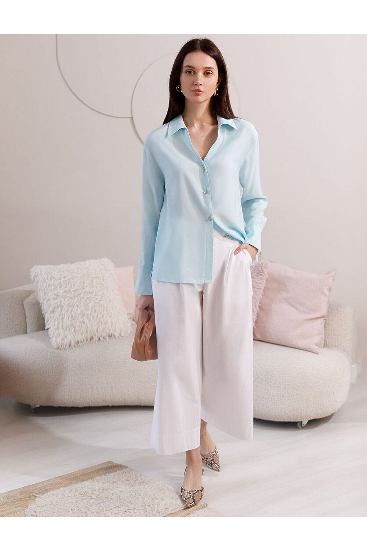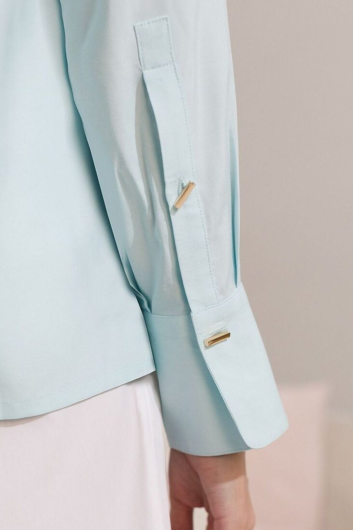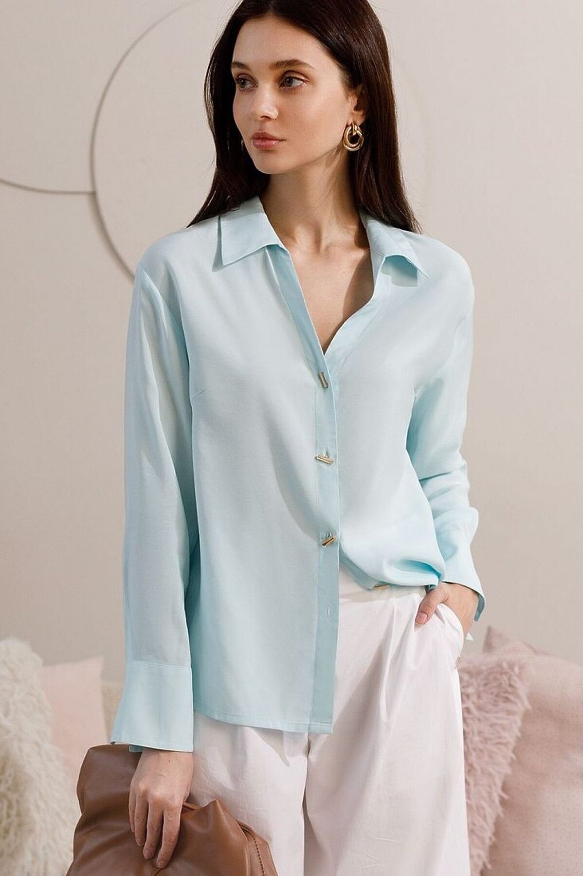 Блузка светло-лазурного цвета сочетает в себе комфорт и элегантность благодаря материалу из вискозы с лиоцеллом. Аккуратный отложной воротник подчеркивает утонченность образа, а продолговатые металлические пуговицы золотистого цвета добавляют выразительный акцент и придают блузке благородный вид. Широкие манжеты на рукавах привлекают внимание и делают силуэт современным. Спущенная линия плеча формирует расслабленный, но стильный внешний вид, что идеально для тех, кто ценит индивидуальность и уверенность в деталях. Крой продуман так, чтобы подчеркивать достоинства фигуры и на больших размерах, создавая гармоничный силуэт без лишних усилий. Ткань из вискозы с добавлением лиоцелла обеспечивает приятные ощущения и отличную посадку, струится на теле и охлаждает в жаркую погоду. Рубашка легко впишется как в деловой гардероб, так и в повседневный стиль, позволяя выглядеть безупречно независимо от ситуации.