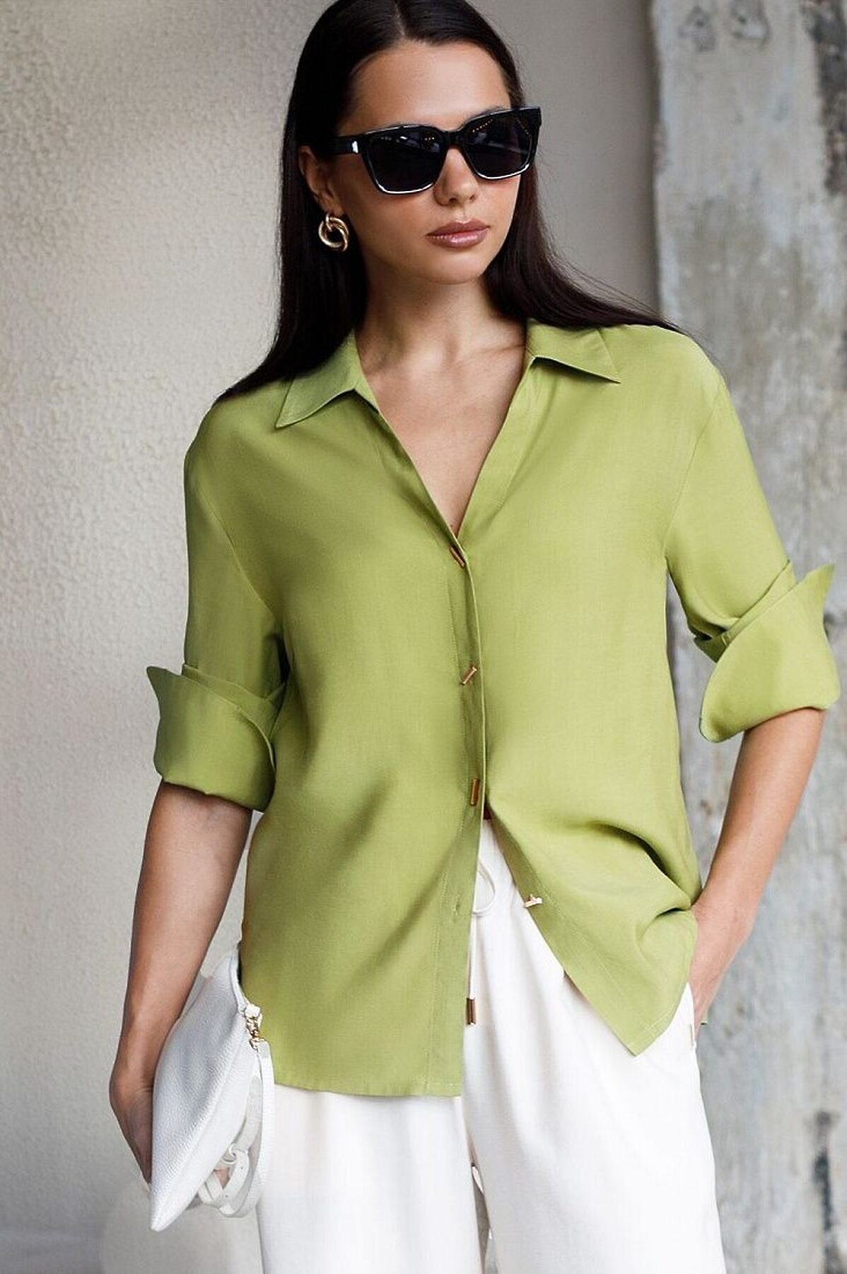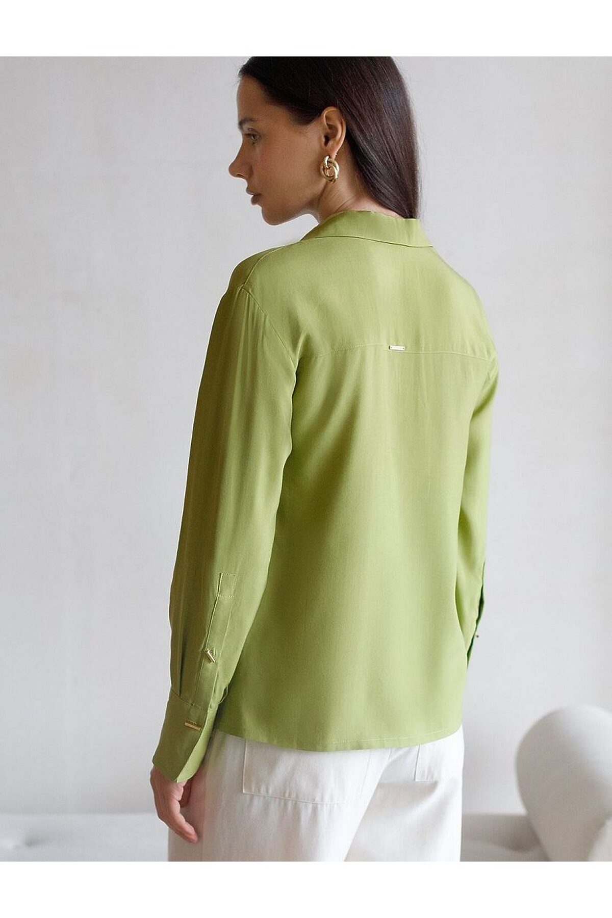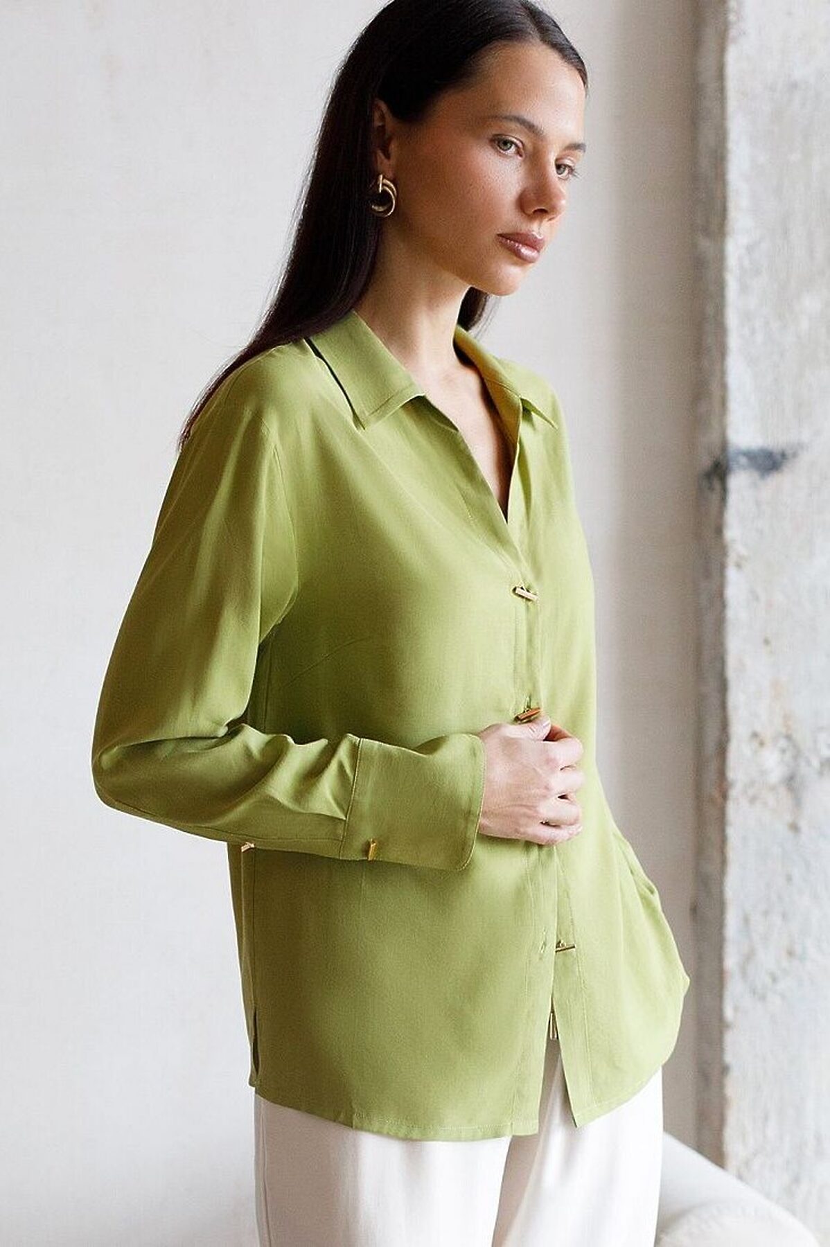 Блузка светло-оливкового цвета сочетает в себе комфорт и элегантность благодаря материалу из вискозы с лиоцеллом. Аккуратный отложной воротник подчеркивает утонченность образа, а продолговатые металлические пуговицы золотистого цвета добавляют выразительный акцент и придают блузке благородный вид. Широкие манжеты на рукавах привлекают внимание и делают силуэт современным. Спущенная линия плеча формирует расслабленный, но стильный внешний вид, что идеально для тех, кто ценит индивидуальность и уверенность в деталях. Крой продуман так, чтобы подчеркивать достоинства фигуры и на больших размерах, создавая гармоничный силуэт без лишних усилий. Ткань из вискозы с добавлением лиоцелла обеспечивает приятные ощущения и отличную посадку, струится на теле и охлаждает в жаркую погоду. Рубашка легко впишется как в деловой гардероб, так и в повседневный стиль, позволяя выглядеть безупречно независимо от ситуации.