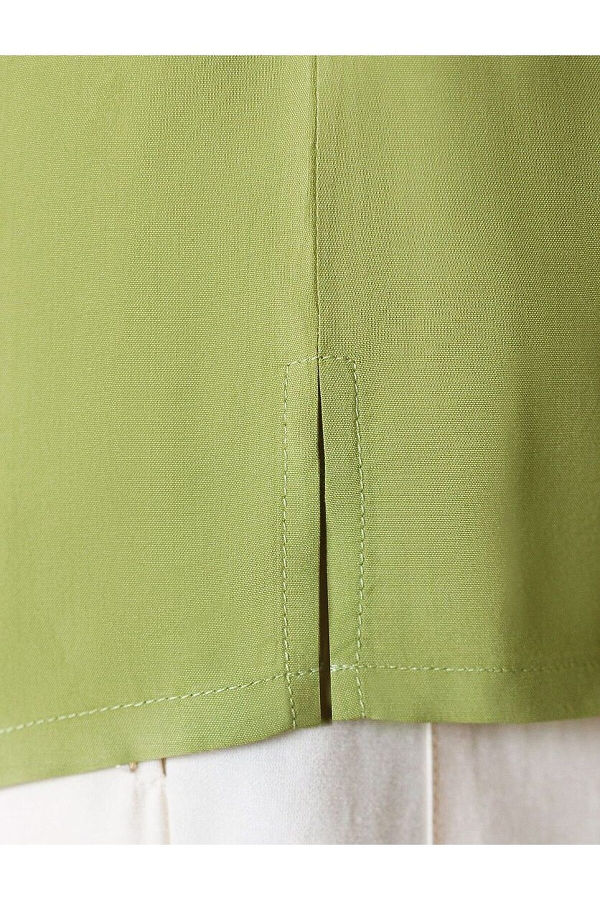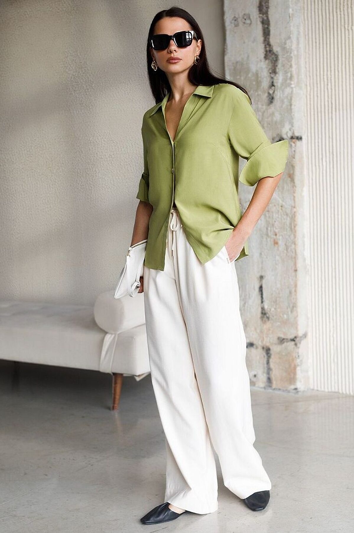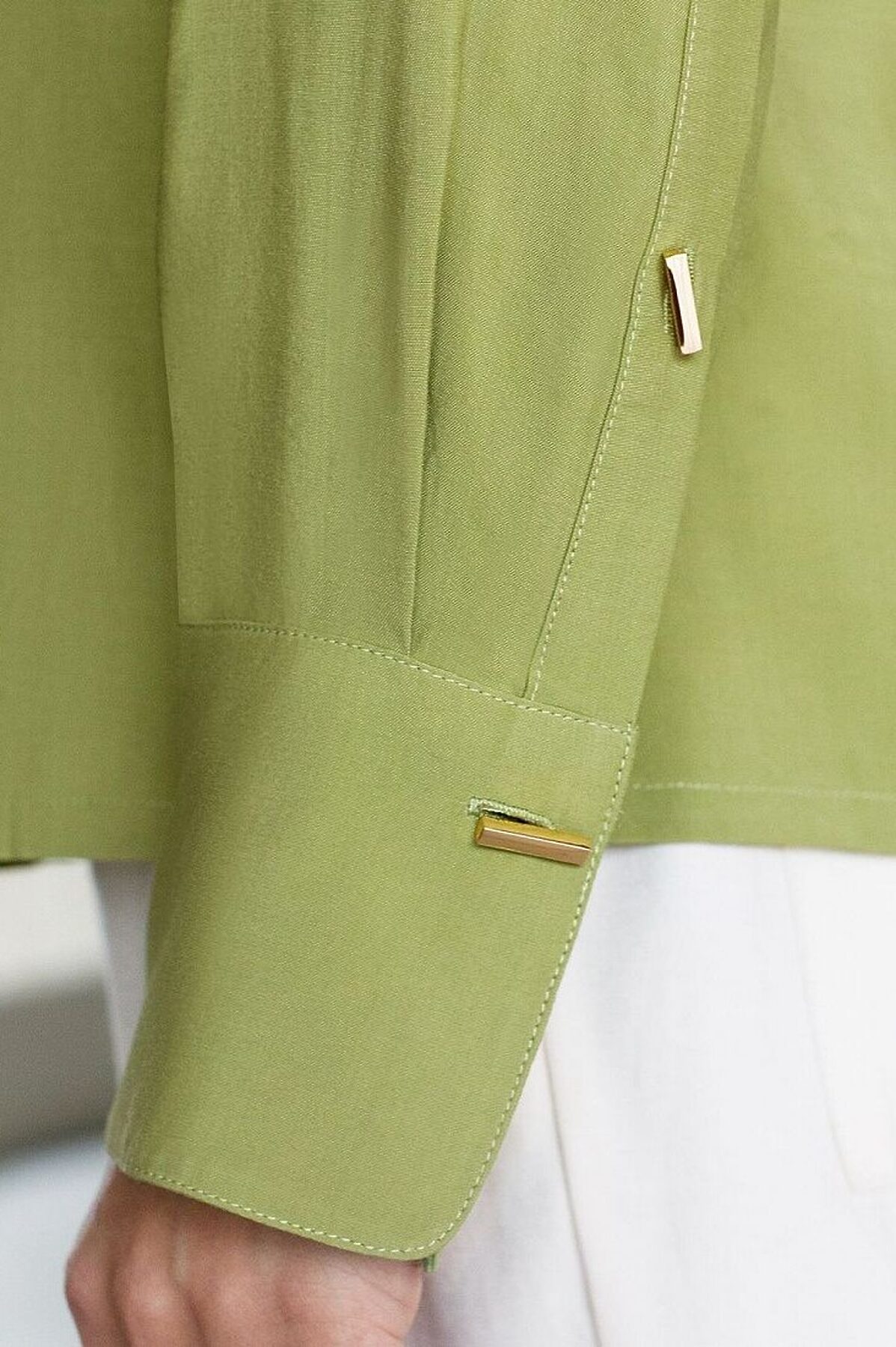 Блузка светло-оливкового цвета сочетает в себе комфорт и элегантность благодаря материалу из вискозы с лиоцеллом. Аккуратный отложной воротник подчеркивает утонченность образа, а продолговатые металлические пуговицы золотистого цвета добавляют выразительный акцент и придают блузке благородный вид. Широкие манжеты на рукавах привлекают внимание и делают силуэт современным. Спущенная линия плеча формирует расслабленный, но стильный внешний вид, что идеально для тех, кто ценит индивидуальность и уверенность в деталях. Крой продуман так, чтобы подчеркивать достоинства фигуры и на больших размерах, создавая гармоничный силуэт без лишних усилий. Ткань из вискозы с добавлением лиоцелла обеспечивает приятные ощущения и отличную посадку, струится на теле и охлаждает в жаркую погоду. Рубашка легко впишется как в деловой гардероб, так и в повседневный стиль, позволяя выглядеть безупречно независимо от ситуации.