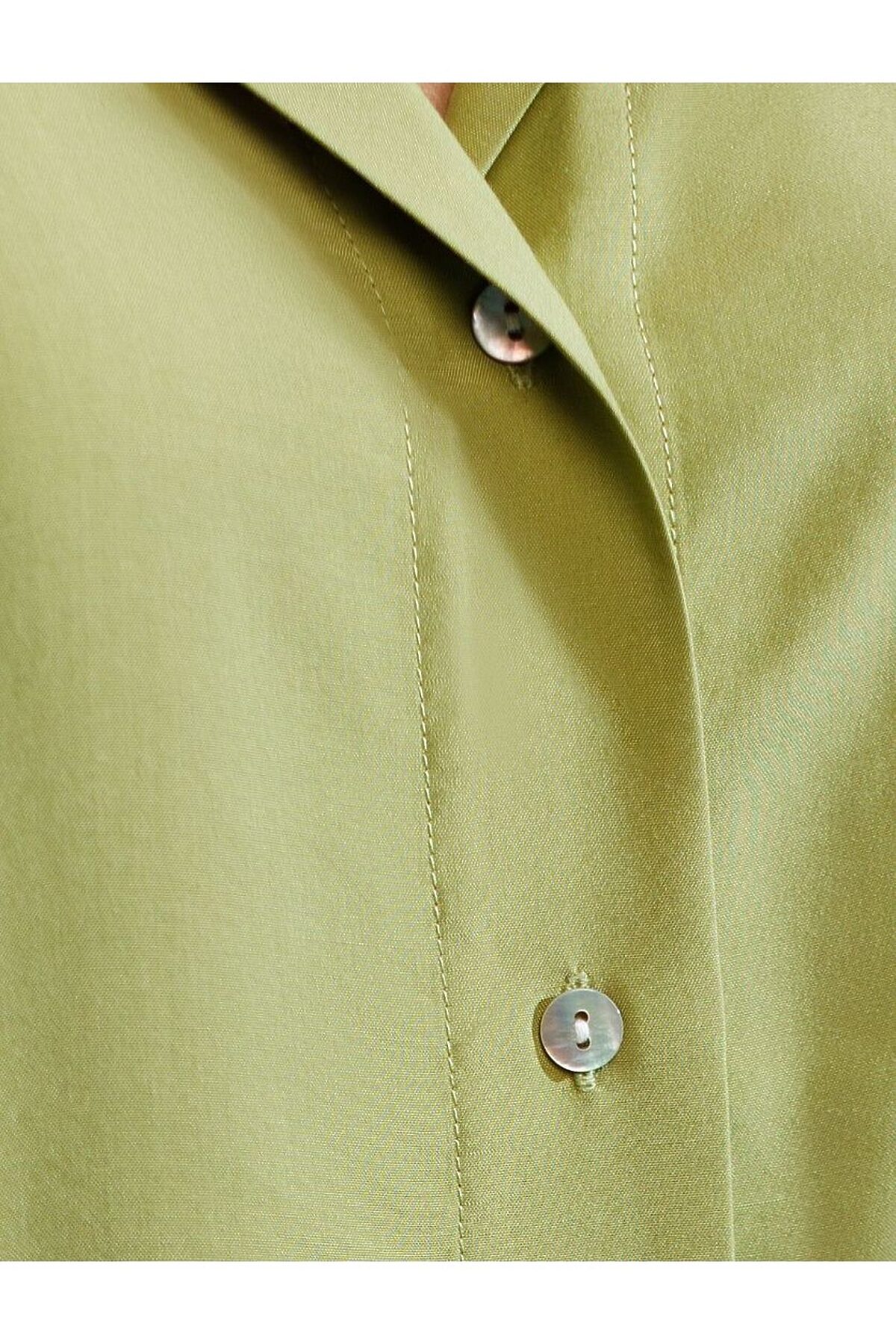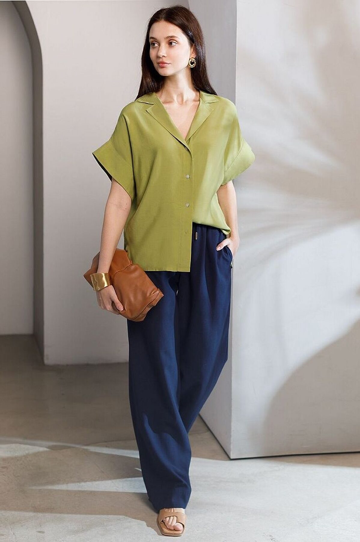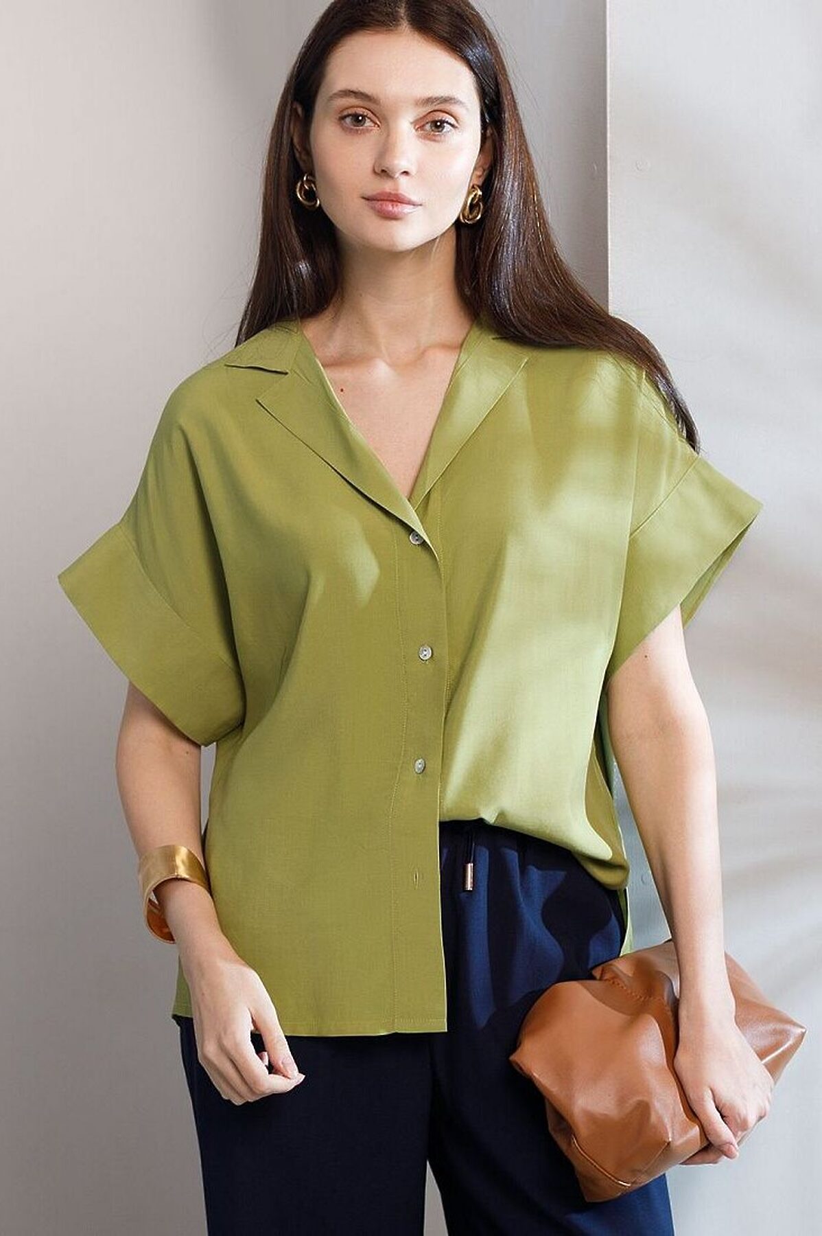Блузка светло-оливкового цвета сочетает в себе комфорт и элегантность благодаря материалу из вискозы с лиоцеллом. Аккуратный отложной воротник подчеркивает утонченность образа, а широкие короткие рукава привлекают внимание и делают силуэт современным. Спущенная линия плеча формирует расслабленный, но стильный внешний вид, что идеально для тех, кто ценит индивидуальность и уверенность в деталях. Крой продуман так, чтобы подчеркивать достоинства фигуры и на больших размерах, создавая гармоничный силуэт без лишних усилий. Ткань из вискозы с добавлением лиоцелла обеспечивает приятные ощущения и отличную посадку, струится на теле и охлаждает в жаркую погоду. Рубашка легко впишется как в деловой гардероб, так и в повседневный стиль, позволяя выглядеть безупречно независимо от ситуации.