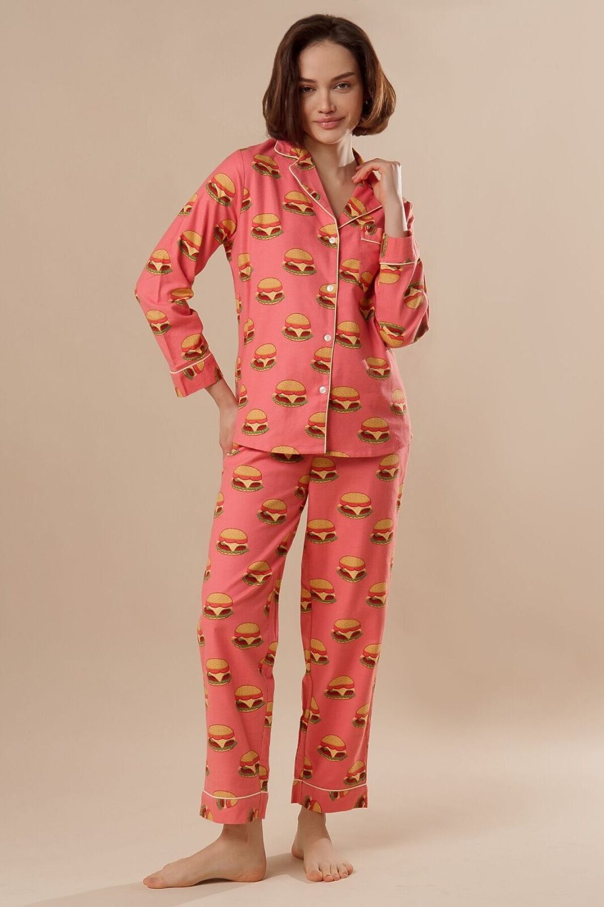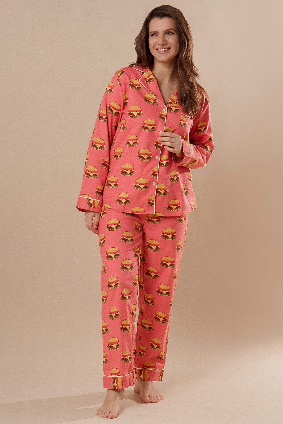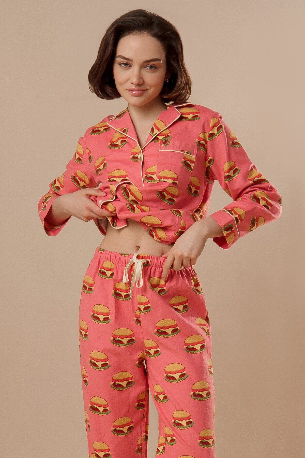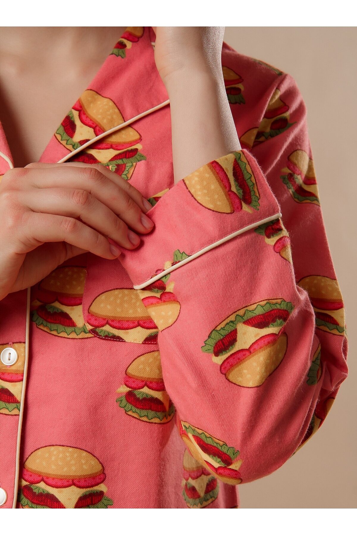 Домашняя пижама от торговой марки Индефини. В комплекте рубашка и брюки. Рубашка из хлопка, оранжево-персикового цвета, с принтом, с длинными рукавами, с воротником-отворотом, с кармашком на груди, с обрамлением, на пуговичках, прямая, свободного кроя. Брюки из хлопка, оранжево-персикового цвета, с принтом, прямые, свободного кроя, с обрамлением, на мягкой резинке, с регулирующей лентой.