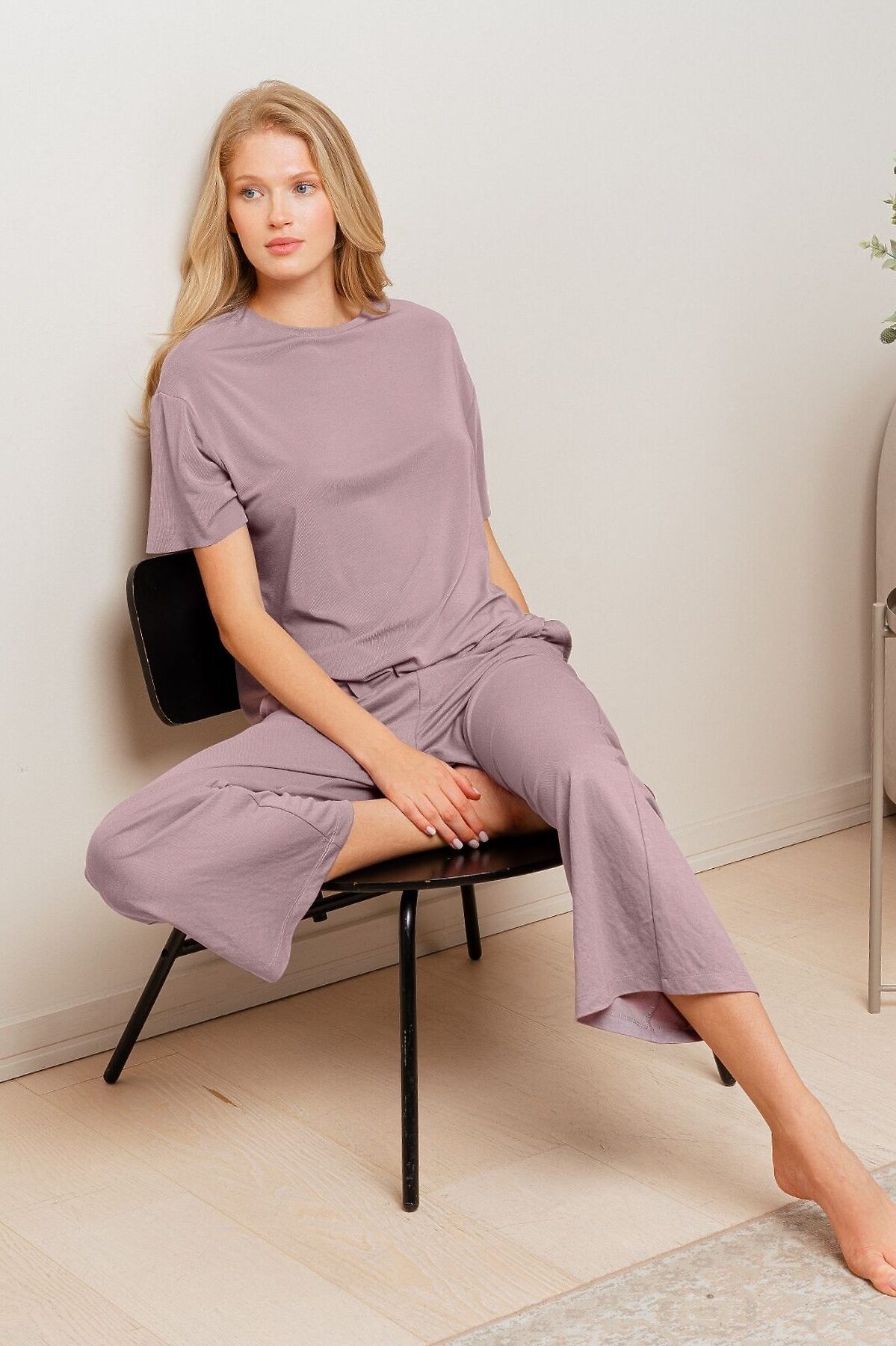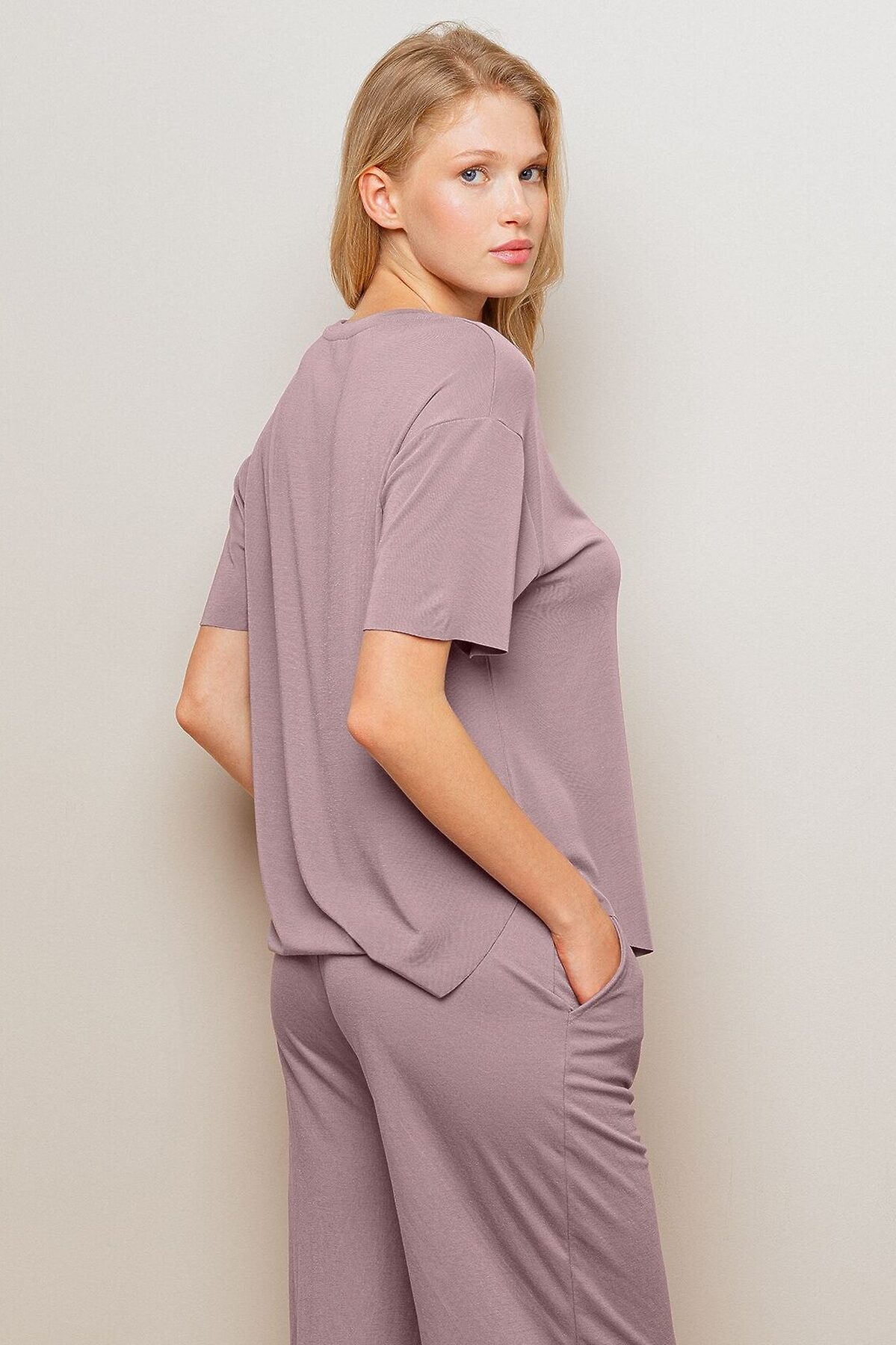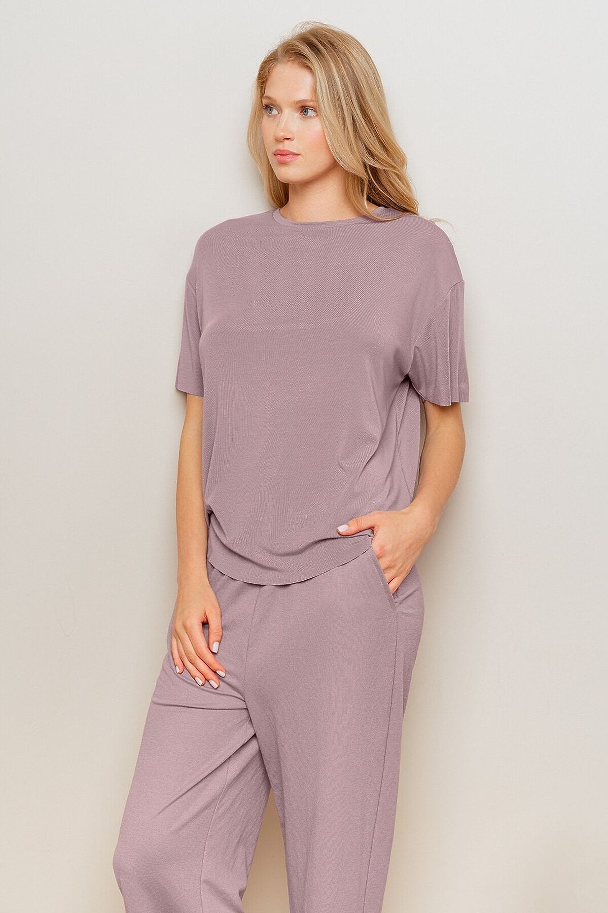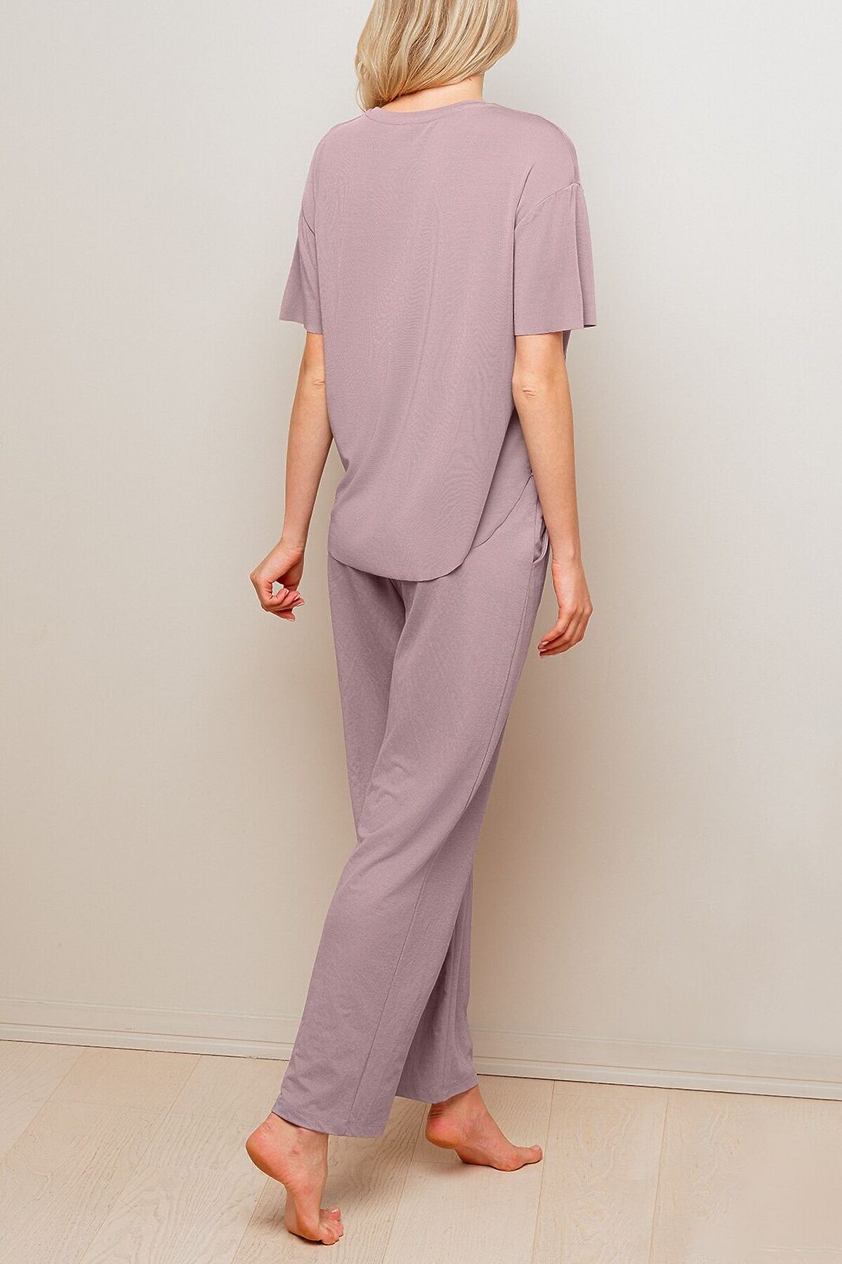 Пижама женская 4274TBC бренда Indefini включает футболку и брюки Футболка изготовлена из сочетания модала и акрила, она имеет свободный прямой крой и короткий рукава Брюки изготовлены из сочетания вискозы и нейлона, имеют прямой свободный крой и карманы по бокам
