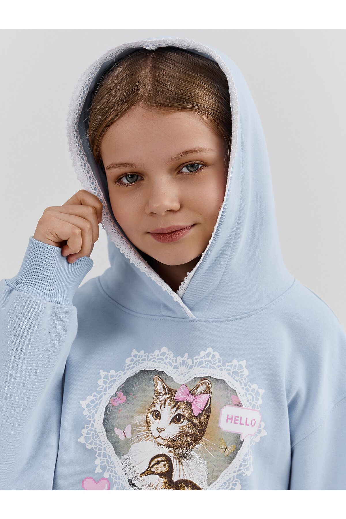 Худи для девочек, прямого силуэта, с капюшоном. Горловина округлой формы. Капюшон со средним швом, на подкладке из основного полотна. По краю капюшона с внутренней стороны настрочена отделочная тесьма (6361-1176). Плечо спущено, рукав втачной длинный. По низу рукава отрезная манжета из рибаны. Пояс отрезной из рибаны, отстрочен.