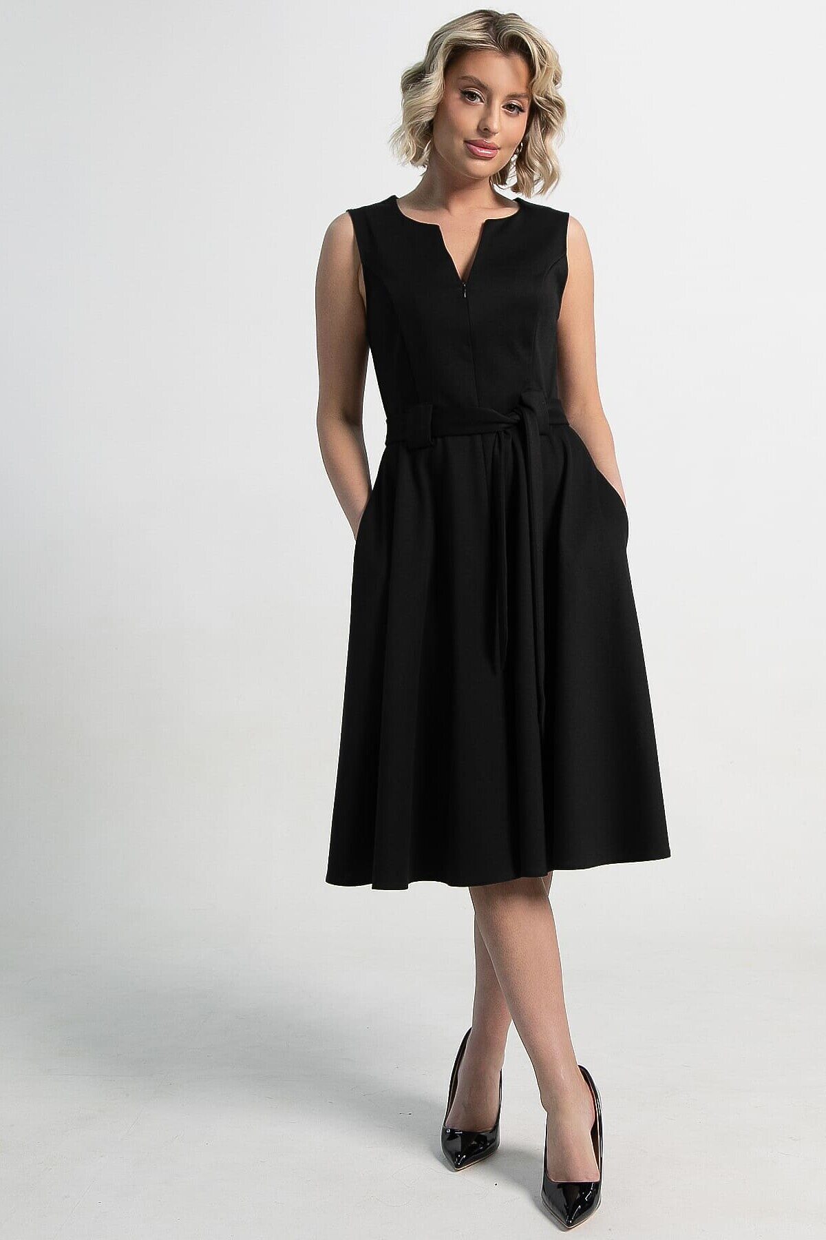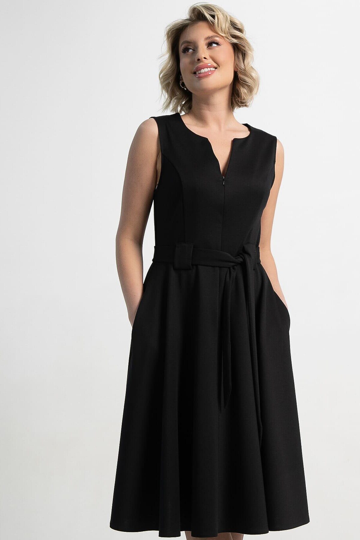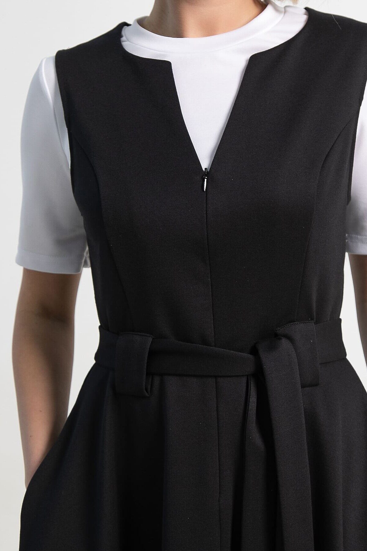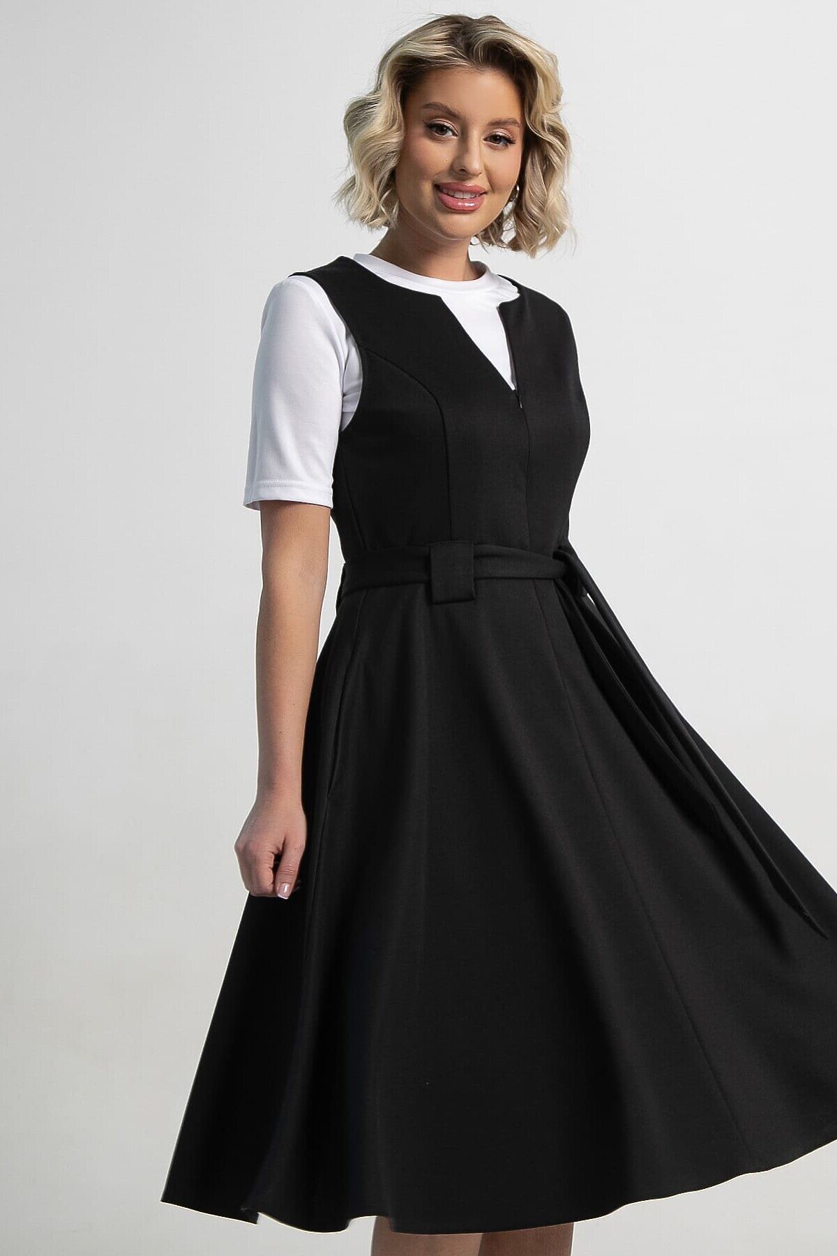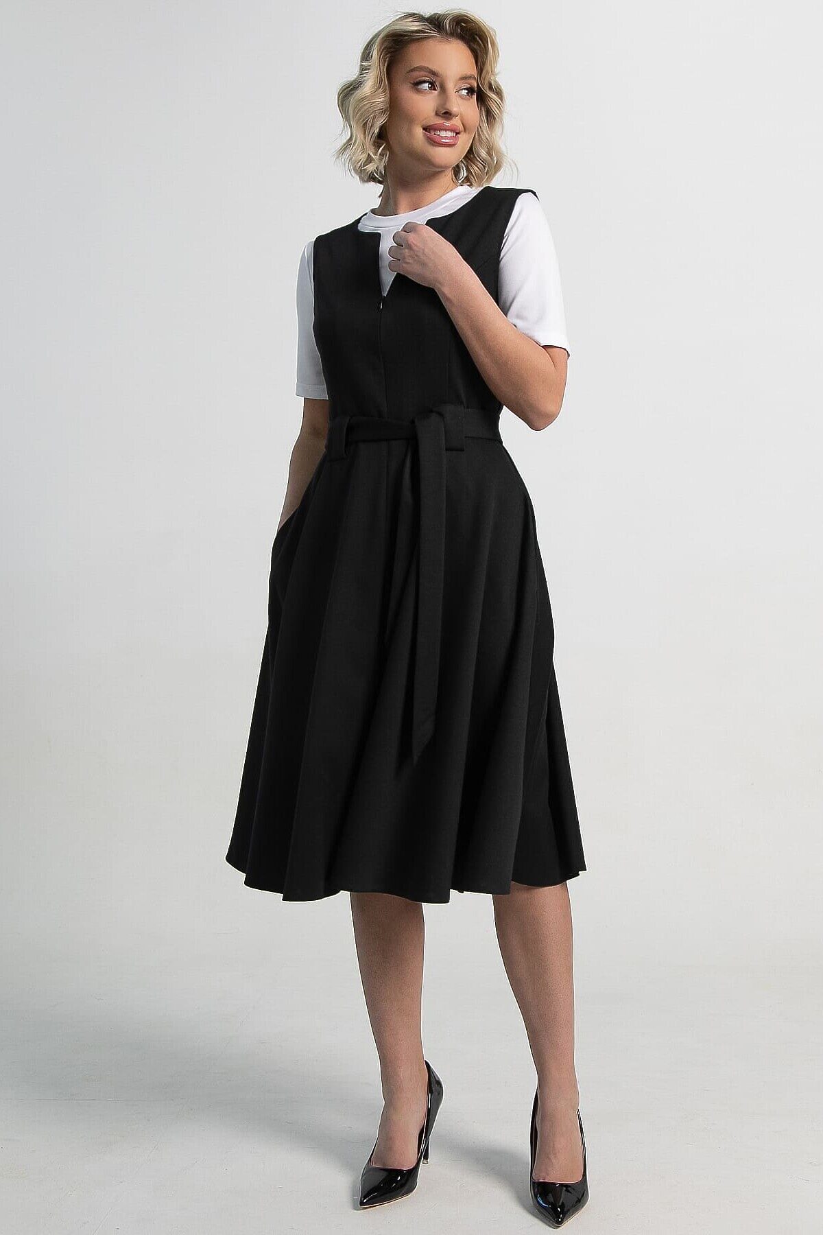 Бережная стирка при 30 градусах. Платье без подкладки! Женское платье в базовом черном цвете — универсальная модель, которая станет базой для стильного делового гардероба. Длина миди до колена выполнен в классическом А-силуэте и V-образным вырезом, что визуально вытягивает силуэт и делает образ более женственным и элегантным. Благодаря широким бретелям сарафан удобно носить с блузкой, водолазкой или рубашкой, создавая строгий и деловой стиль для офиса, учебы или официальных мероприятий. Это платье без рукавов — удачный выбор для тех, кто ценит классический стиль, удобство и универсальность. Оно подчеркнет ваш строгий и элегантный образ, станет незаменимой частью офисного или школьного дресс-кода и позволит выглядеть стильно каждый день.