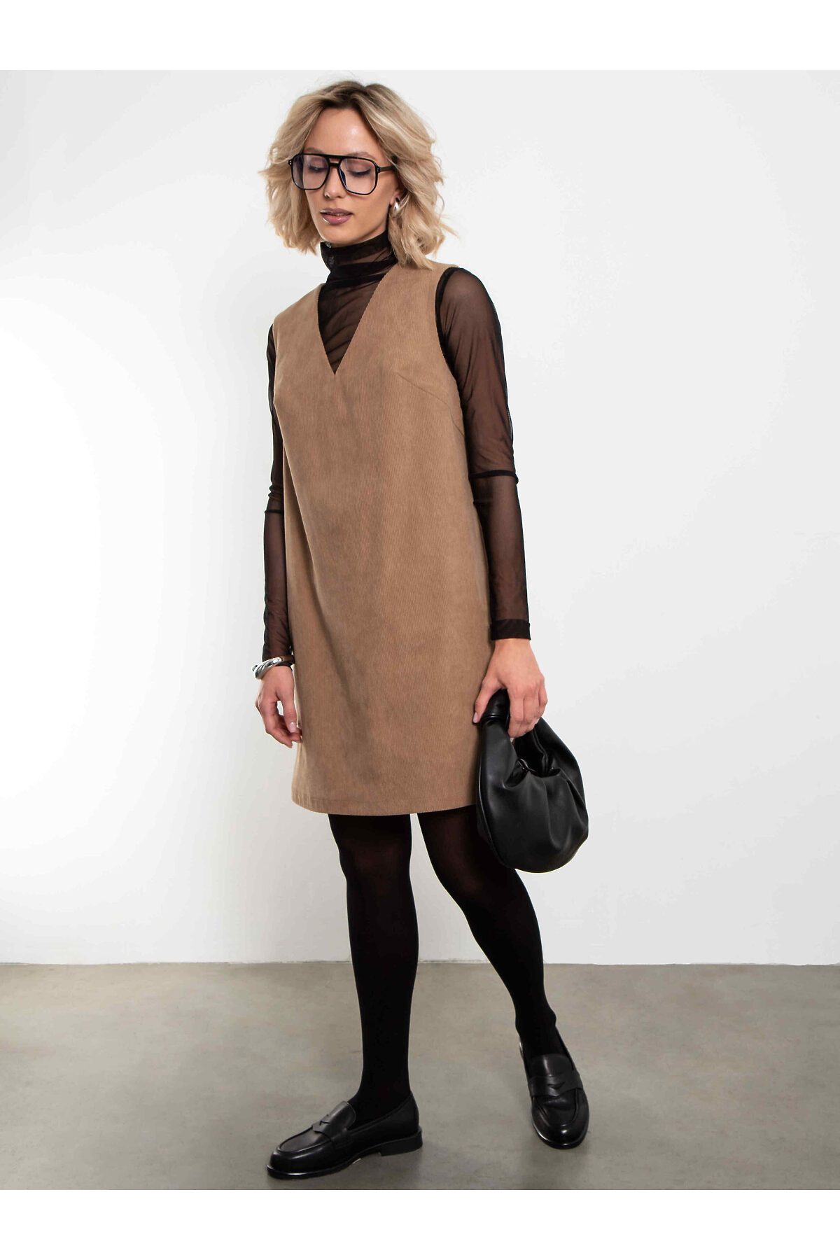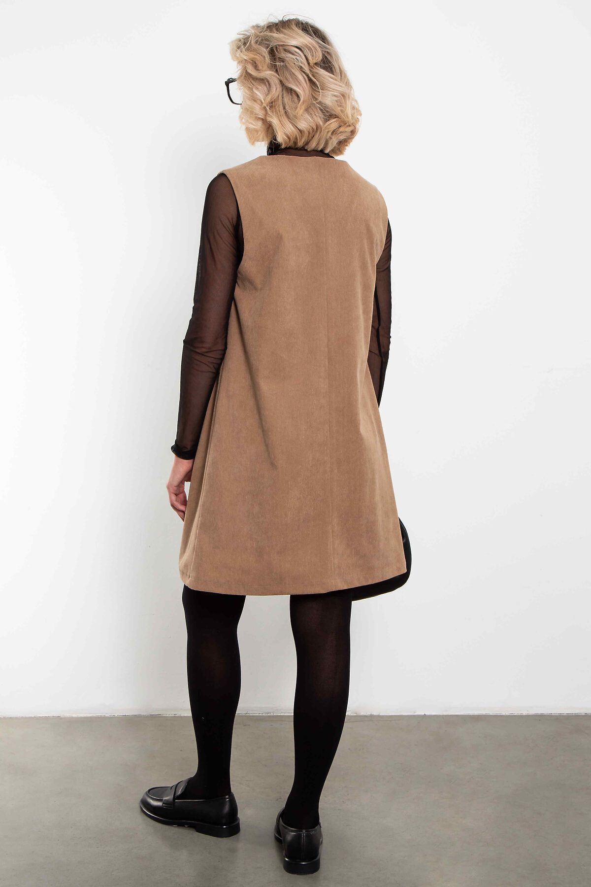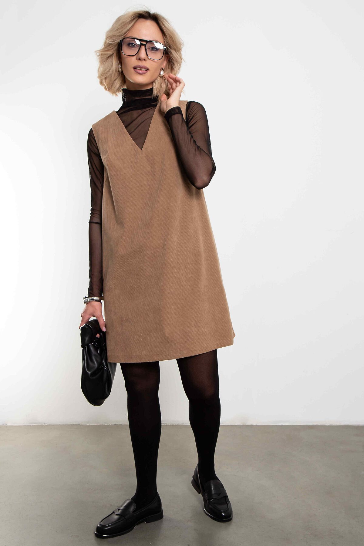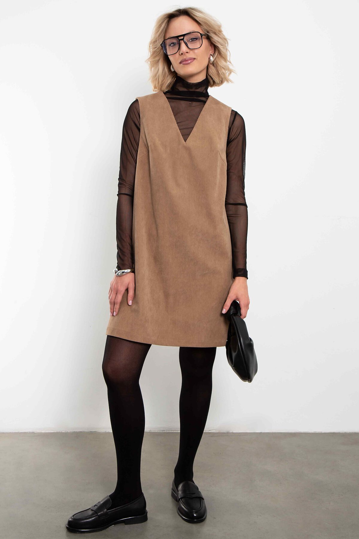 Лаконичный сарафан из мягкого вельвета песочного оттенка — идеальная база для продуманного городского гардероба.