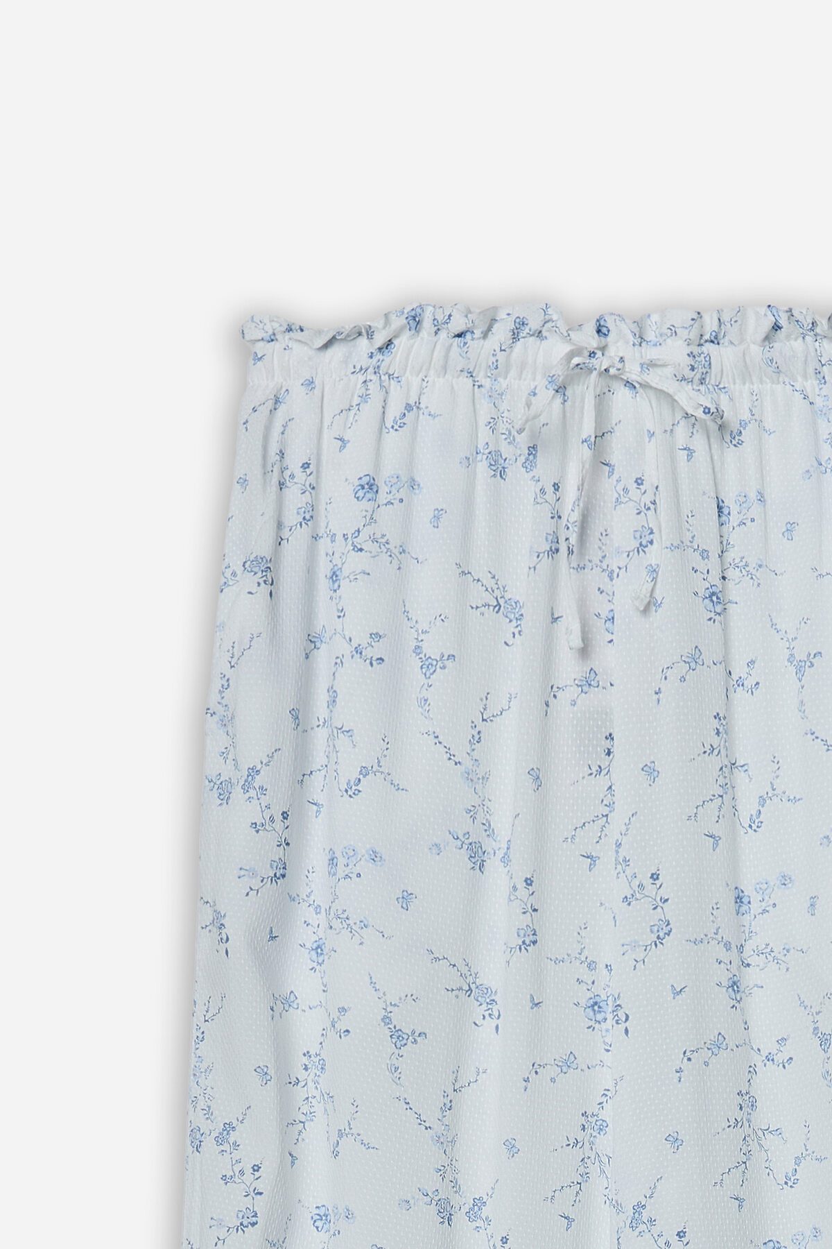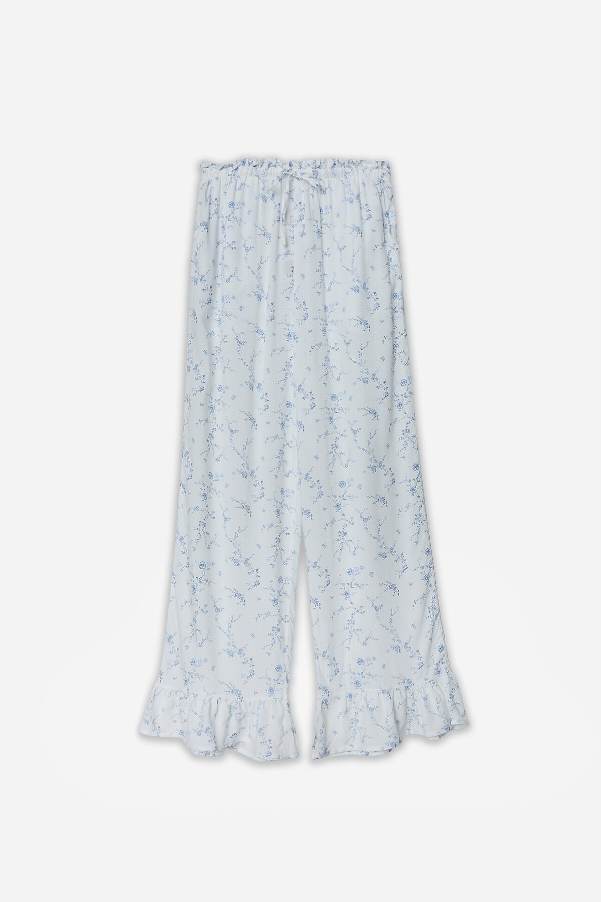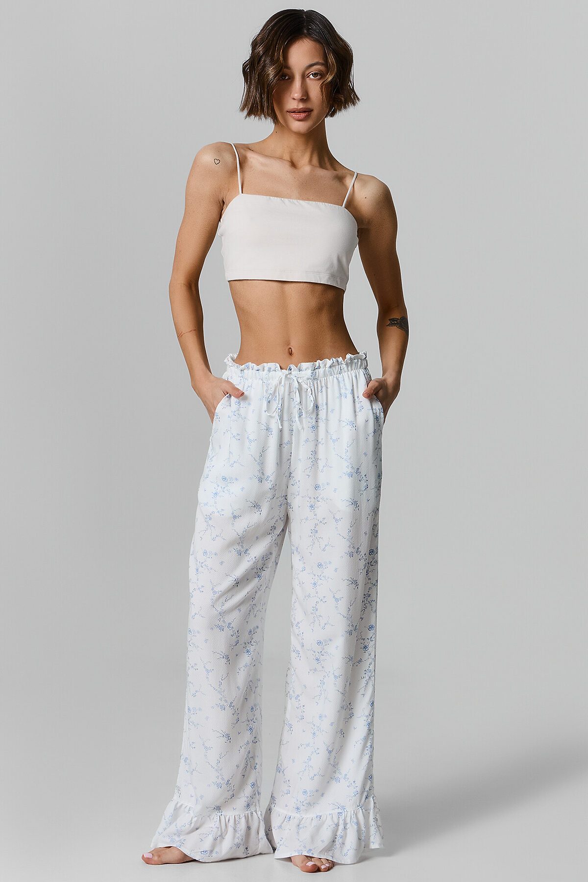 Брюки прямые свободные, посадка средняя. Пояс с эластичной тесьмой внутри (вн. 20мм 20RV). По верхнему срезу притачная рюша. С внешней стороны пояса пробиты петли и вставлен шнур-бейка из основного полотна. В боковых швах обработаны карманы-хулиганы. По нижним срезам притачаны рюши.
