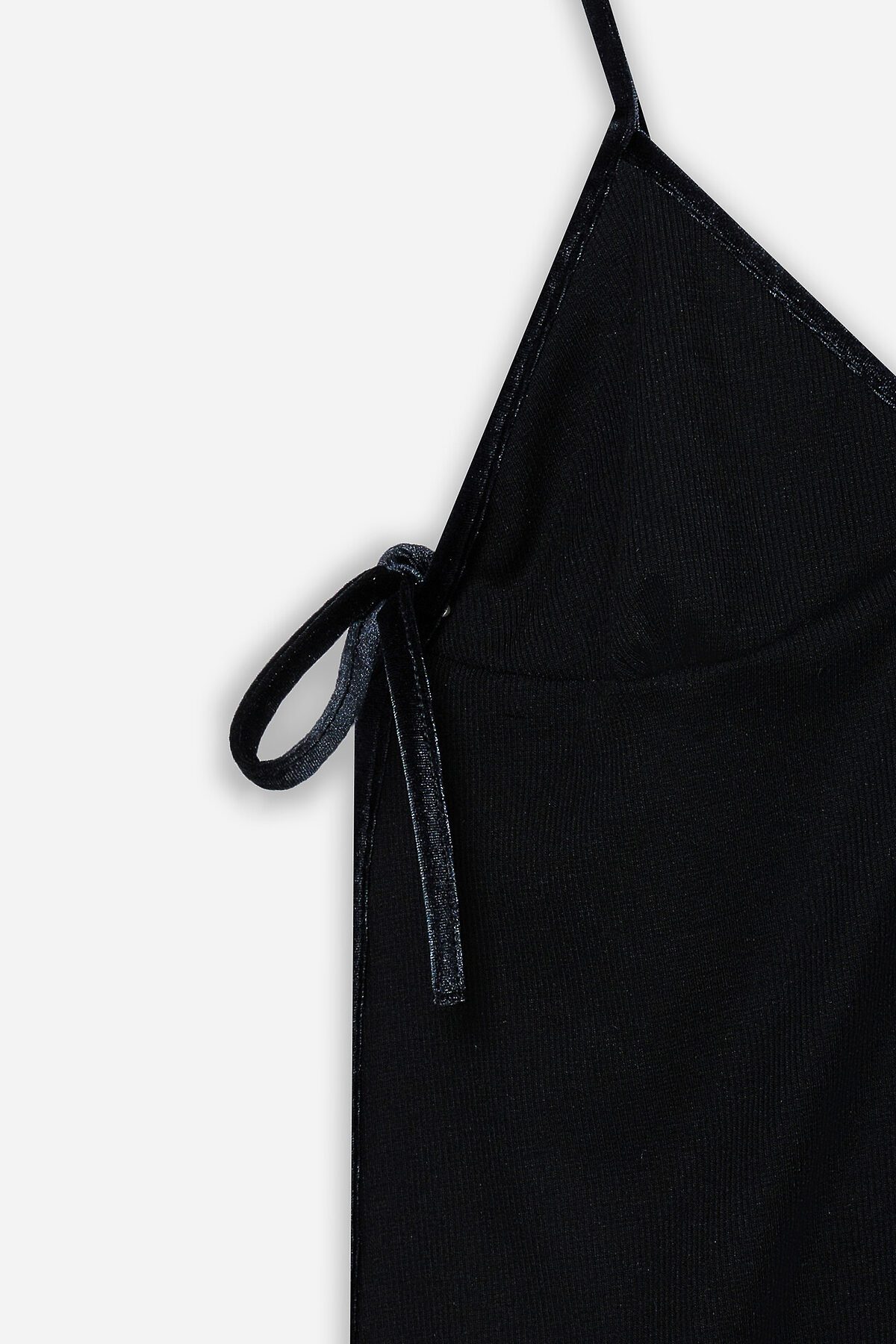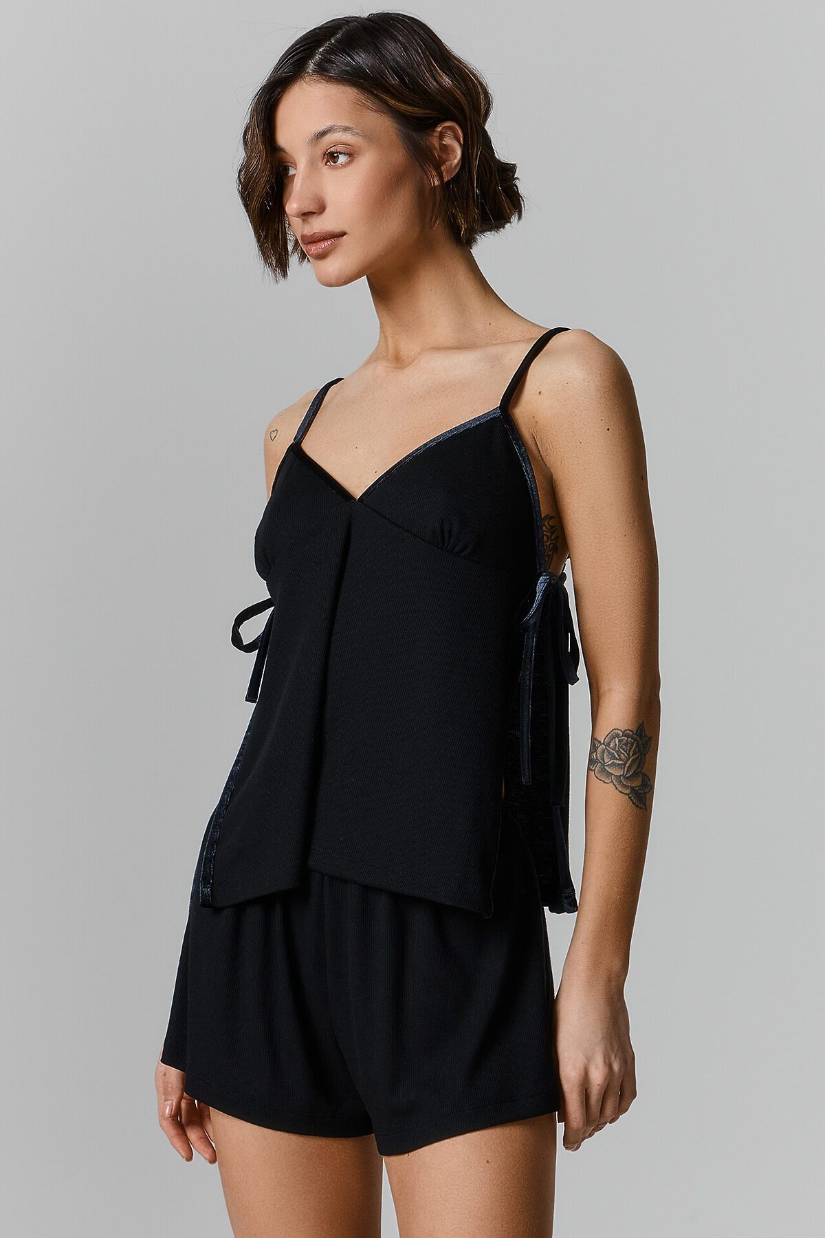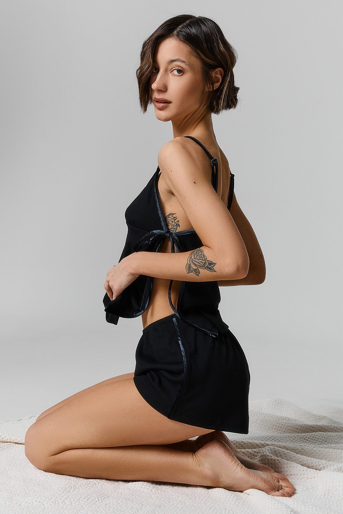 Комплект состоит из блузы и шорт. Блуза прямая свободня, на бретелях. Горловина V-образной формы. По переду подрез под грудью. Лиф на подкладке из основного полотна. Горловина переда и спинки, проймы, боковые швы, окантованы бейками из велюра. Бейки по проймам переходят в бретели с регулировкой на металлические регуляторы (AL-810E) и кольца, шириной 10мм. По бокам завязки из велюра. Нижний срез блузы обработан швом вподгибку. Шорты свободного силуэта, посадка средняя. Пояс цельнокроеный с эластичной тесьмой внутри (внутр. 10мм 10RV). В боковых швах канты из велюра. Нижний срез шорт обработан швом вподгибку.