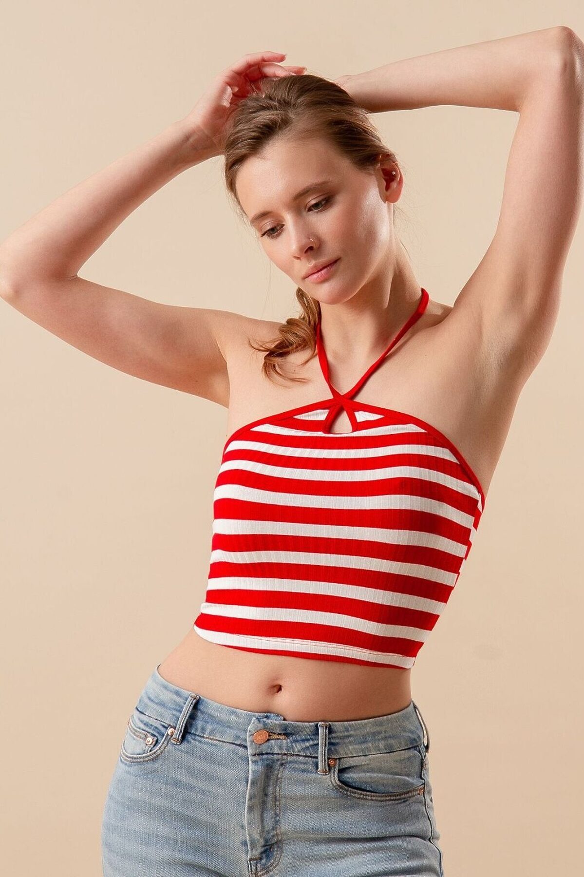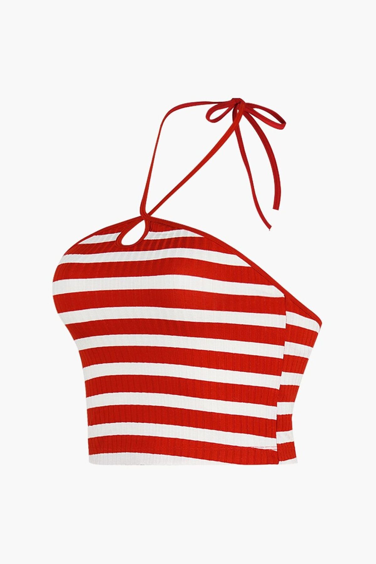 Топ выполнен из вискозы в тонкий рубчик, красно-белого цвета в полоску, без рукавов с регулируемыми завязками, укороченный.